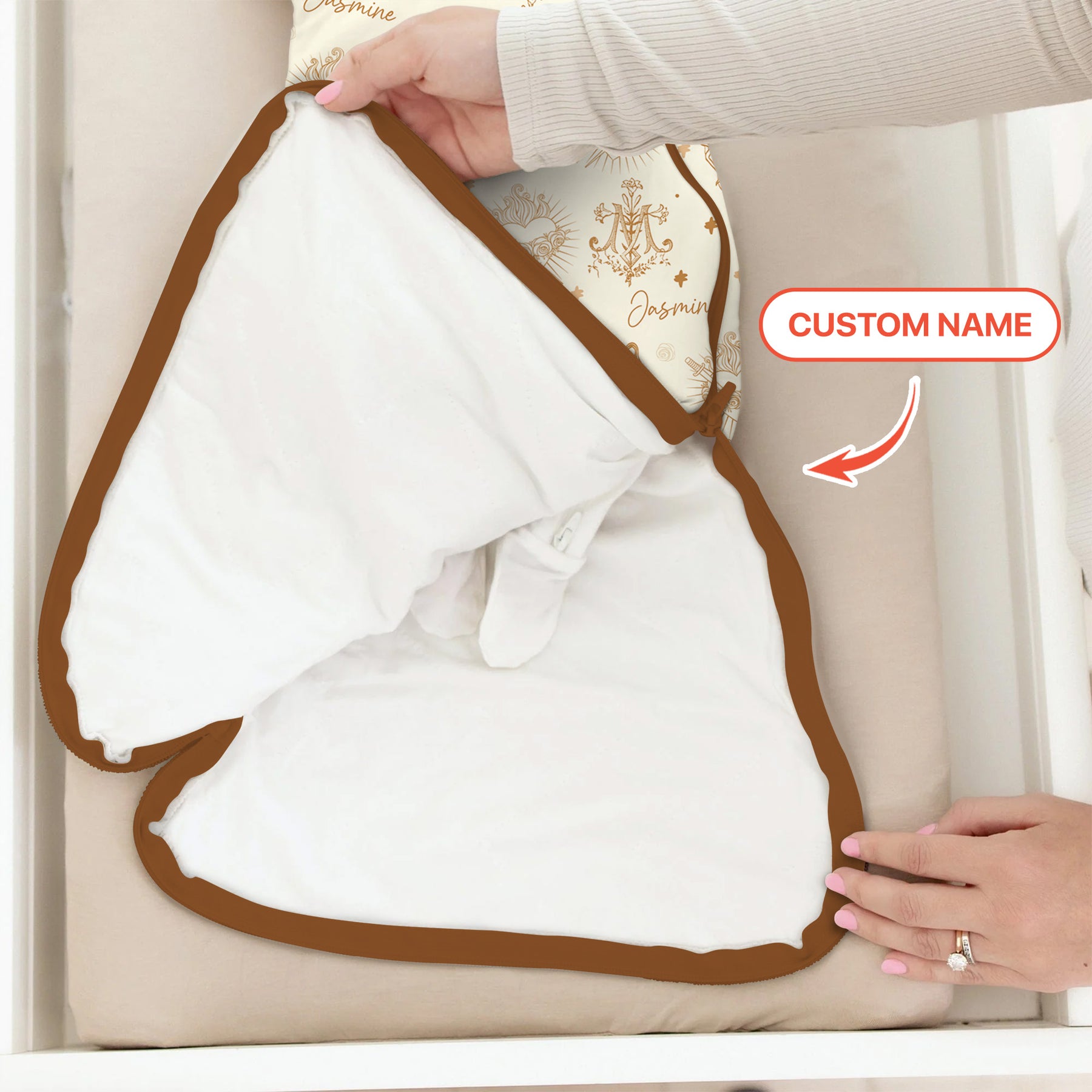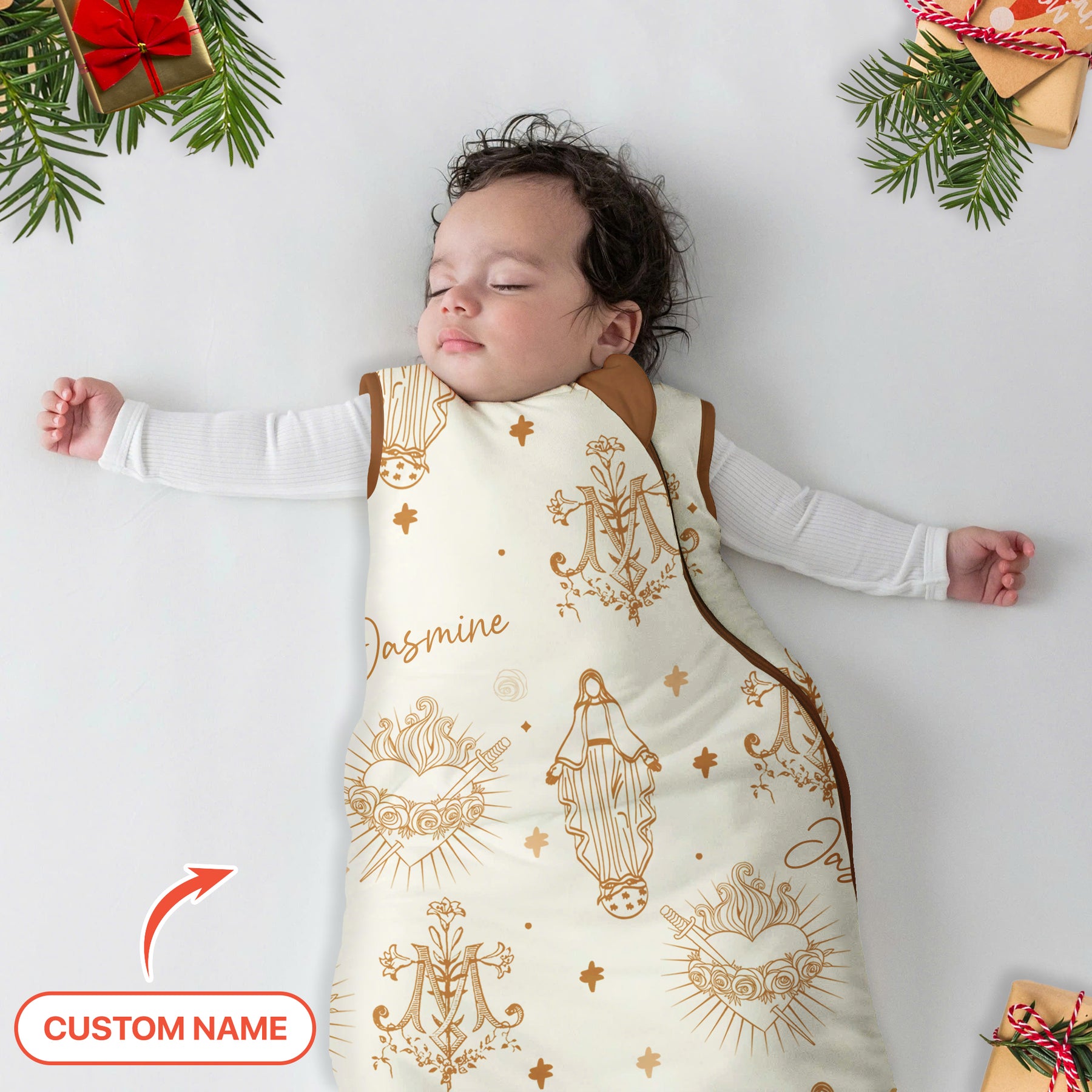 A serene, faith-inspired artwork featuring Our Lady and the Sacred Heart in soft neutral tones, symbolizing divine protection and unconditional love. Designed to wrap your little one in grace, comfort, and timeless spiritual beauty.