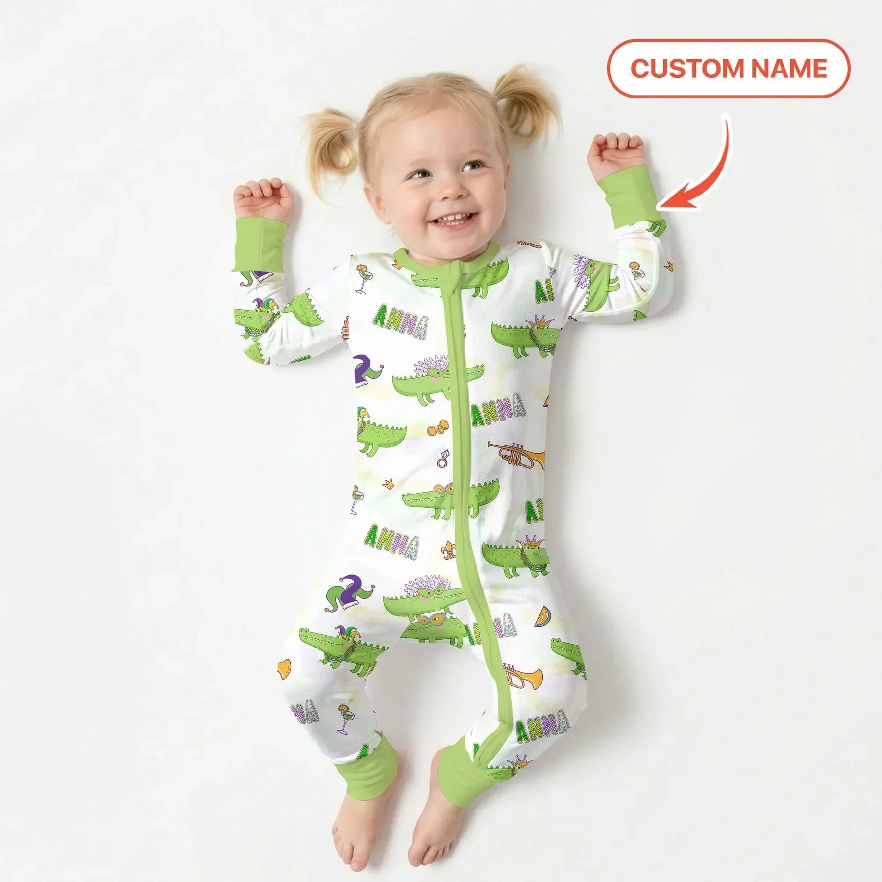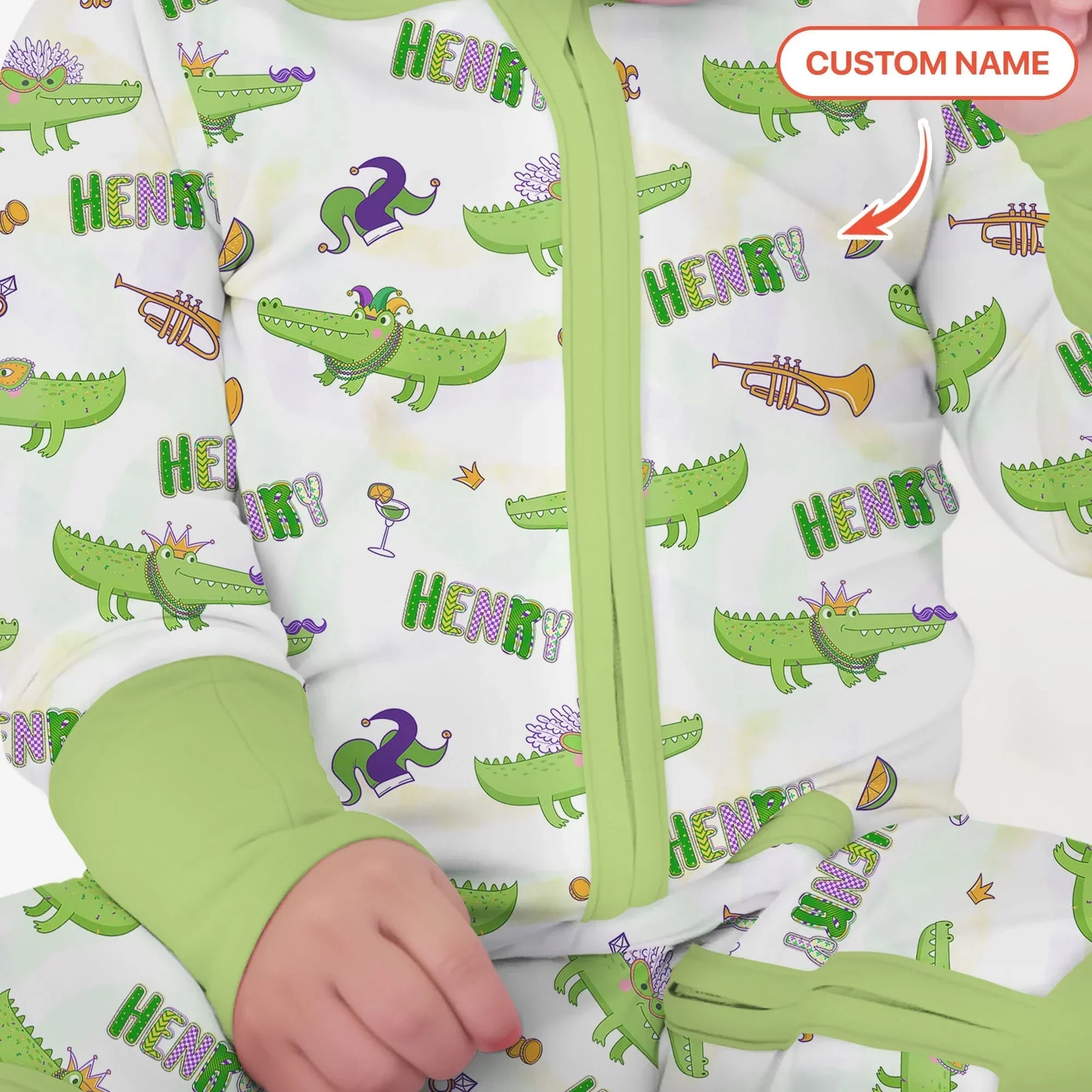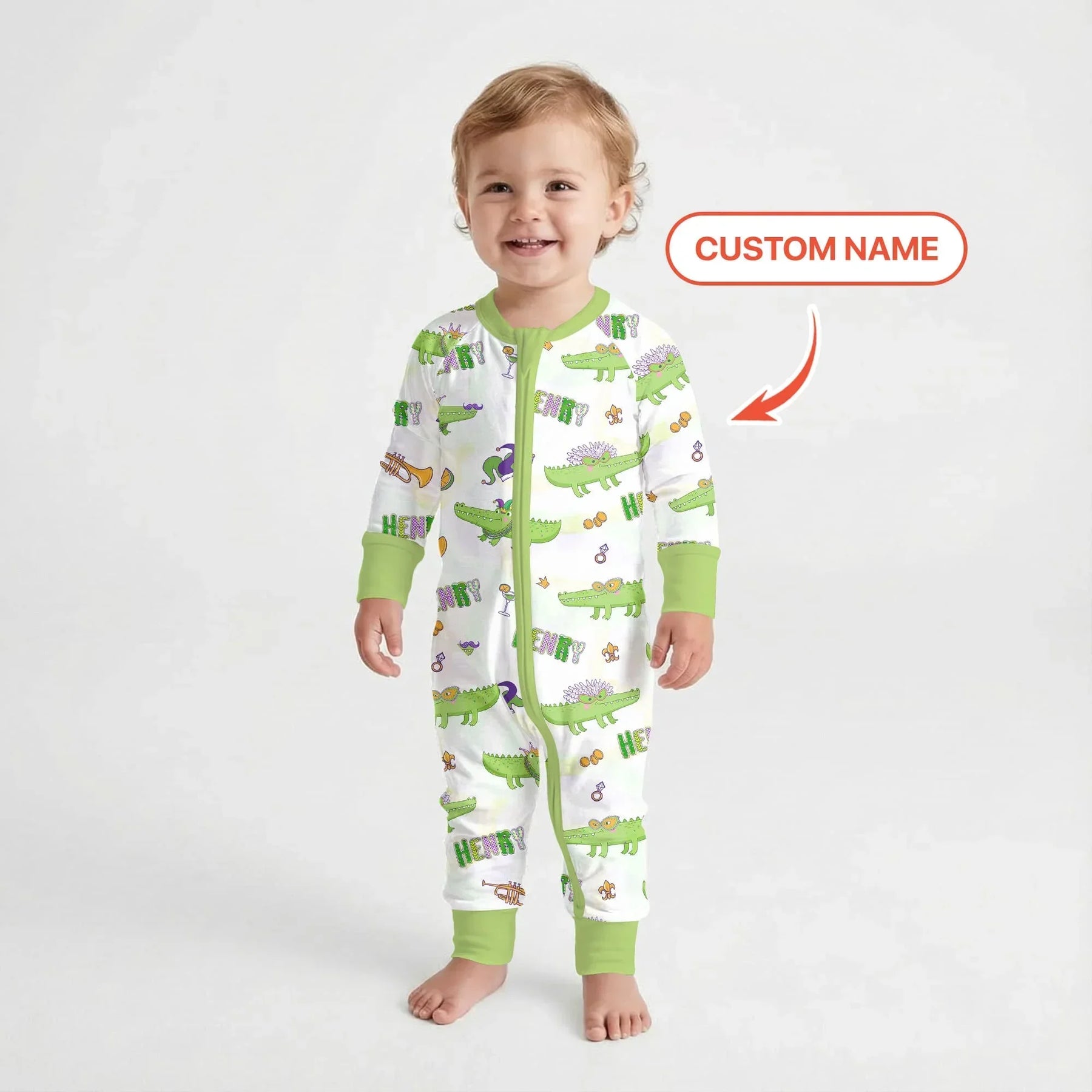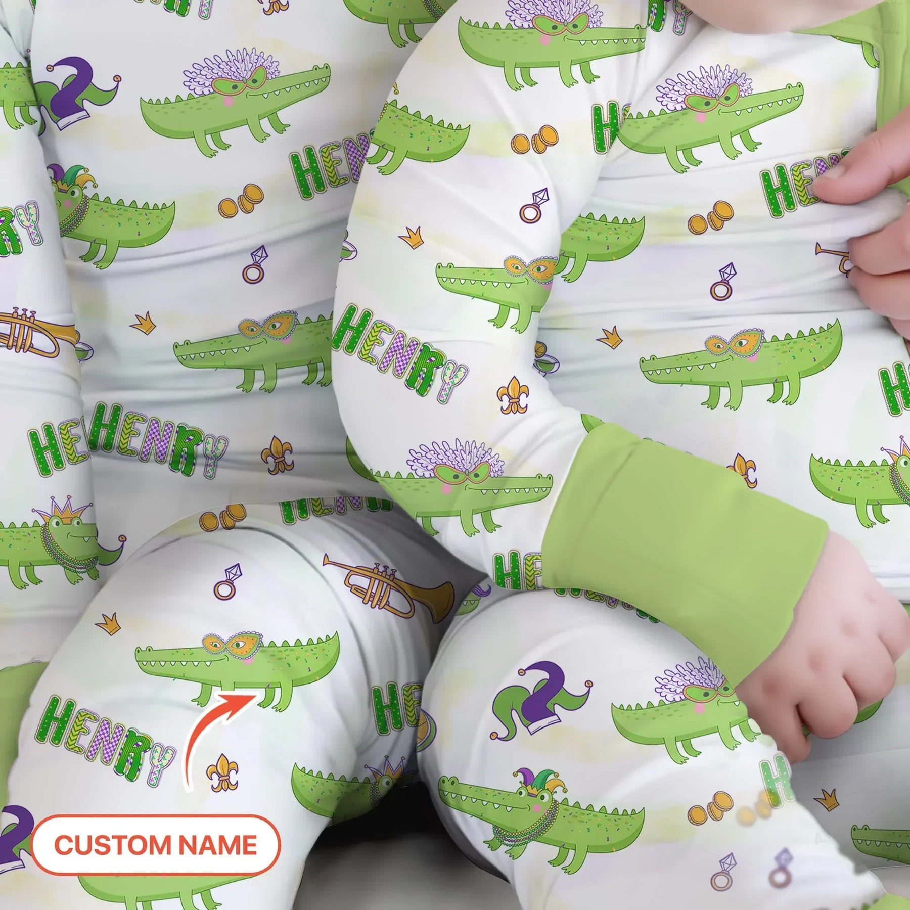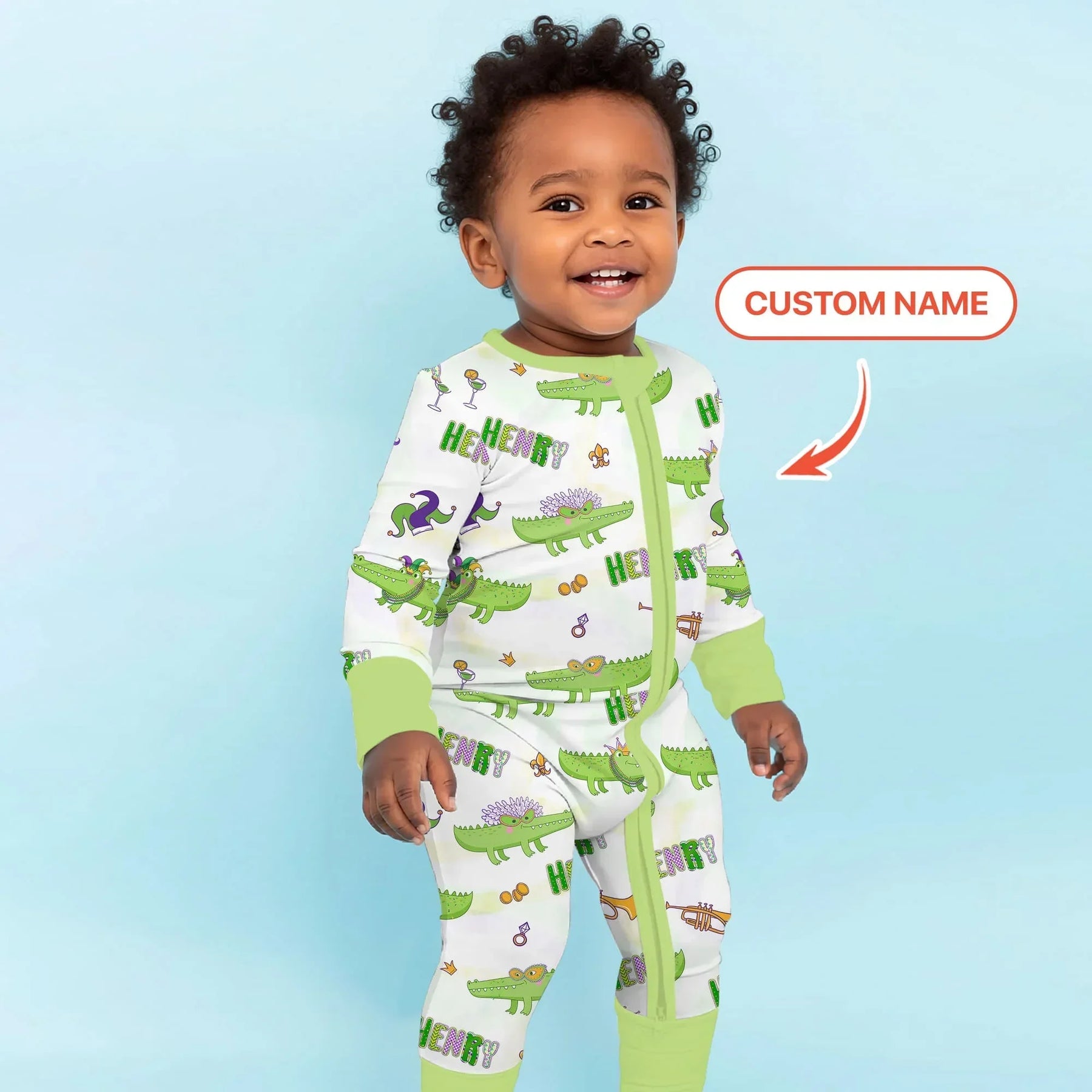 A playful Mardi Gras–inspired collection featuring festive alligators, vibrant carnival icons, and optional custom names, crafted in soft, breathable fabrics for baby and kids sleepwear, loungewear, and everyday essentials.