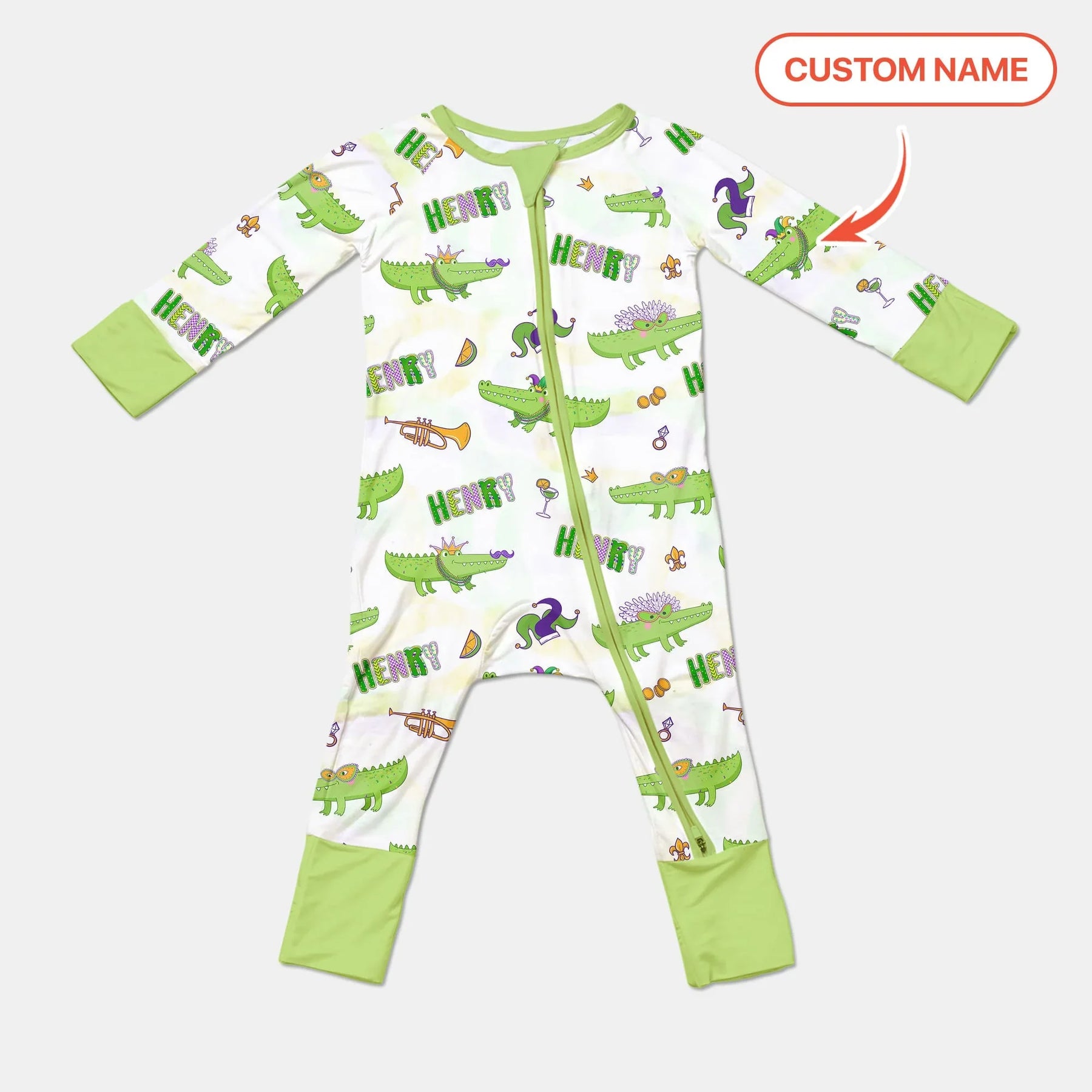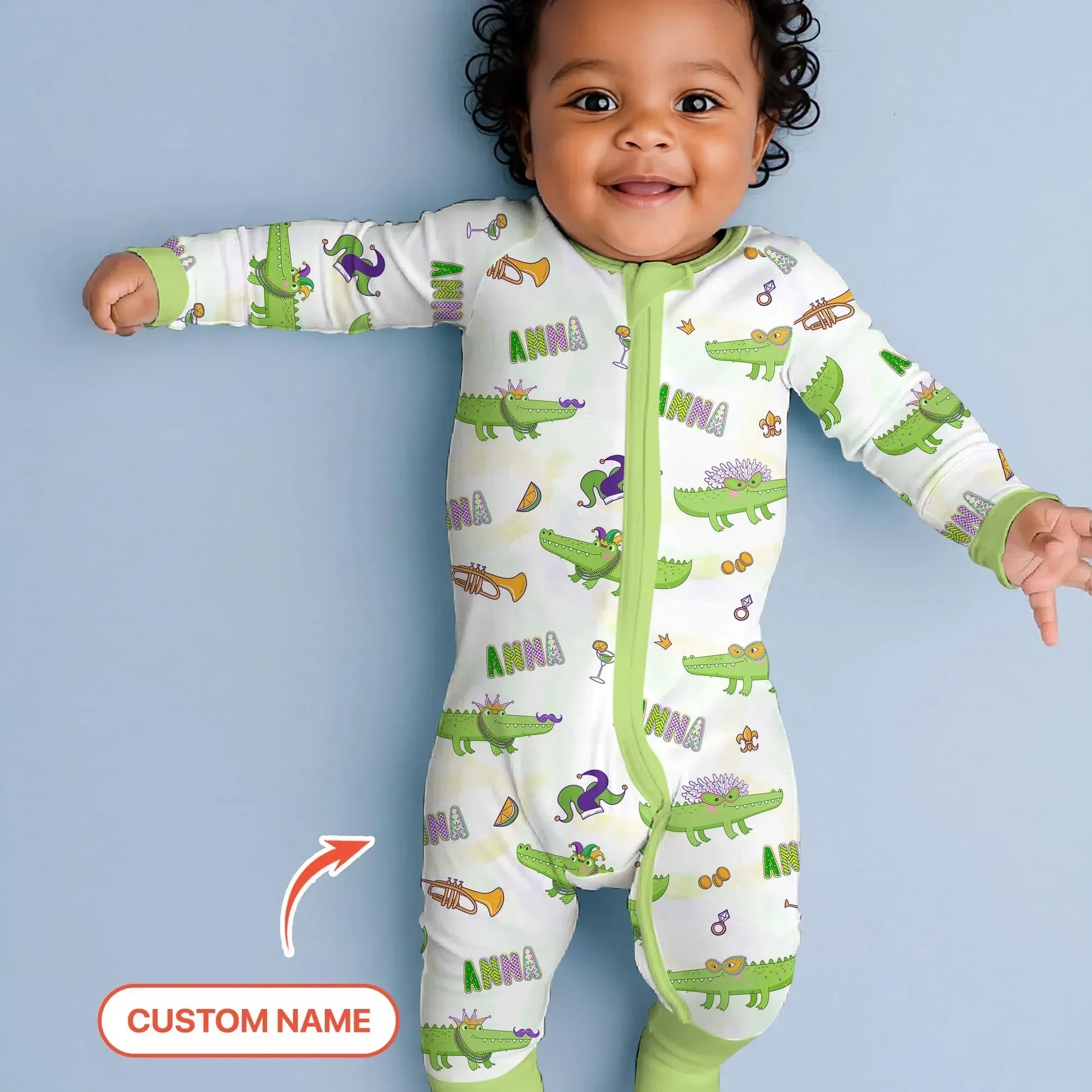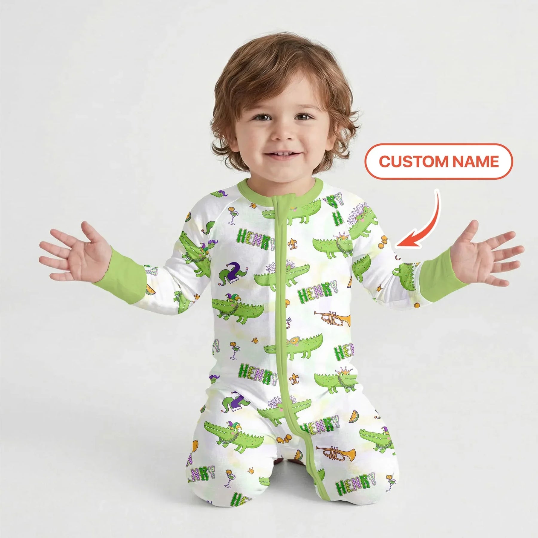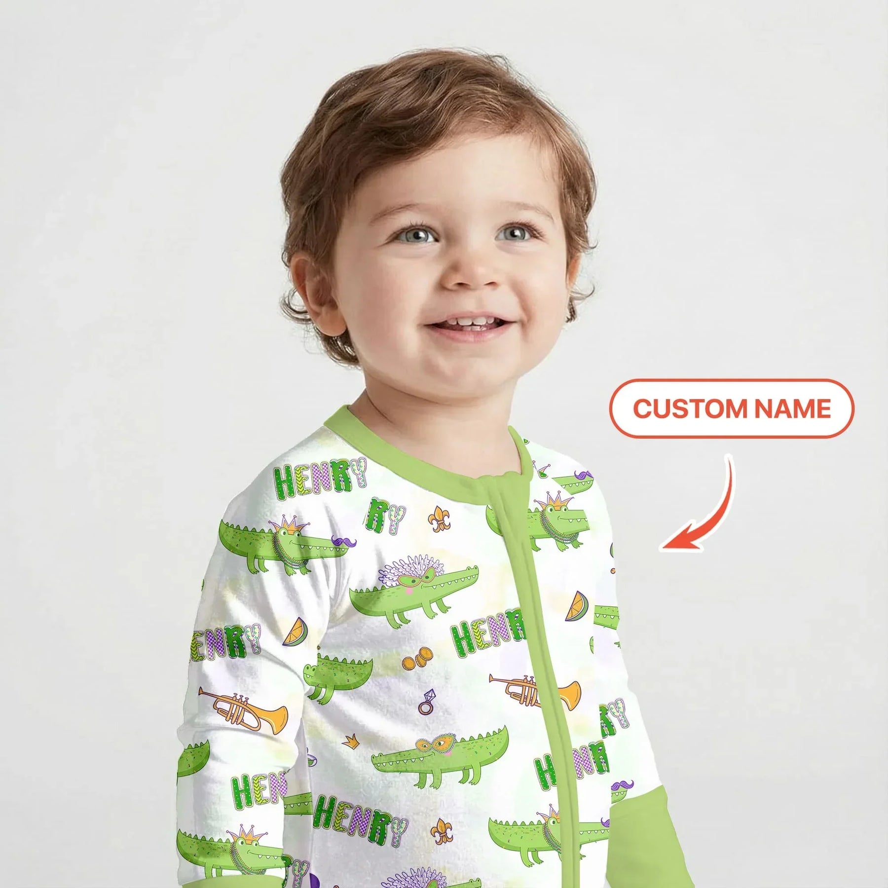 A playful Mardi Gras–inspired collection featuring festive alligators, vibrant carnival icons, and optional custom names, crafted in soft, breathable fabrics for baby and kids sleepwear, loungewear, and everyday essentials.