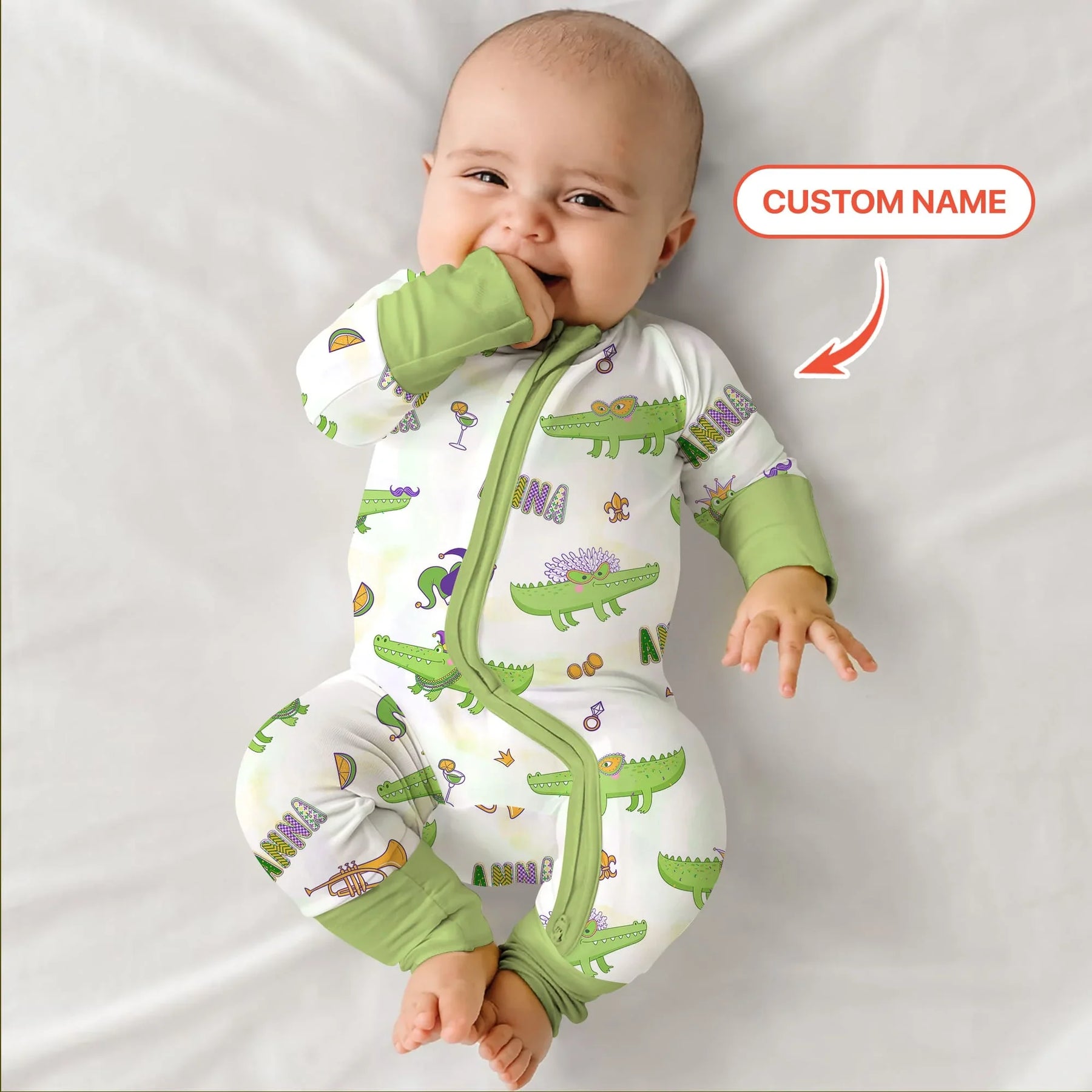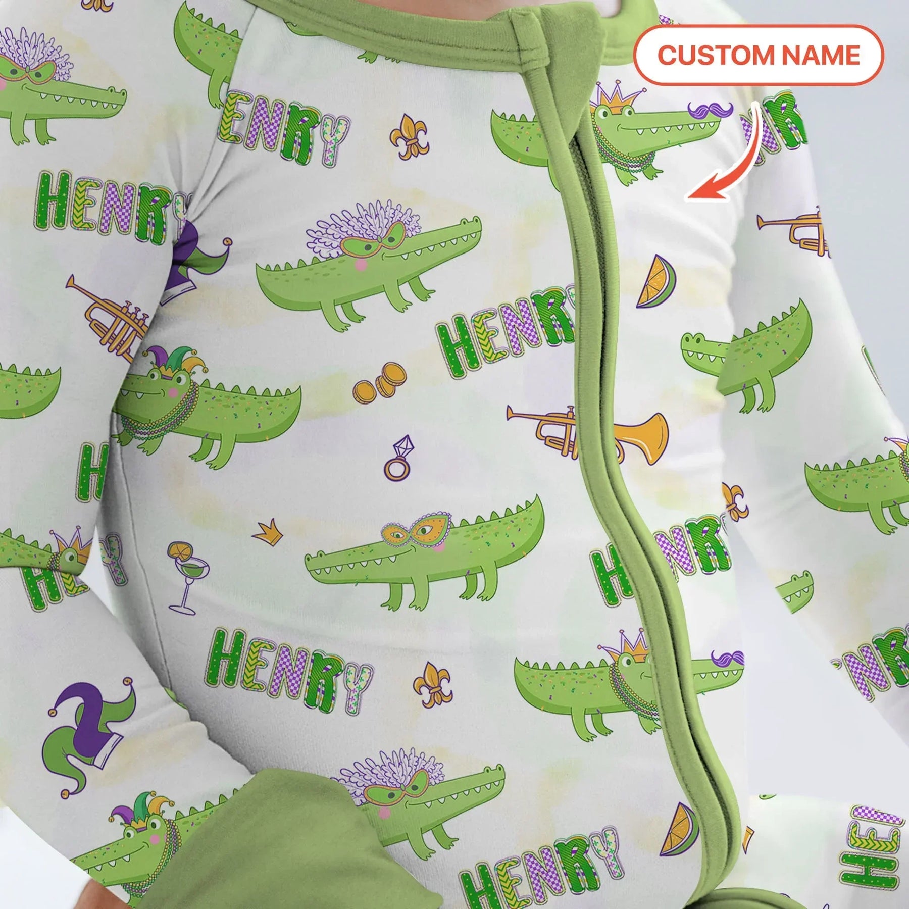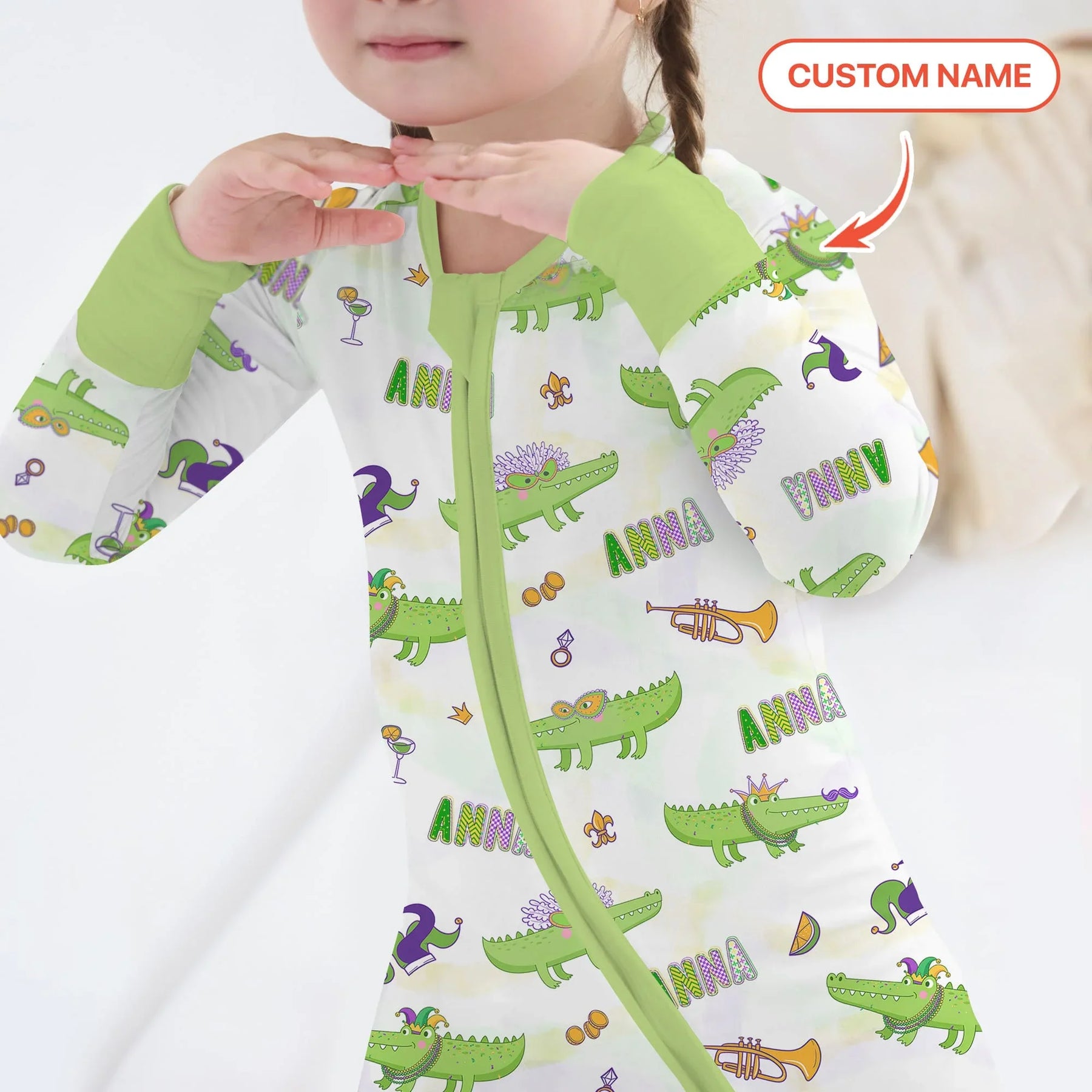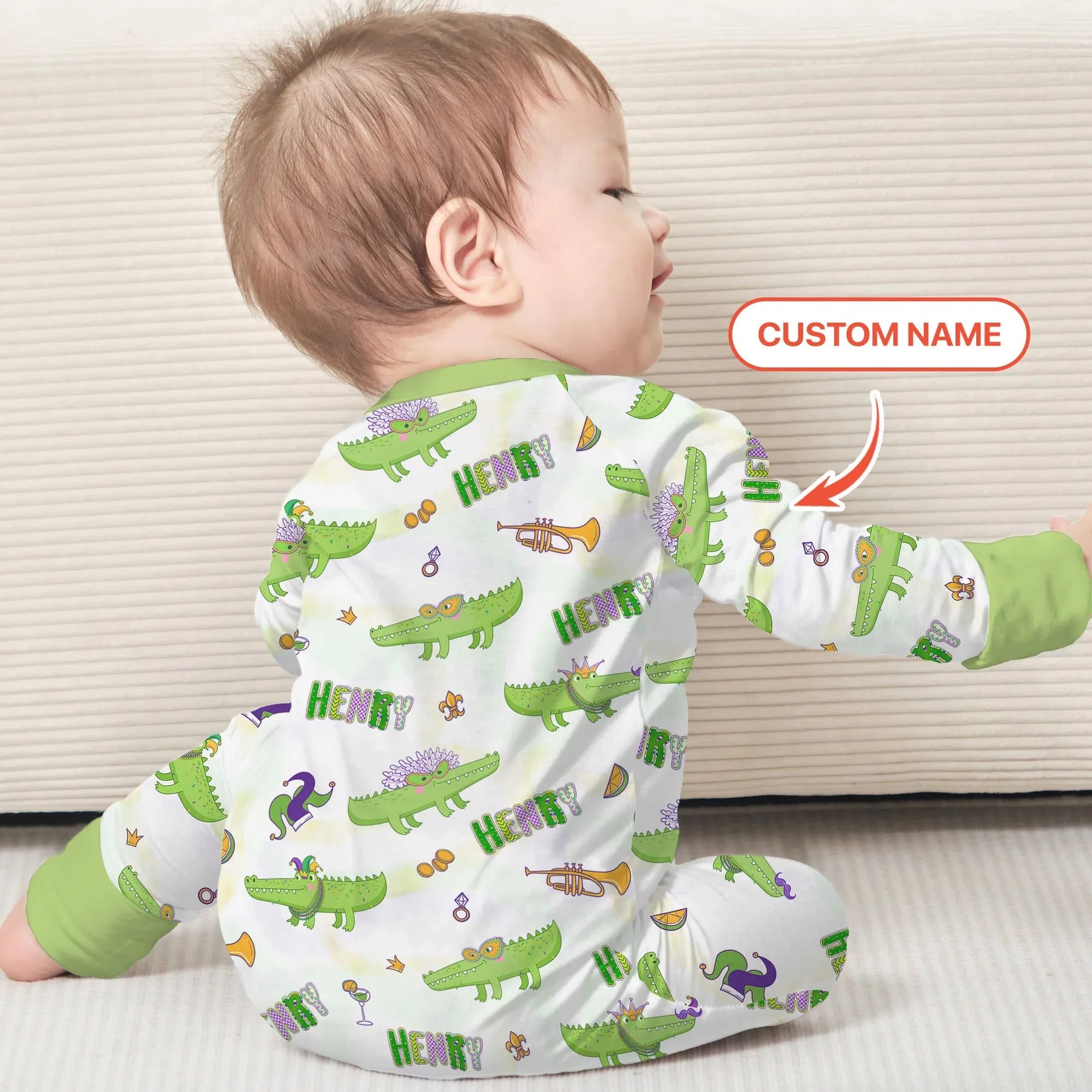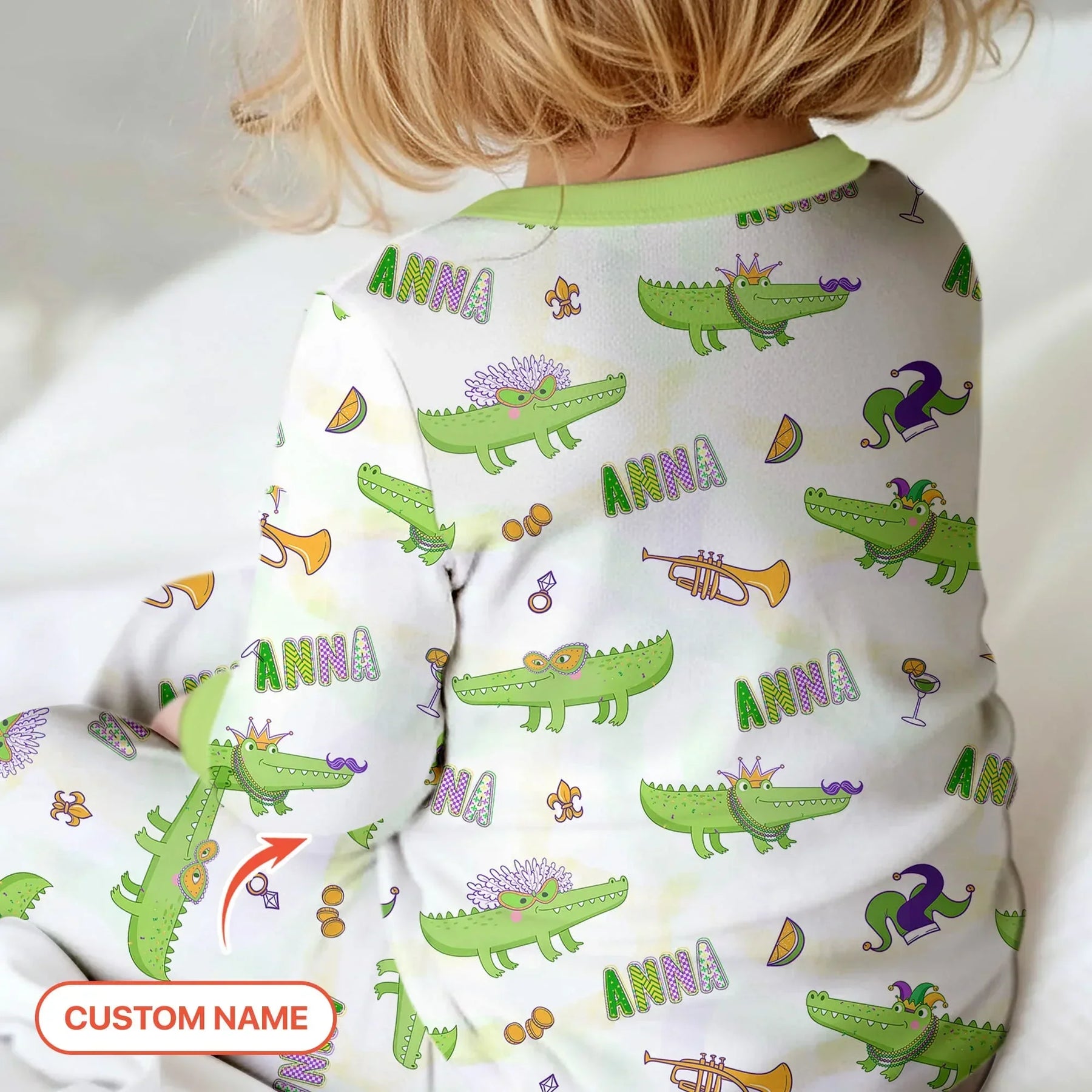 A playful Mardi Gras–inspired collection featuring festive alligators, vibrant carnival icons, and optional custom names, crafted in soft, breathable fabrics for baby and kids sleepwear, loungewear, and everyday essentials.