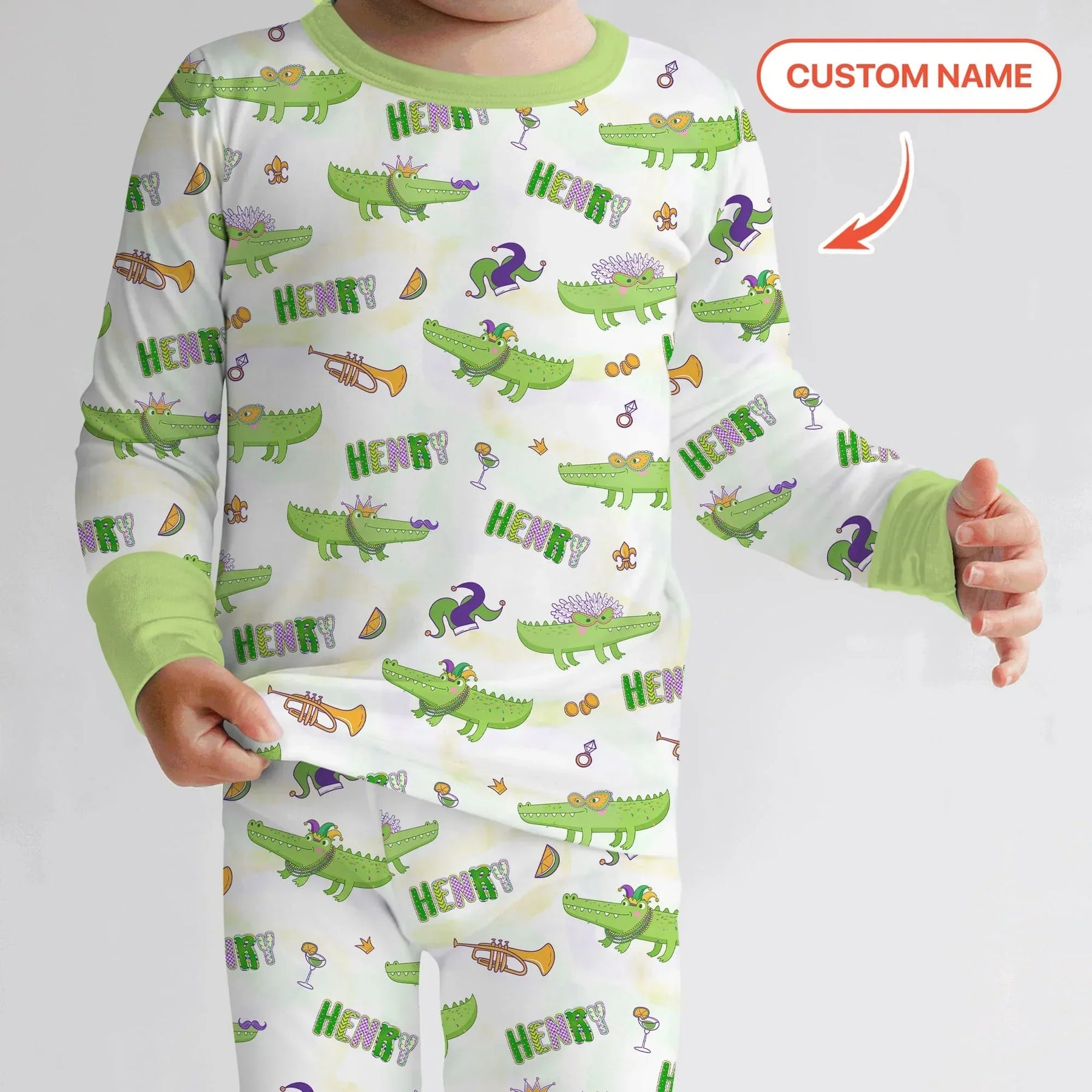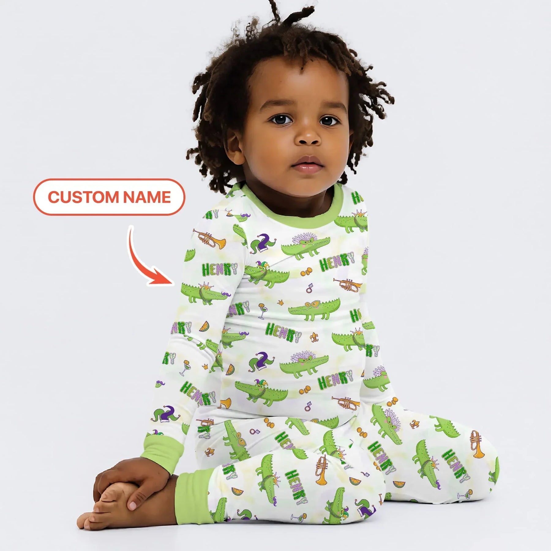 A playful Mardi Gras–inspired collection featuring festive alligators, vibrant carnival icons, and optional custom names, crafted in soft, breathable fabrics for baby and kids sleepwear, loungewear, and everyday essentials.