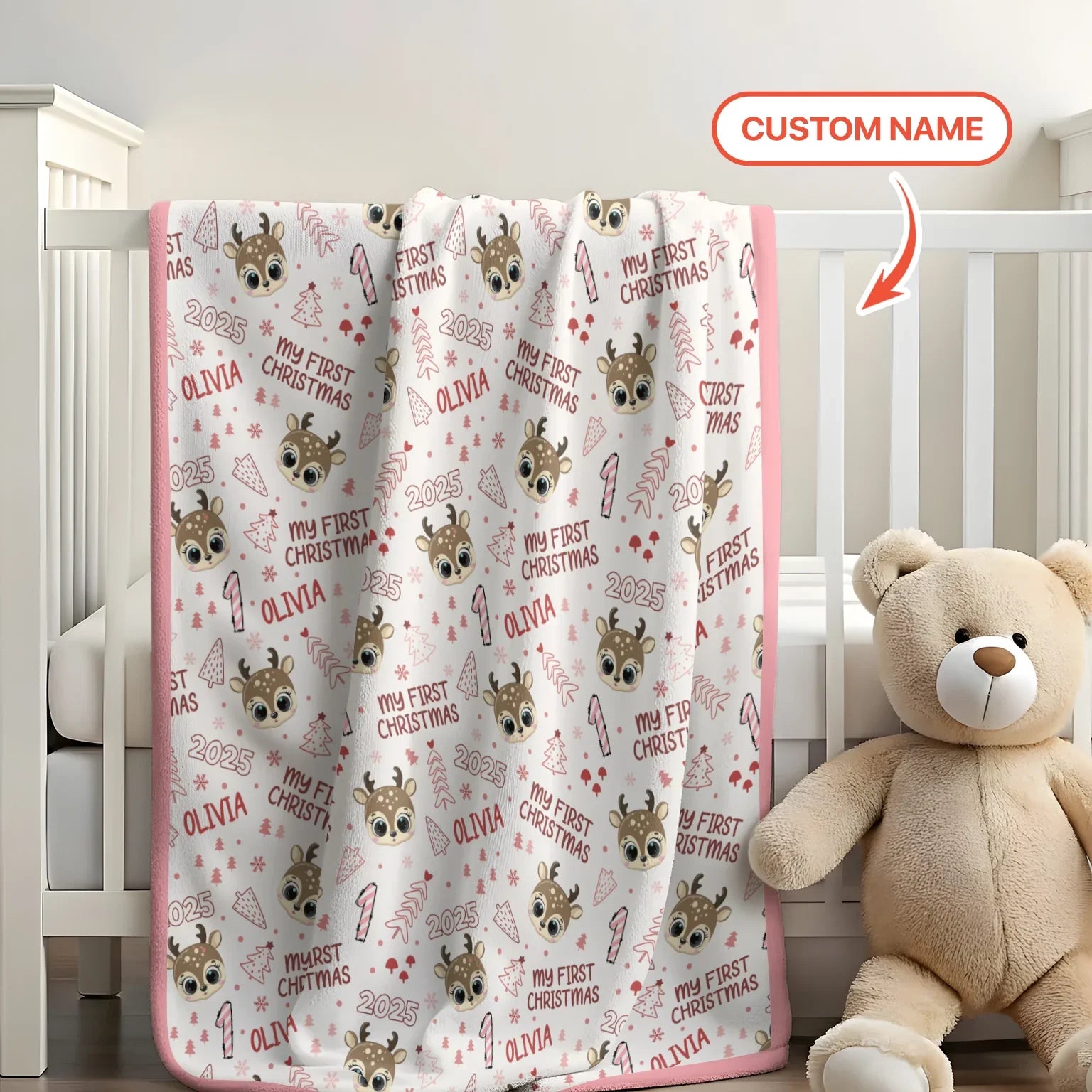 Custom Name Cute Reindeer My First Christmas Baby Blanket