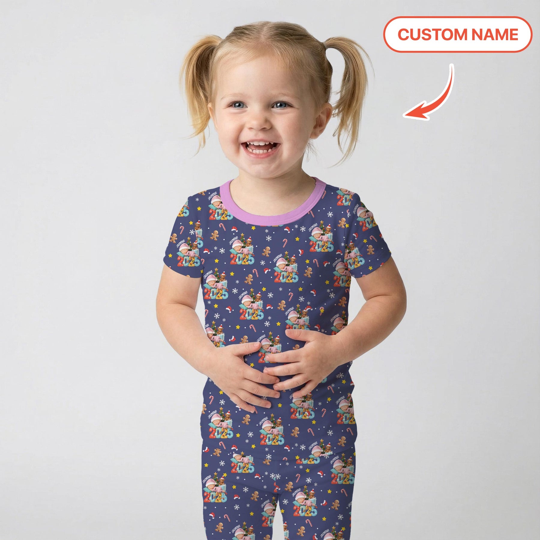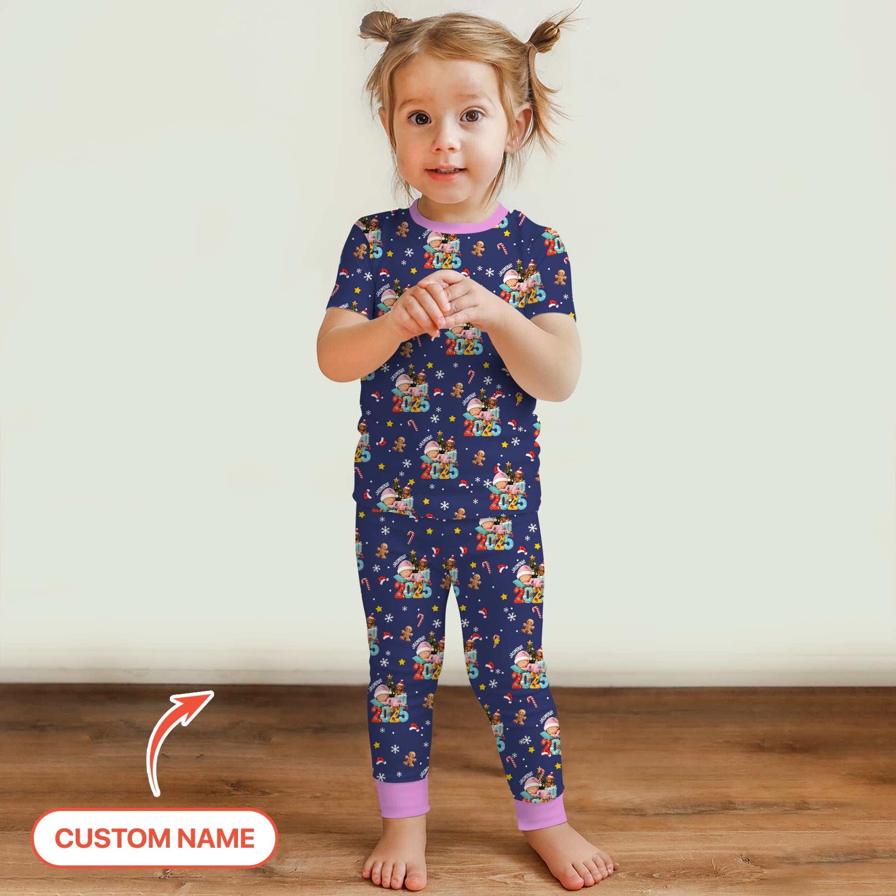 This festive one-piece features a cheerful all-over Christmas print with a cozy baby illustration, holiday icons, and colorful “2025” details on a deep navy background, with the option to customize names or details for a more personal touch, and is finished with soft pink trim for a sweet, playful look. Crafted from soft bamboo viscose, this set is gentle on sensitive skin and offers breathable comfort in any season. The extra length ensures it fits longer, making bedtime routines even more enjoyable.