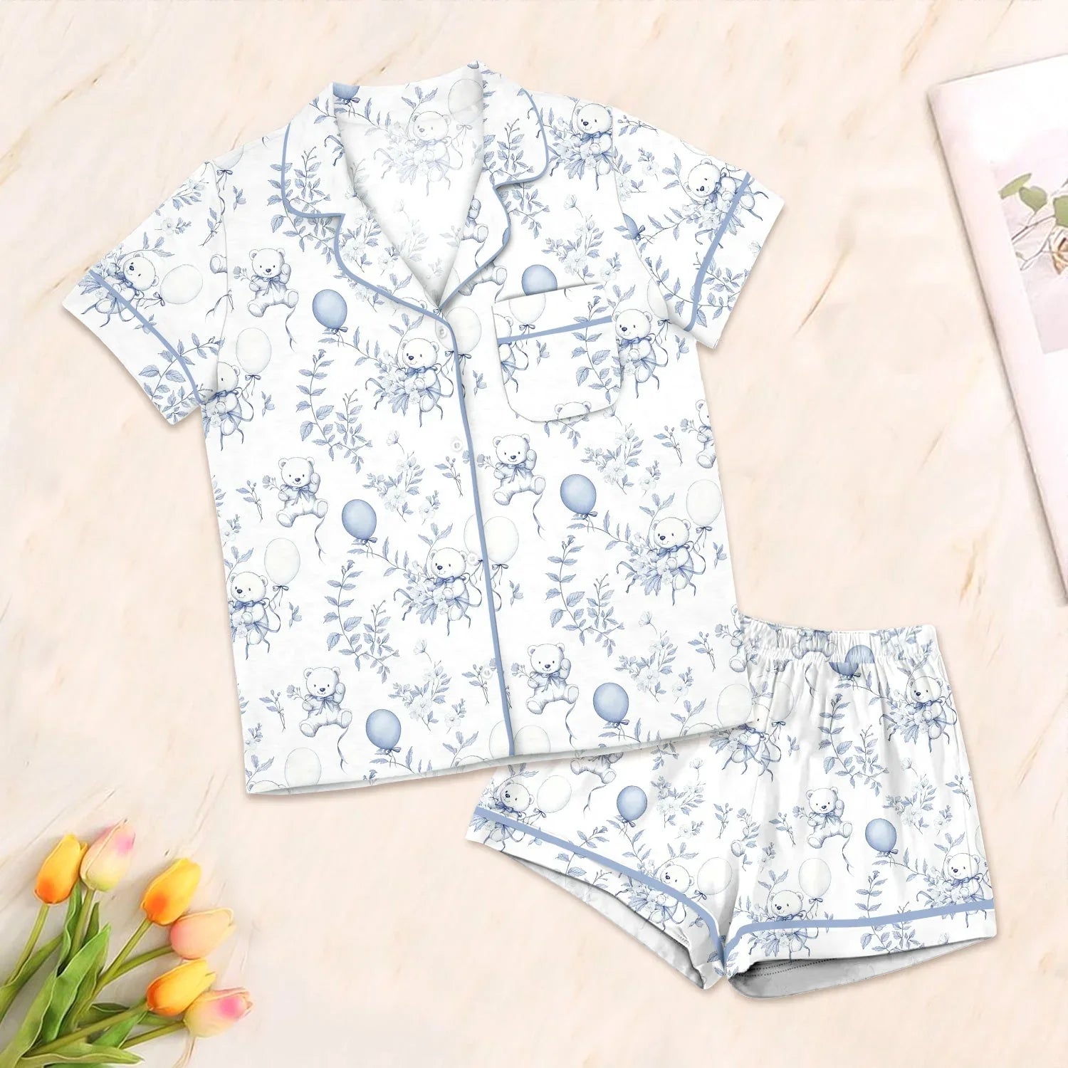Blue Bear Toile de jouy Button Down Two Piece Short Sleeve Shorts Pajama Set