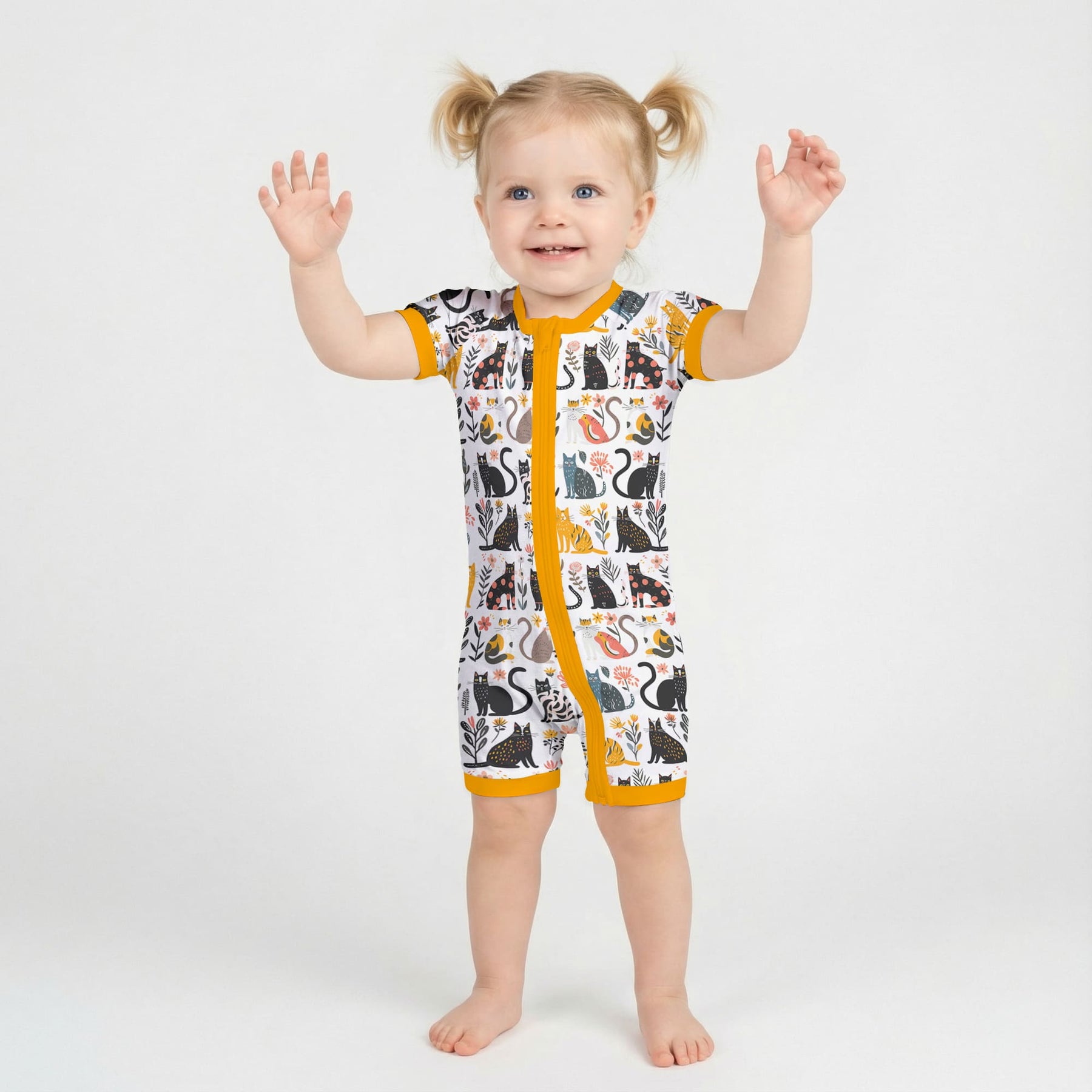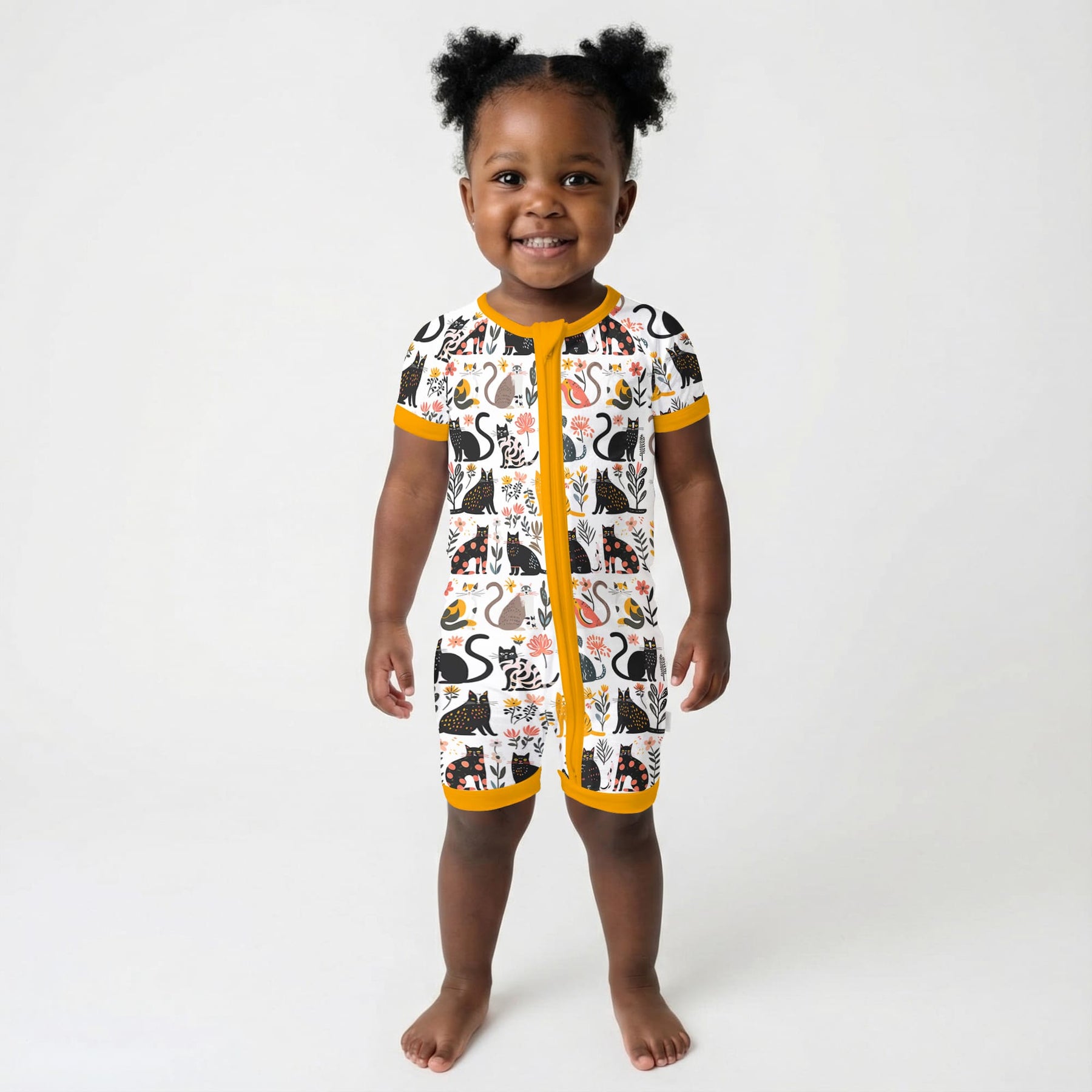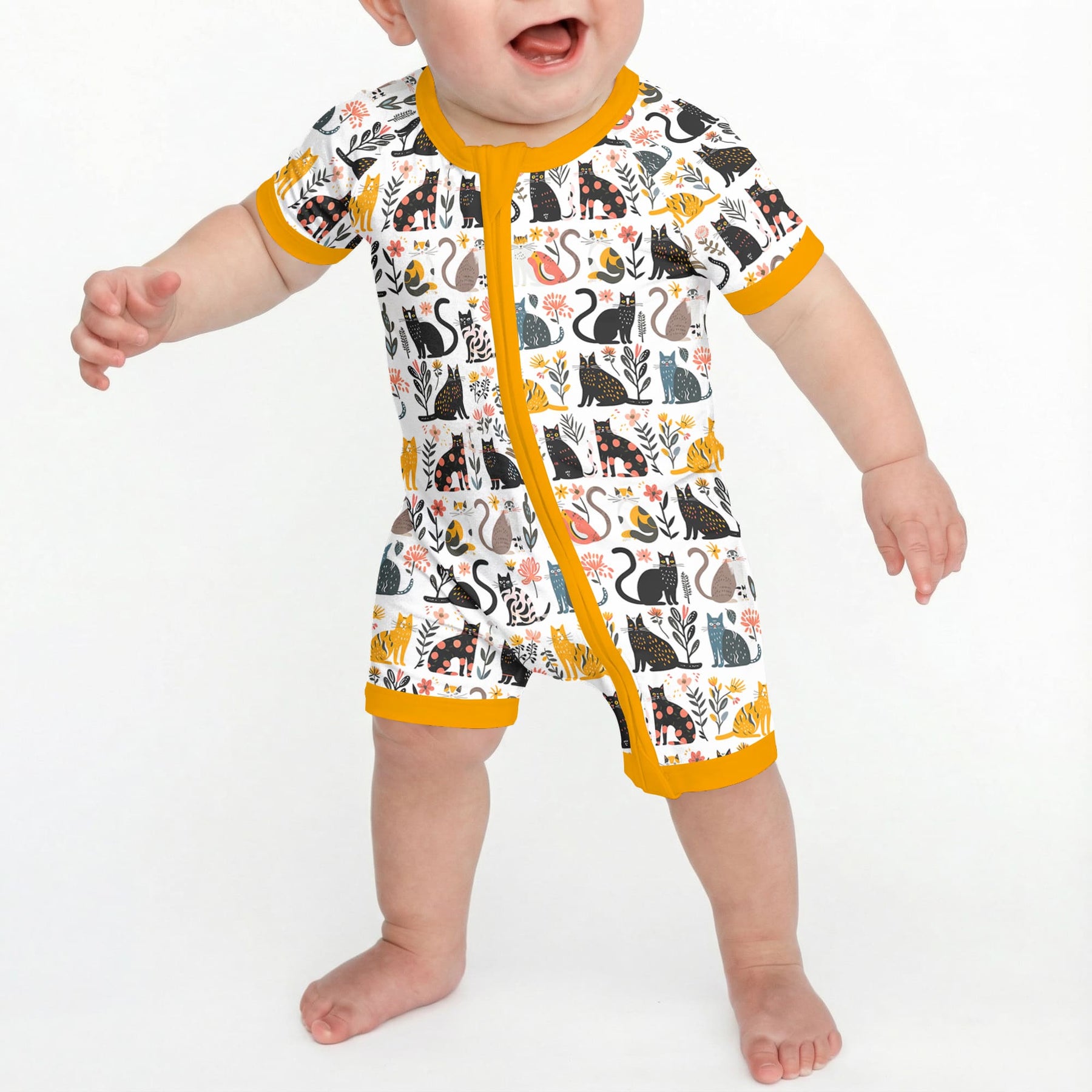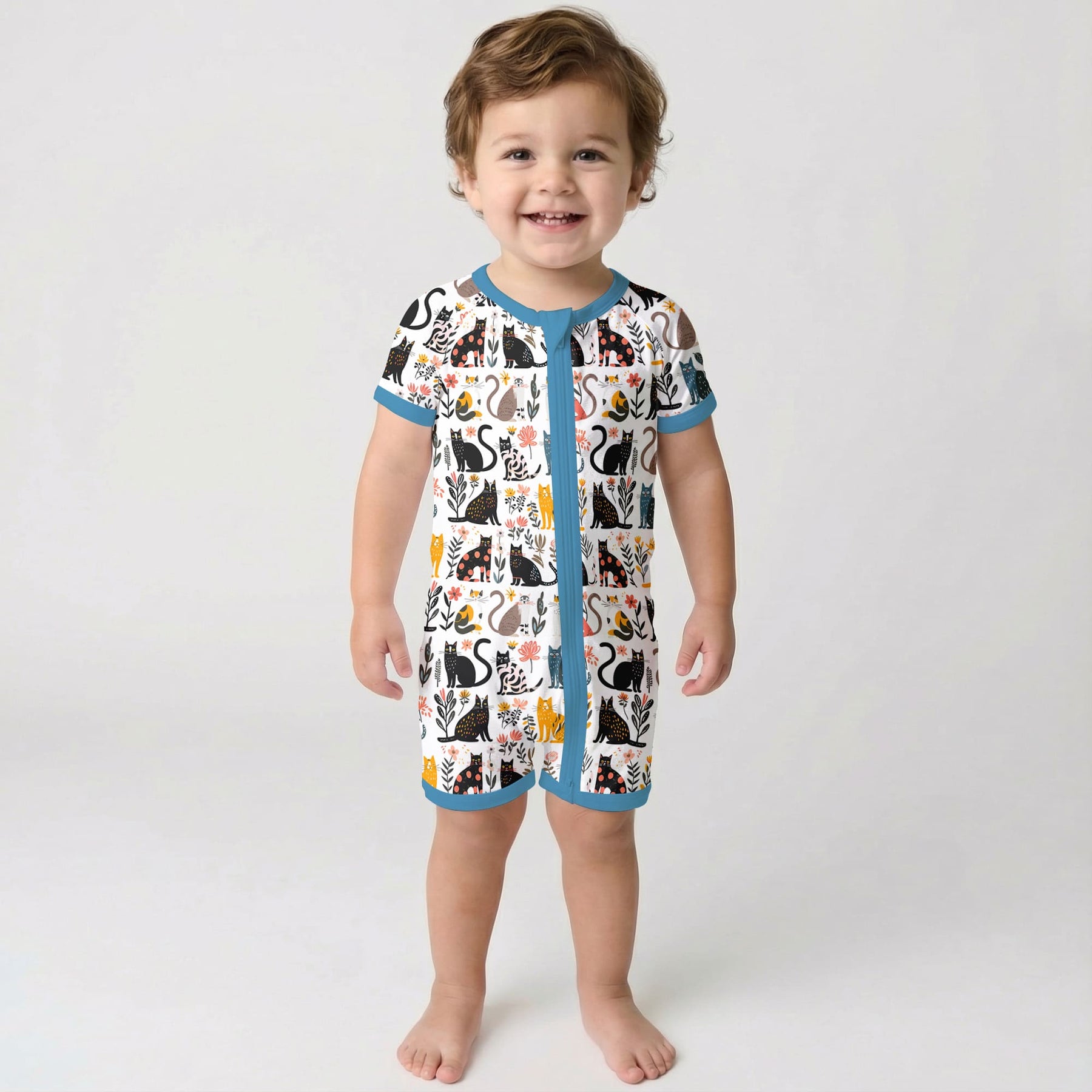 Playful folk-art style artwork featuring whimsical cats in varied poses, patterns, and colors, surrounded by hand-drawn florals and leaves. The repeating layout and warm, earthy palette create a cozy, cheerful feel—perfectly balanced between charming, modern, and storybook-like.