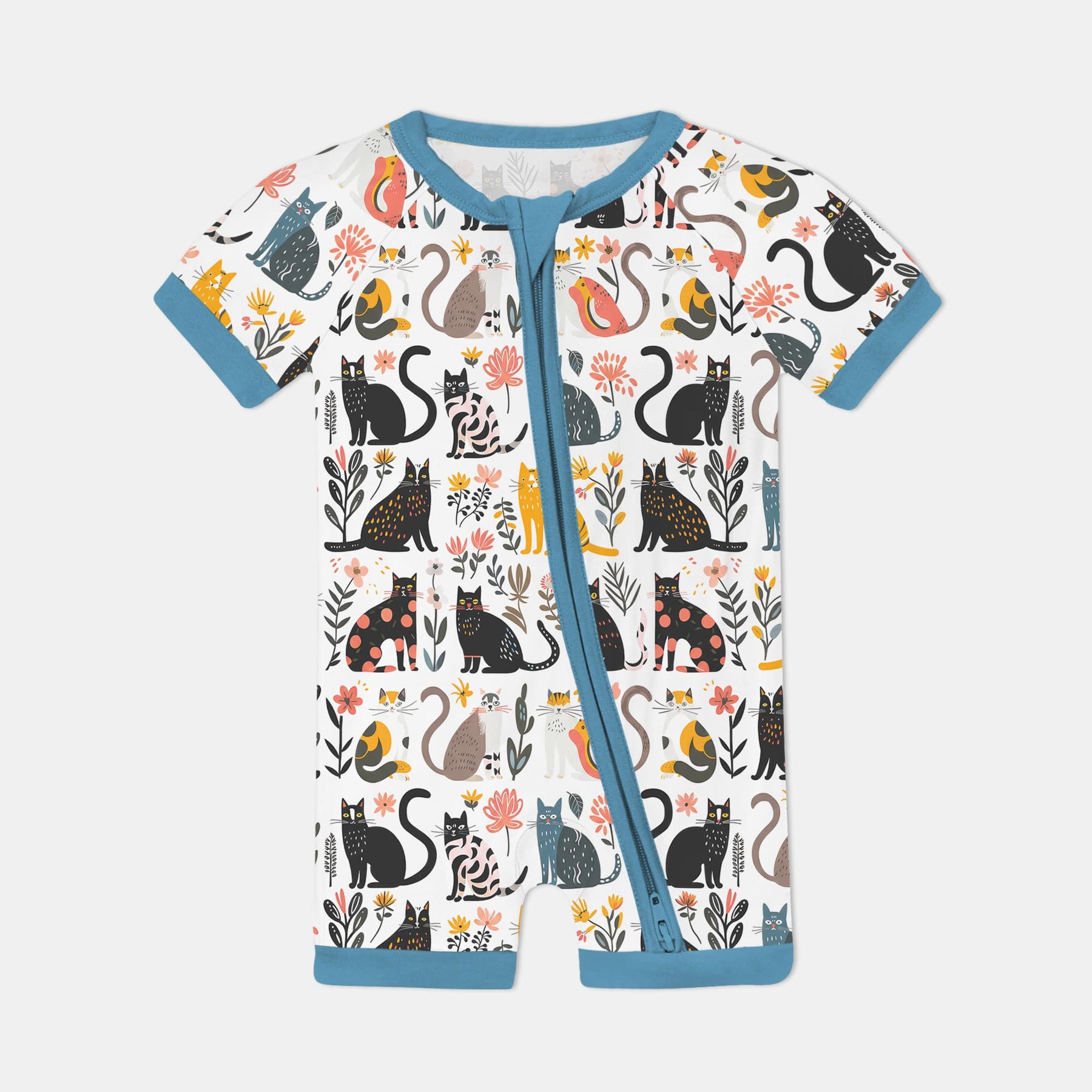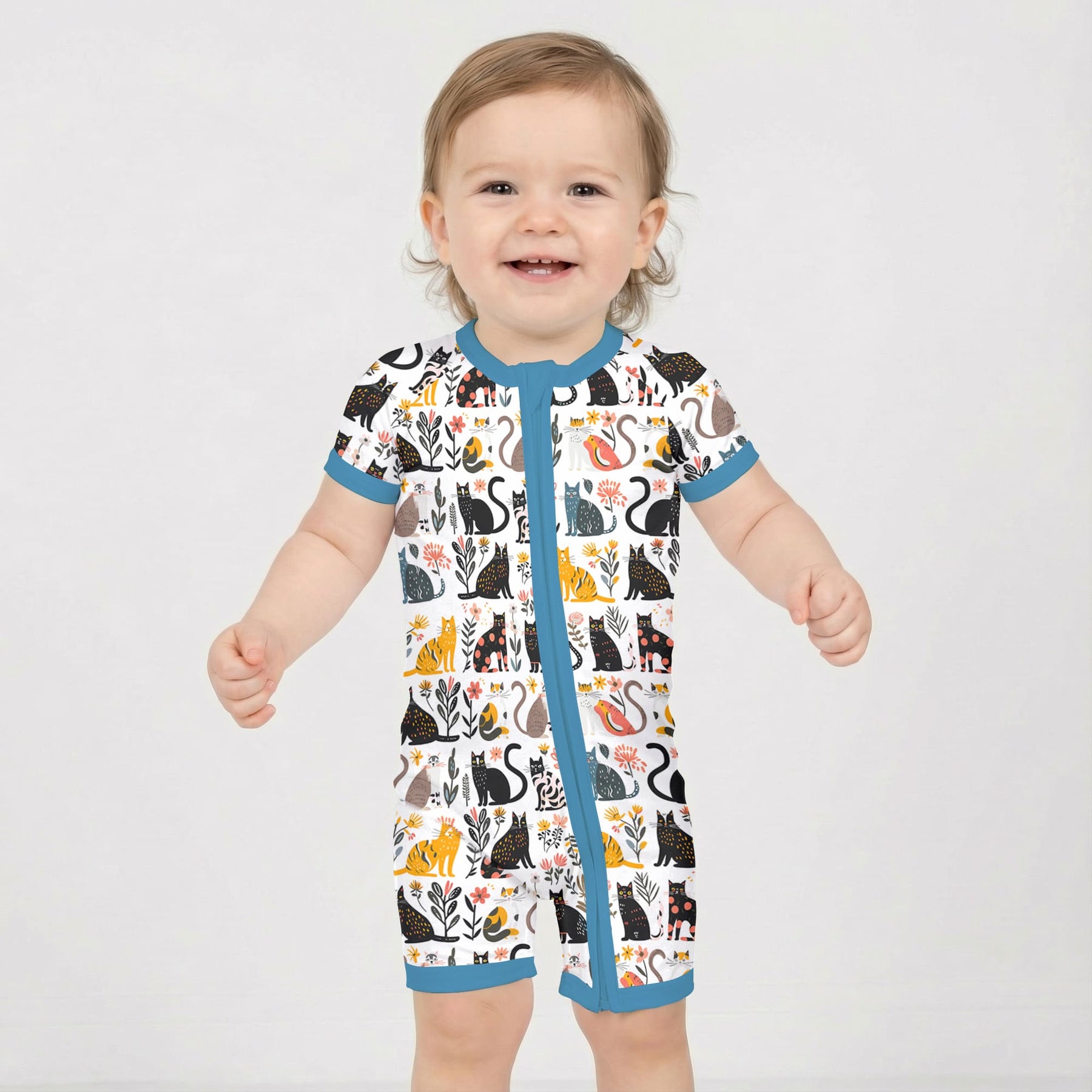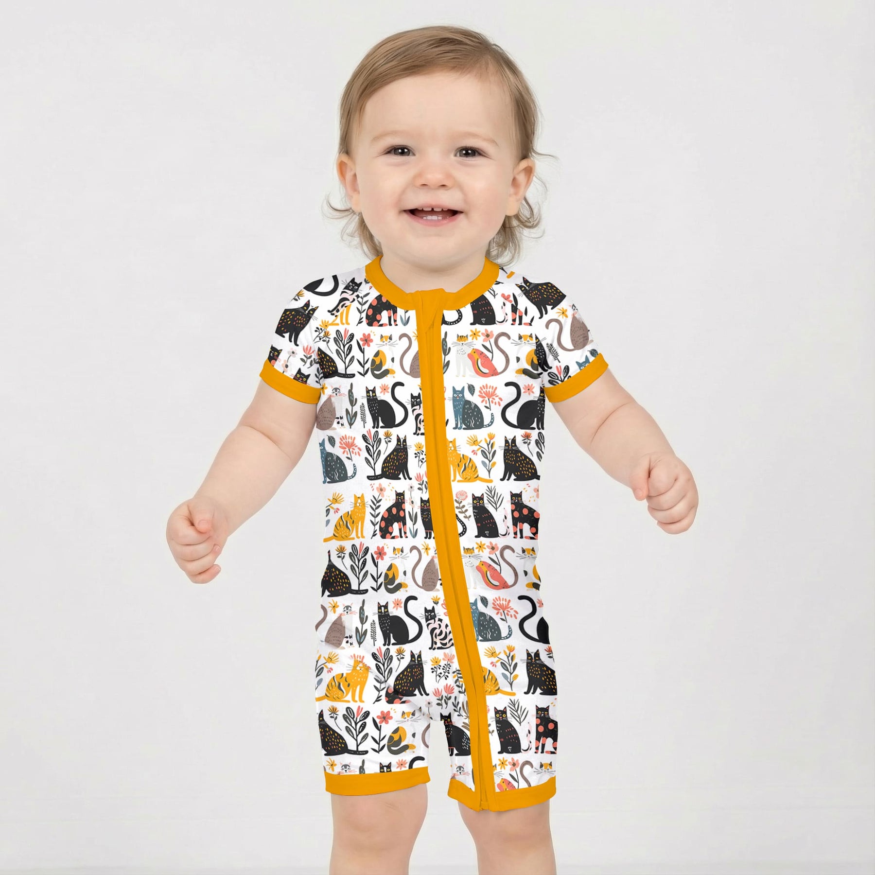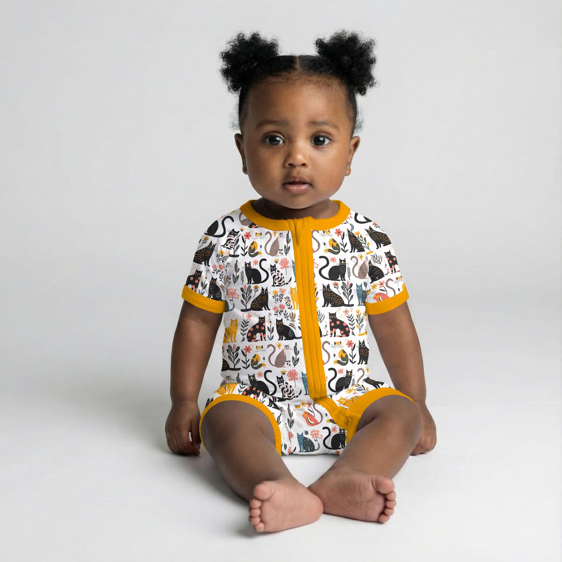 Playful folk-art style artwork featuring whimsical cats in varied poses, patterns, and colors, surrounded by hand-drawn florals and leaves. The repeating layout and warm, earthy palette create a cozy, cheerful feel—perfectly balanced between charming, modern, and storybook-like.