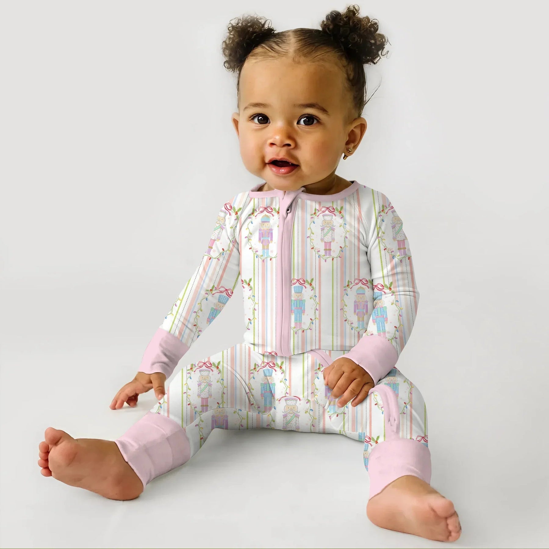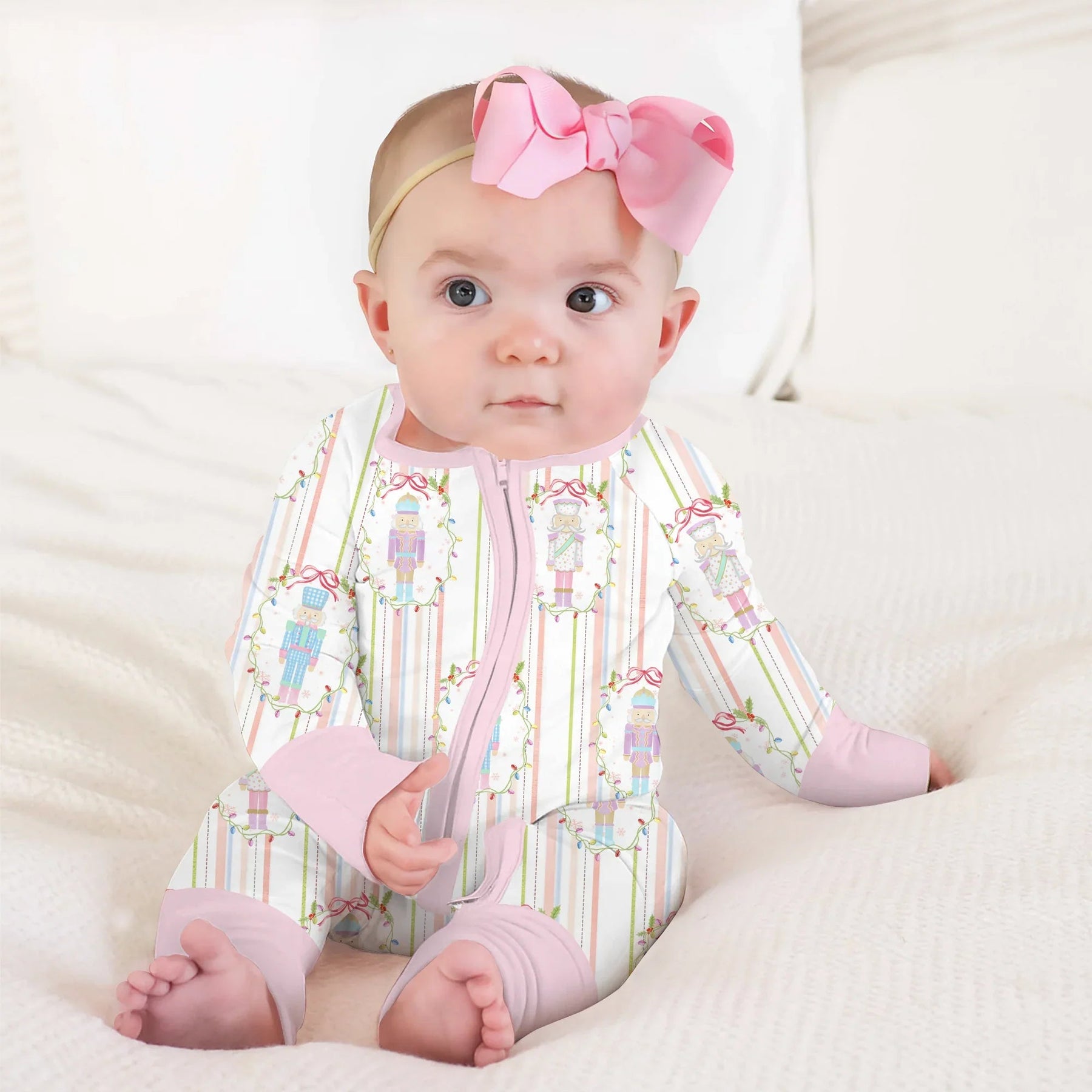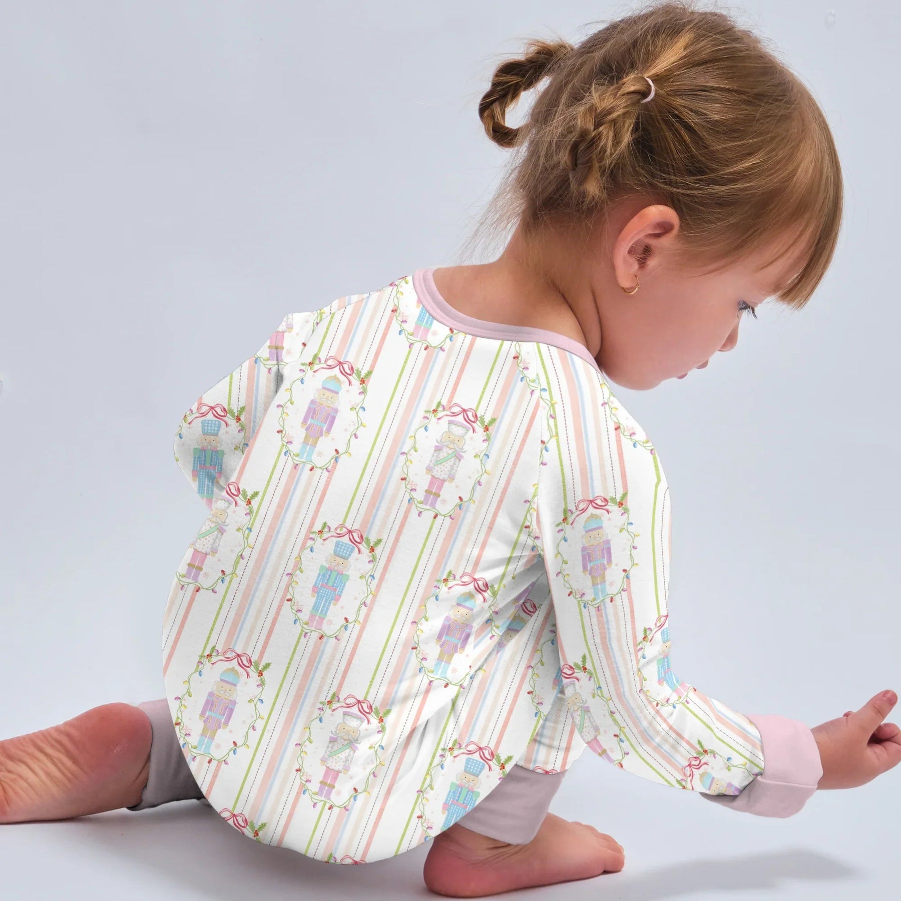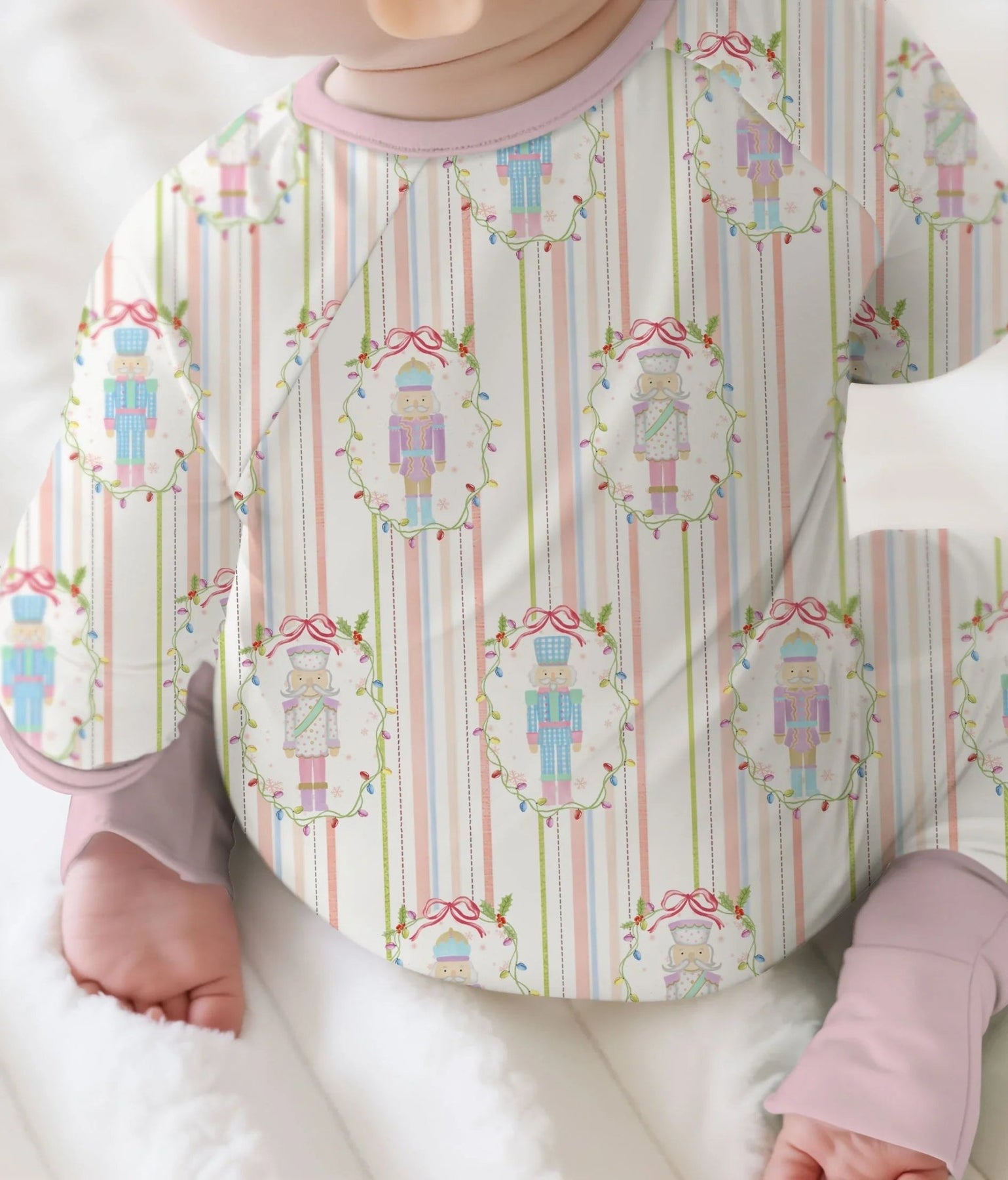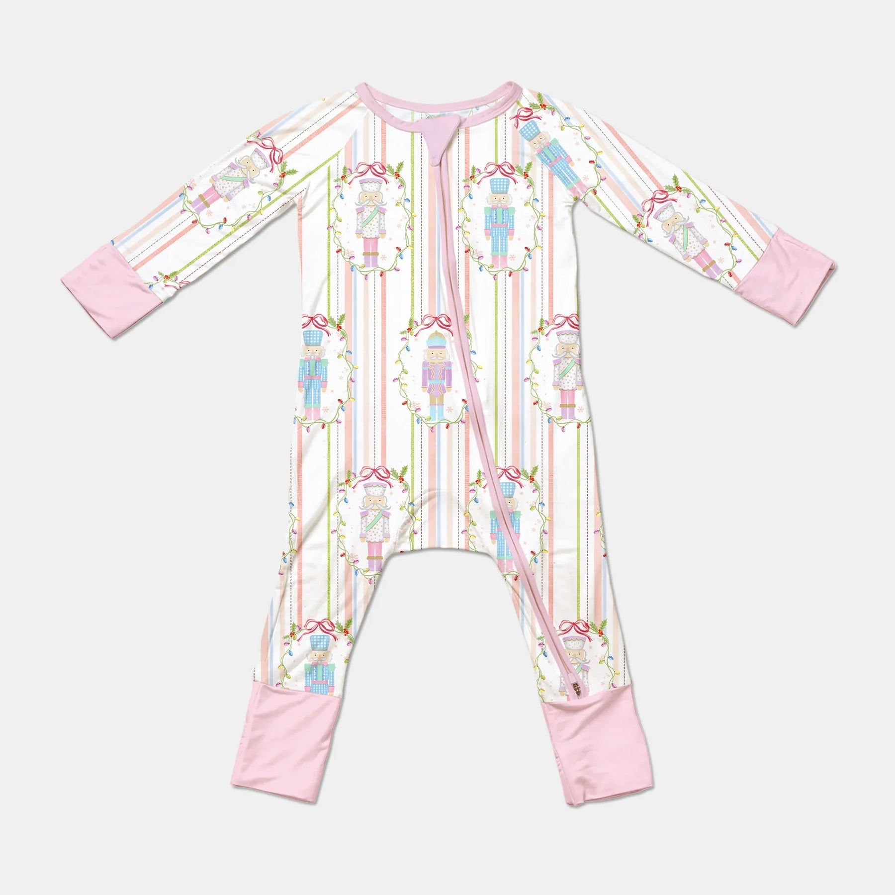 This design draws inspiration from the timeless Nutcracker ballet, blending classic holiday elegance with a soft, whimsical pastel palette. The pattern features charming nutcracker soldiers framed in delicate garlands of holly and festive ribbons, arranged neatly against subtle vertical candy-cane stripes.