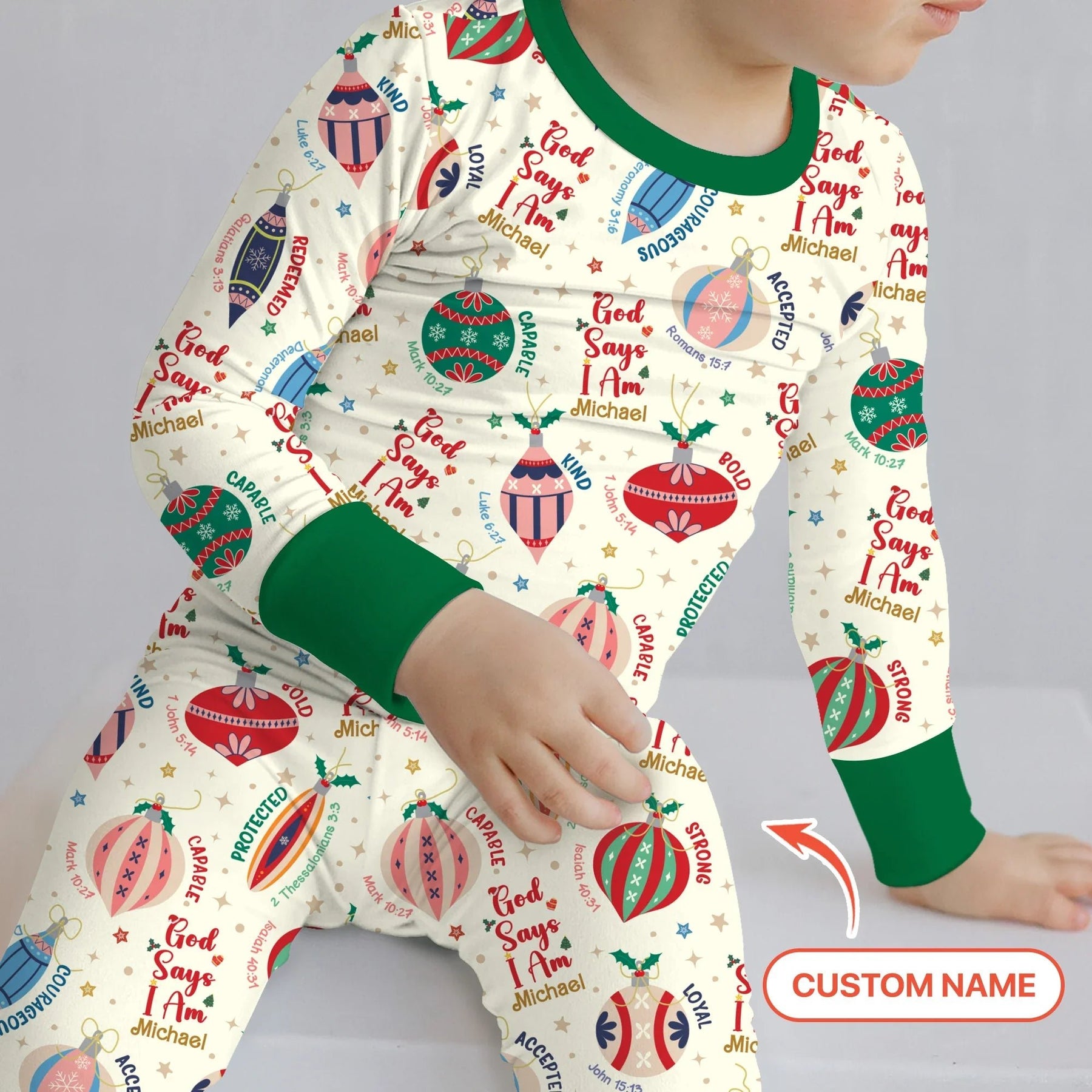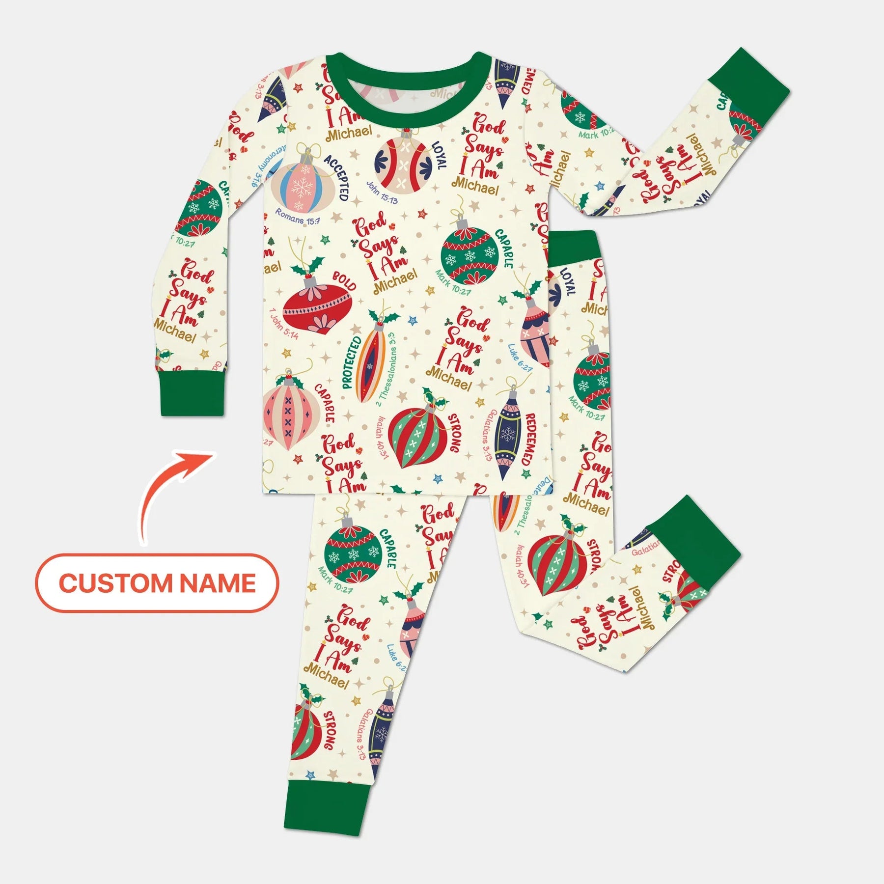 Celebrate the true meaning of Christmas with the God Says I Am Joyful Christmas Custom Name Collection — where faith, joy, and holiday sparkle come together in one cozy design. Each pajama is beautifully decorated with colorful Christmas ornaments, twinkling stars, and uplifting affirmations like “God Says I Am Loved, Strong, Protected, and Joyful.” 🌟 Personalized with your child’s name, it becomes a heartfelt reminder of God’s love wrapped in festive cheer. Crafted from ultra-soft, breathable cotton, this set ensures your little one stays comfy from bedtime prayers to Christmas morning excitement.