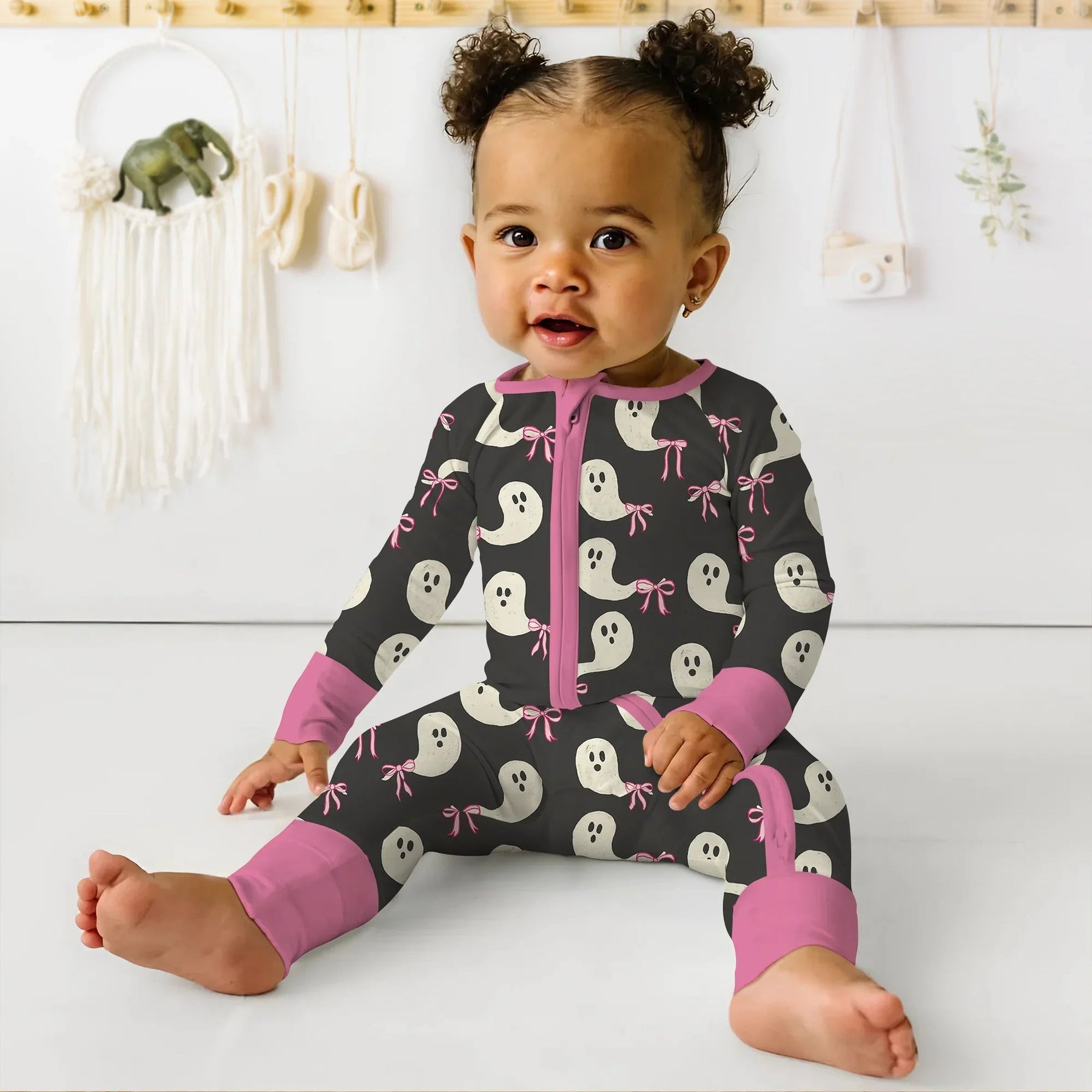 Sweetly spooky, our “Little Ghosts” bamboo zippies and pajamas make bedtime extra fun. Crafted from buttery-soft, breathable bamboo fabric, these PJs keep little ones cozy and comfy all night long. The playful ghost print with pink bows adds a charming Halloween touch while being gentle on sensitive skin. Stretchy, soft, and perfect for spooky season snuggles.