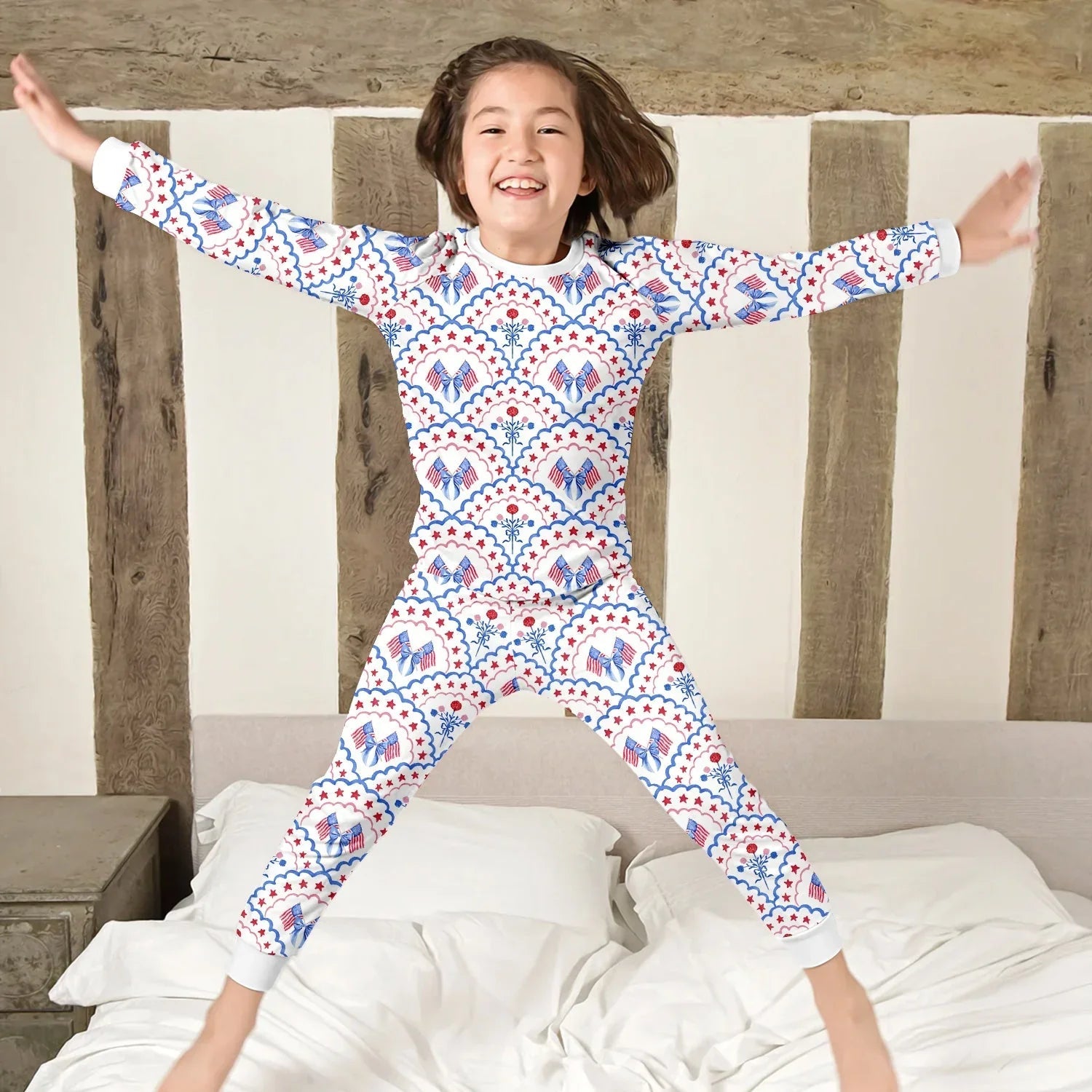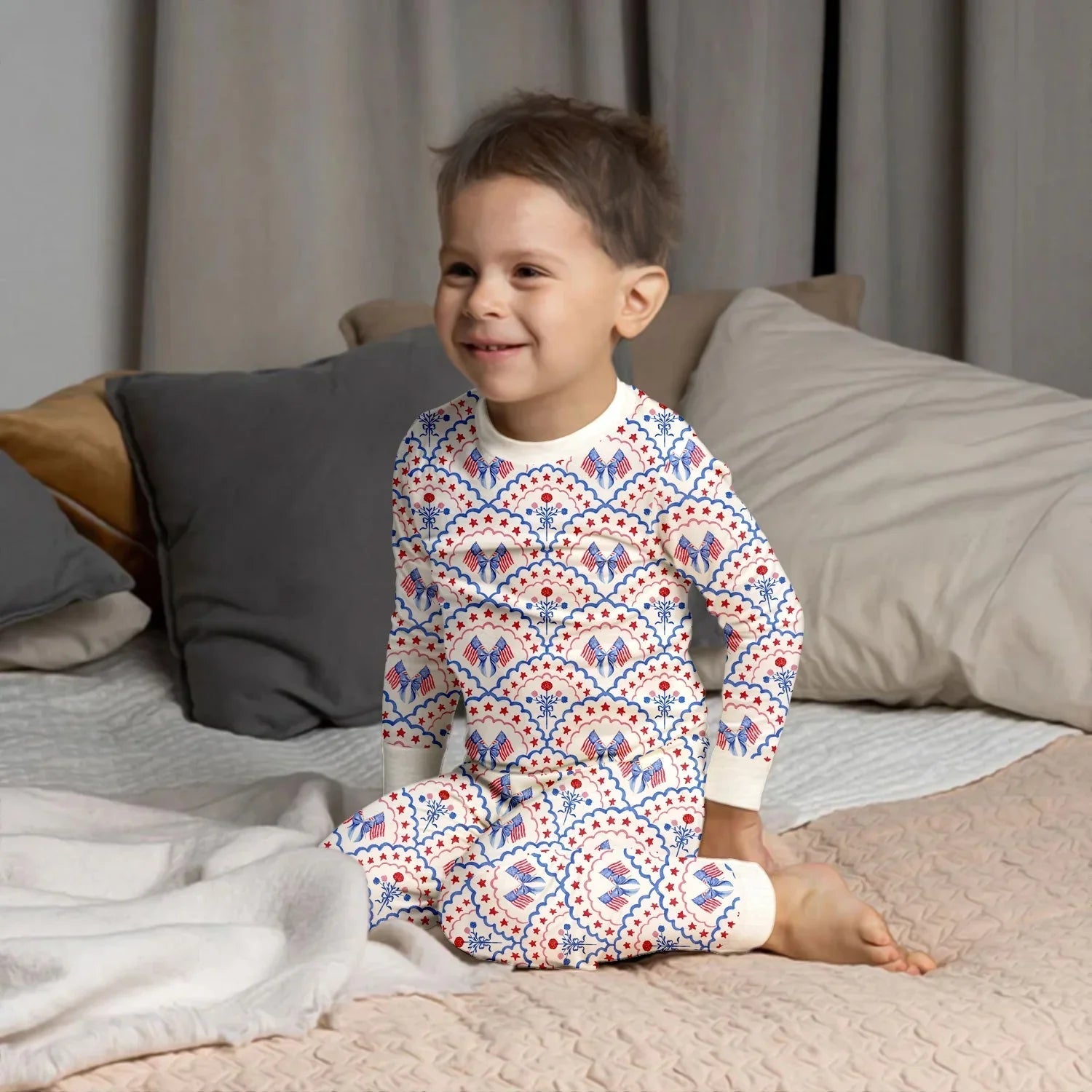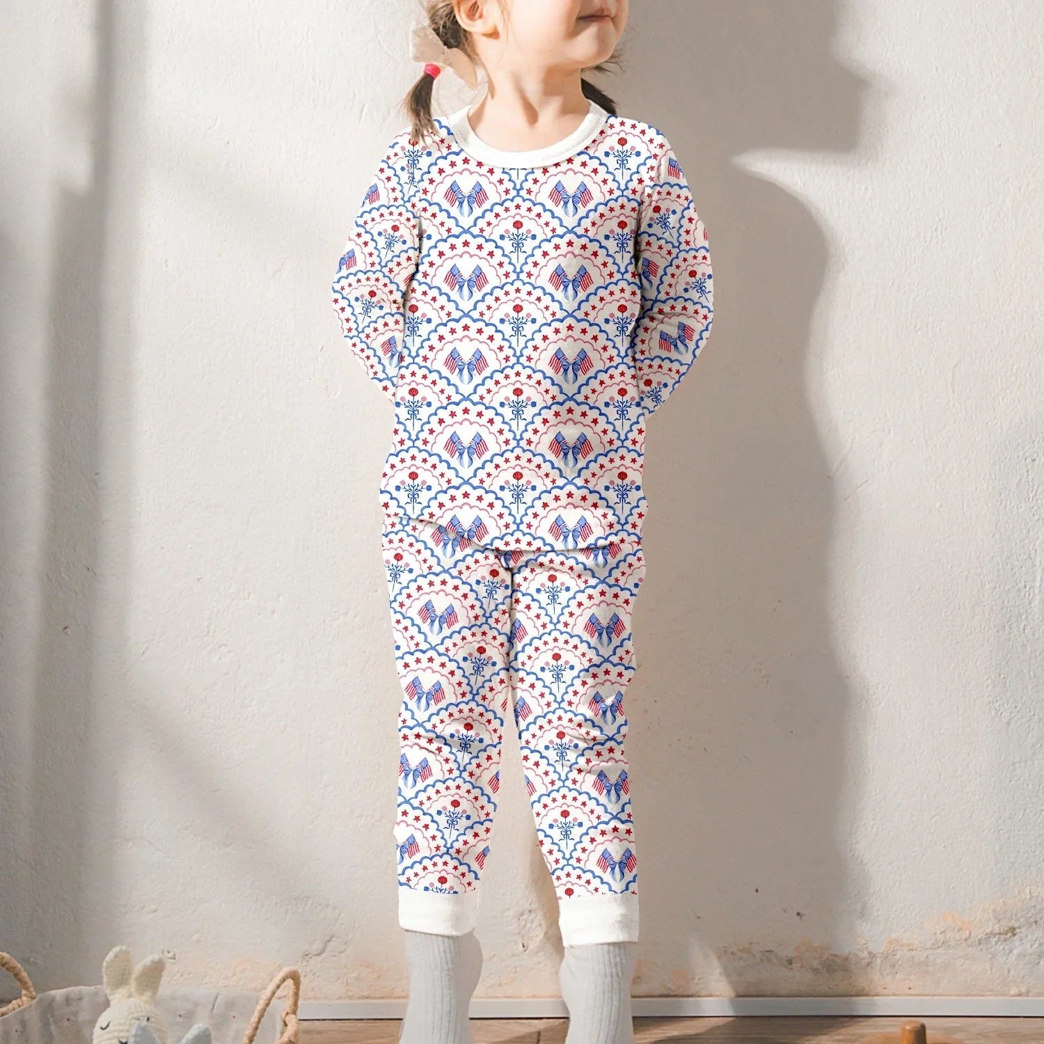 Red White and Blue Scalloped Two Piece Long Sleeve Pajama Set