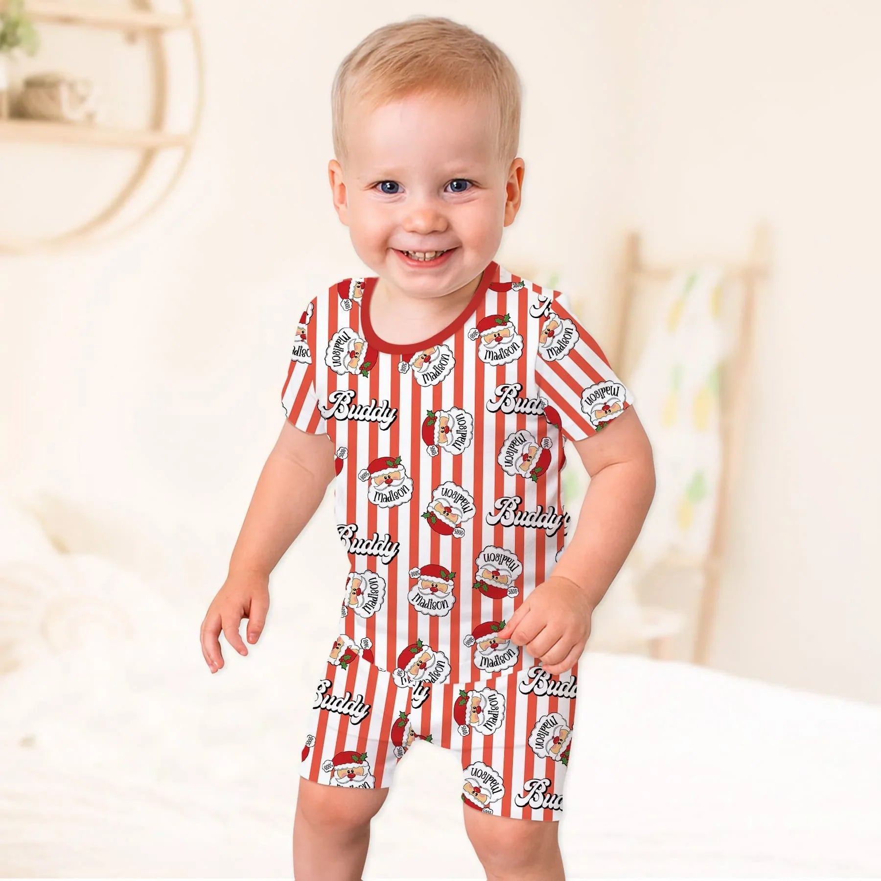 Meet the Santa Buddy Stripes collection—bright, playful, and fully customizable. Add any name to this cheerful Santa design for a fun, personalized holiday look.