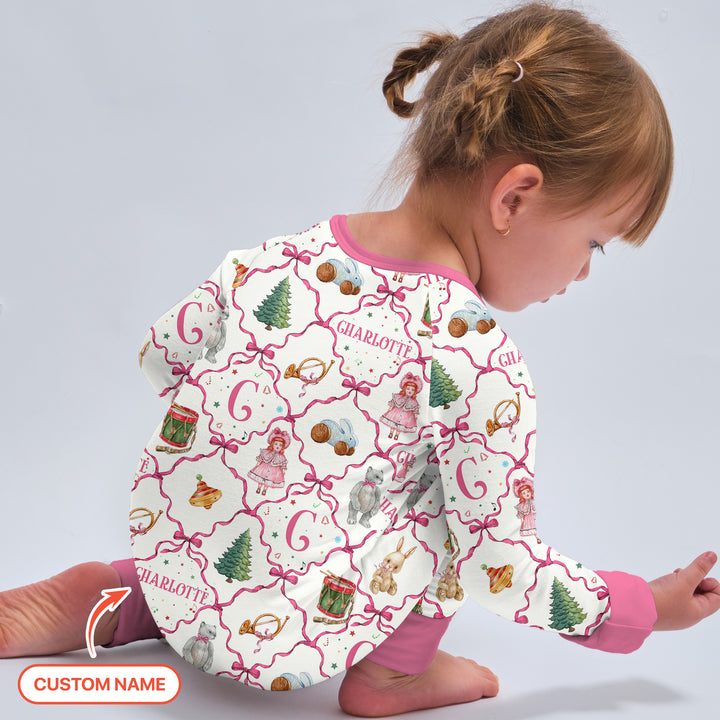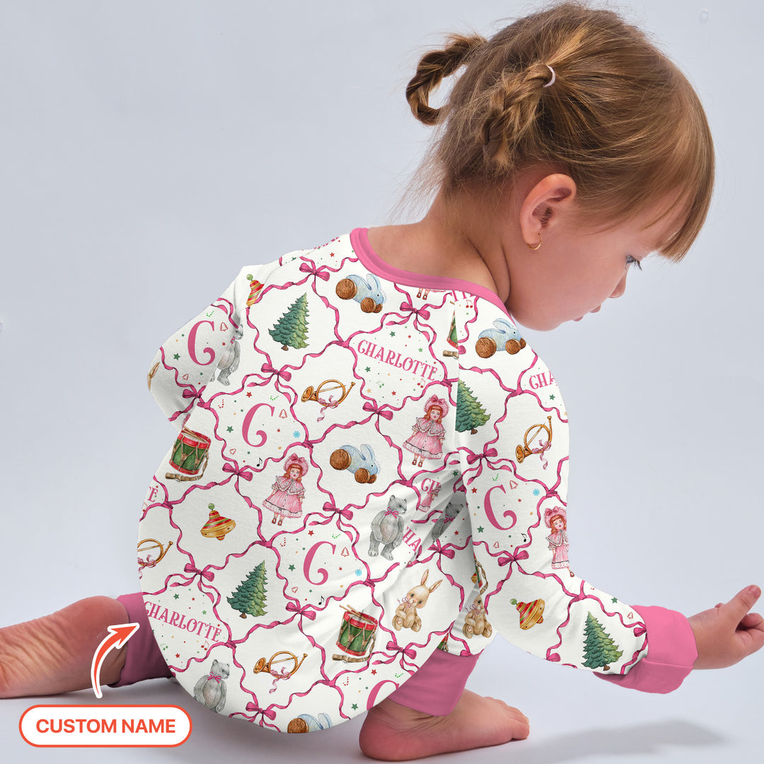 Step back into a world of classic holiday charm with our Vintage Christmas Toy Custom Name Collection — where nostalgia meets festive coziness. This heartwarming pajama design brings together timeless Christmas icons: toy drums, dolls, bunnies, ornaments, and pine trees — all delicately framed in a vintage red ribbon pattern that feels like a page from an old-fashioned storybook.
