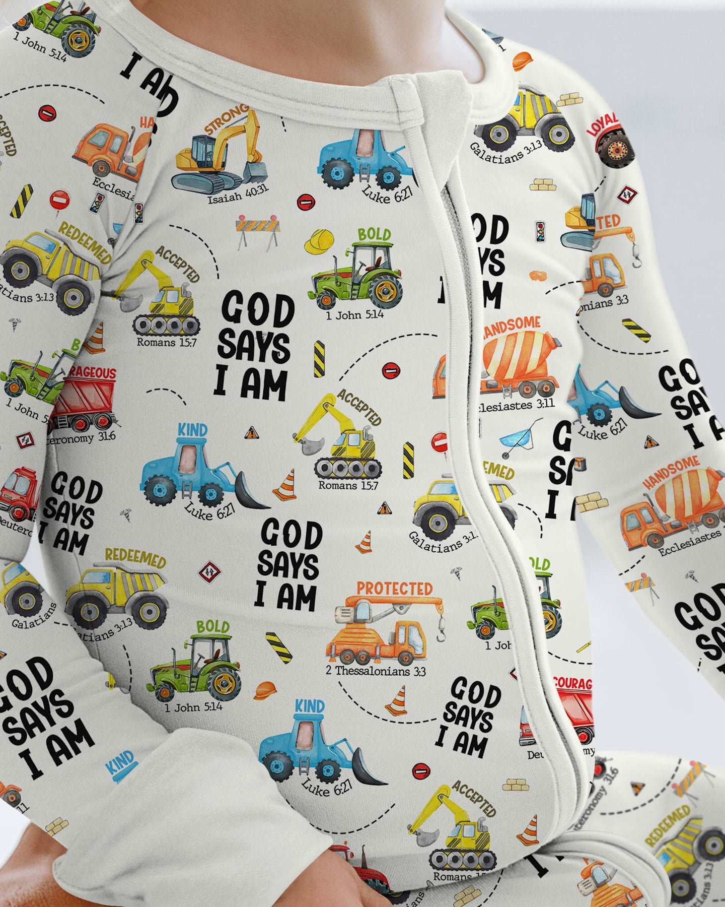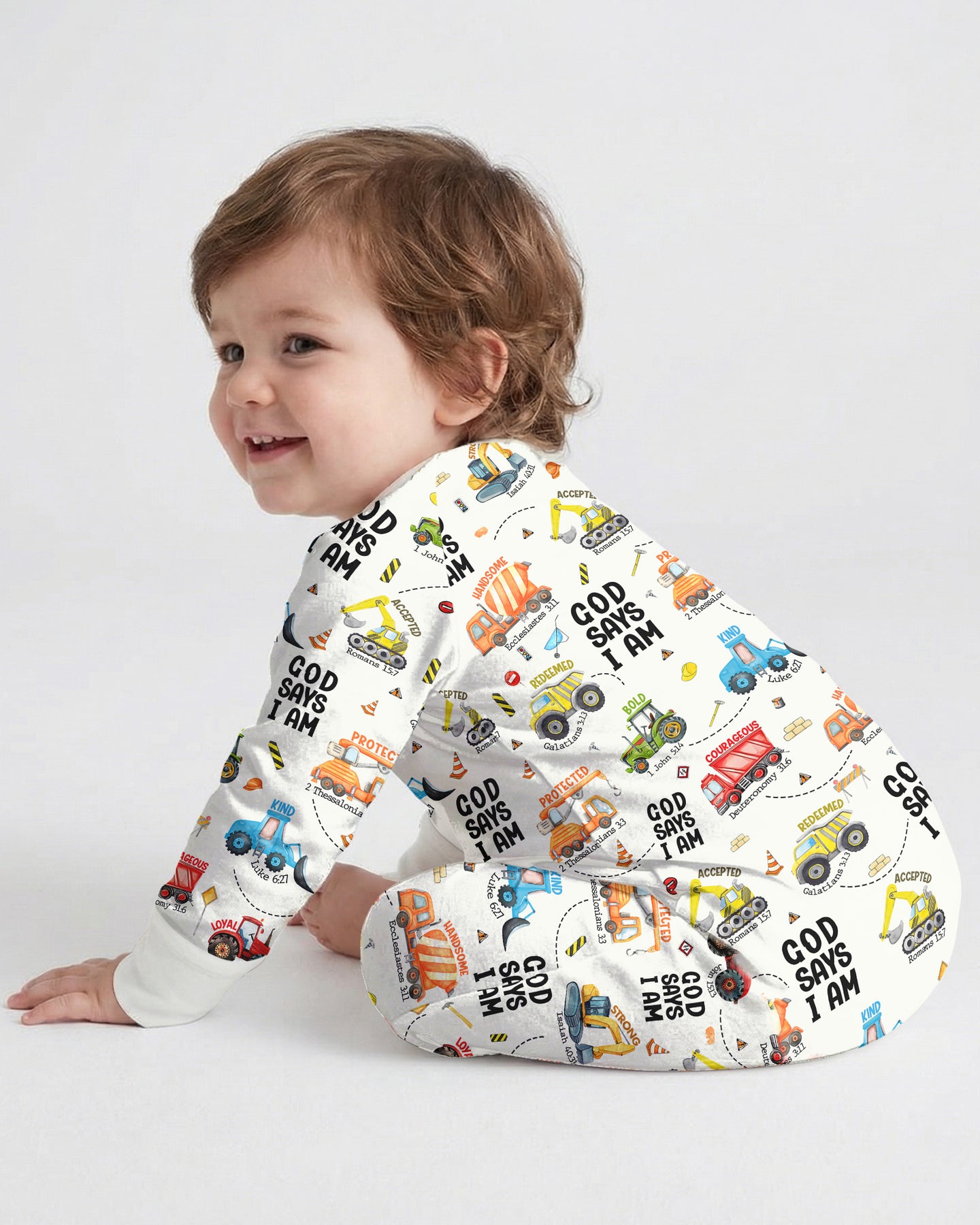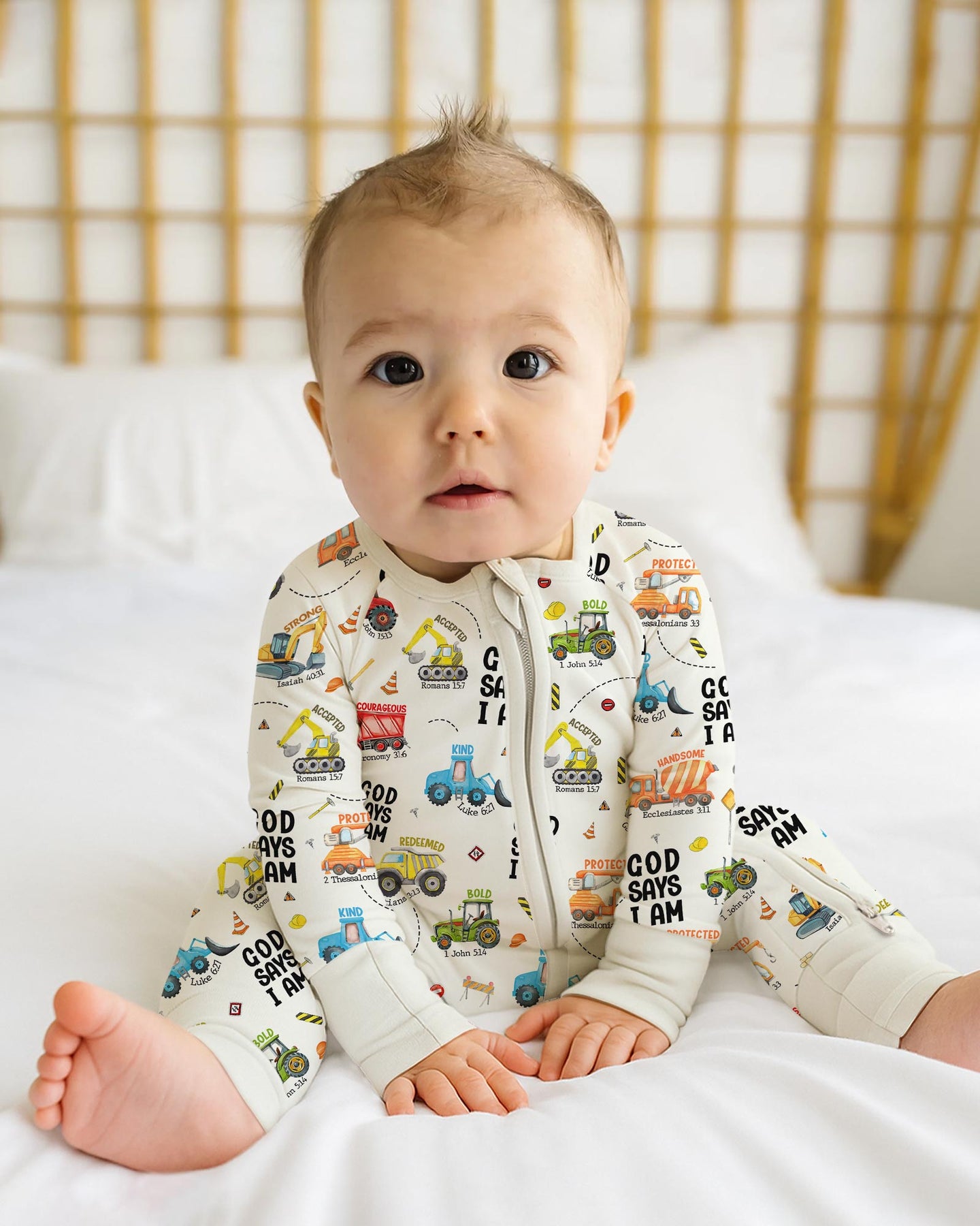 Gear up for faith-filled fun with our “God Says I Am” Construction Collection! These bamboo pajamas for babies and kids are packed with bright, playful trucks and uplifting Bible affirmations—reminding little ones of their strength, courage, and worth in God’s eyes. Made from ultra-soft, breathable bamboo fabric, they’re perfect for active days, cozy nights, and every joyful moment in between.