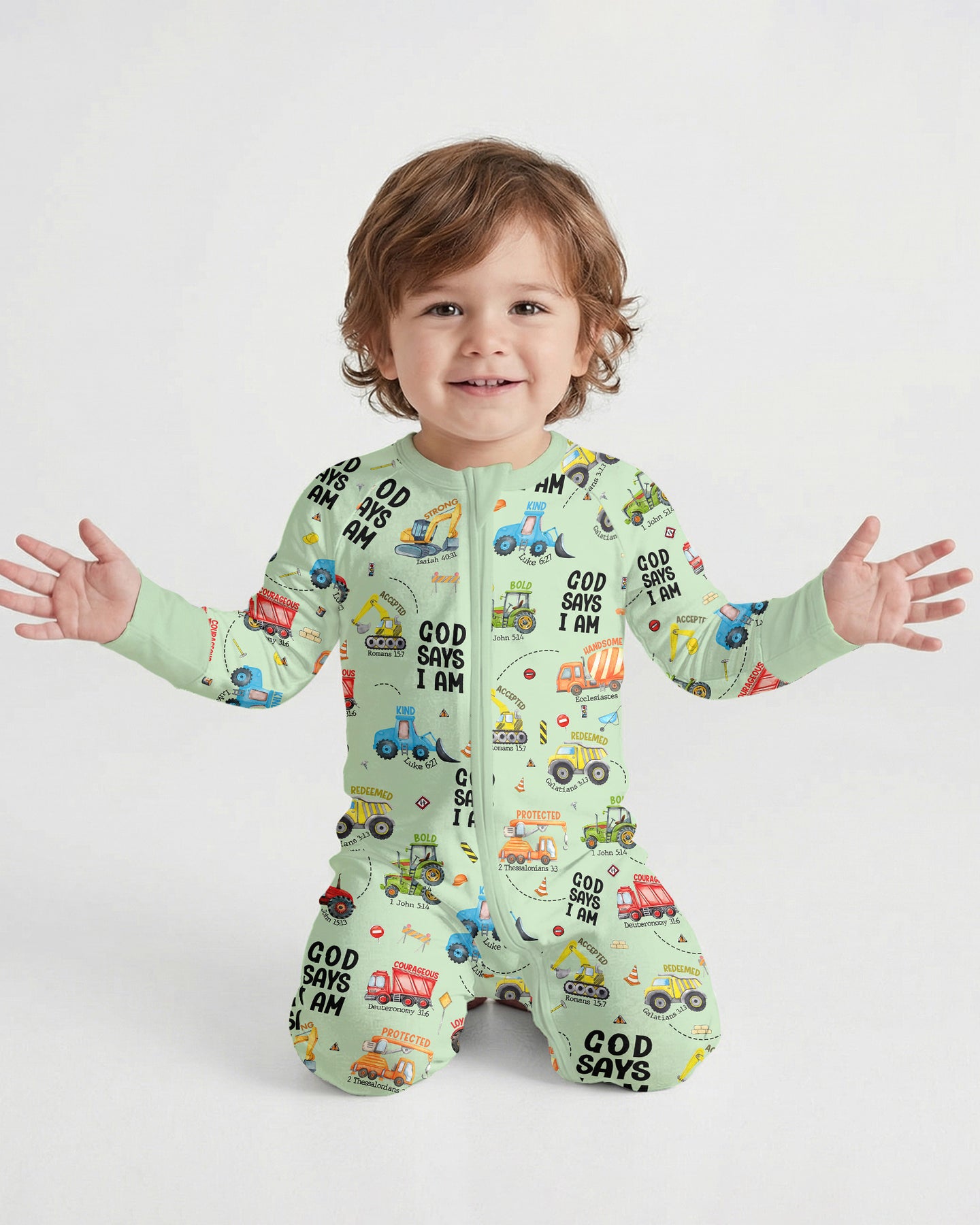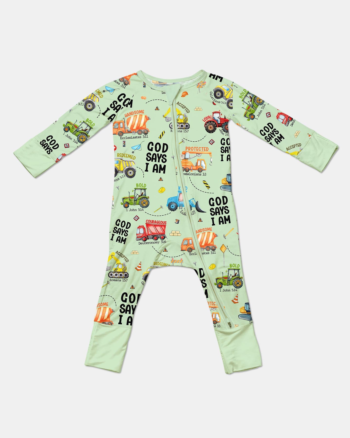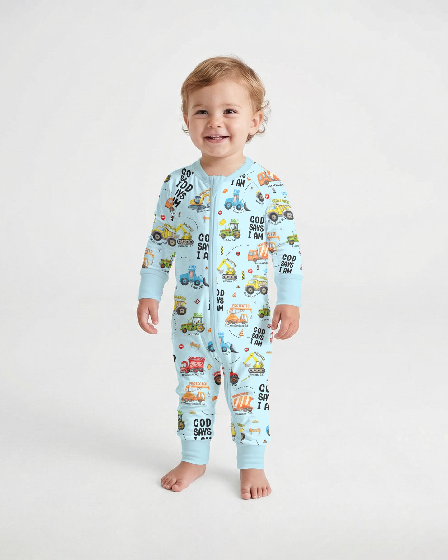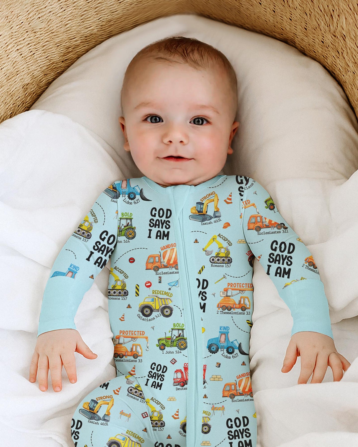 Gear up for faith-filled fun with our “God Says I Am” Construction Collection! These bamboo pajamas for babies and kids are packed with bright, playful trucks and uplifting Bible affirmations—reminding little ones of their strength, courage, and worth in God’s eyes. Made from ultra-soft, breathable bamboo fabric, they’re perfect for active days, cozy nights, and every joyful moment in between.