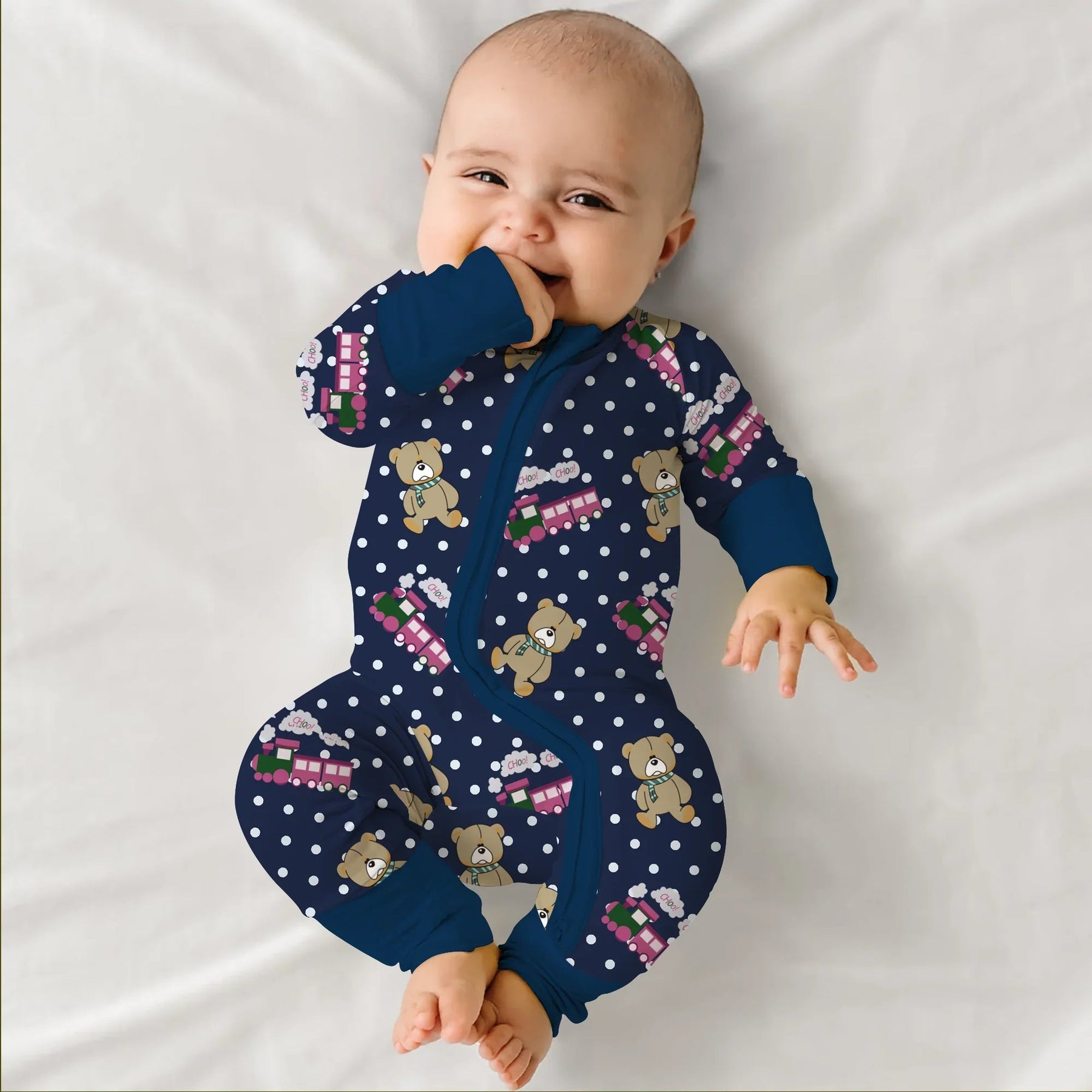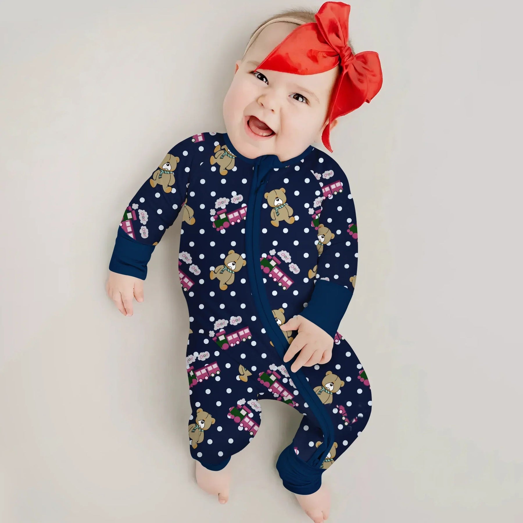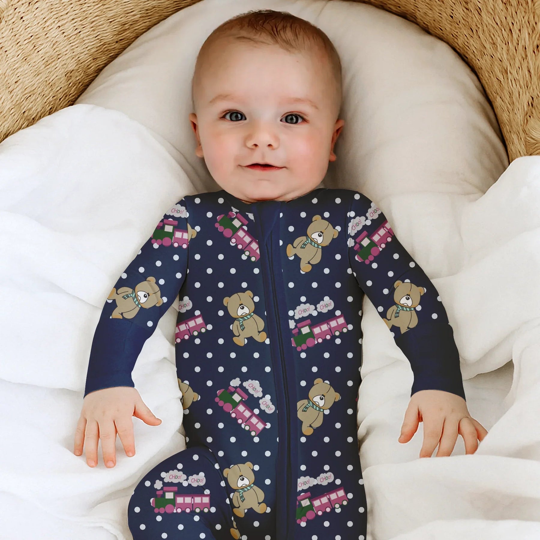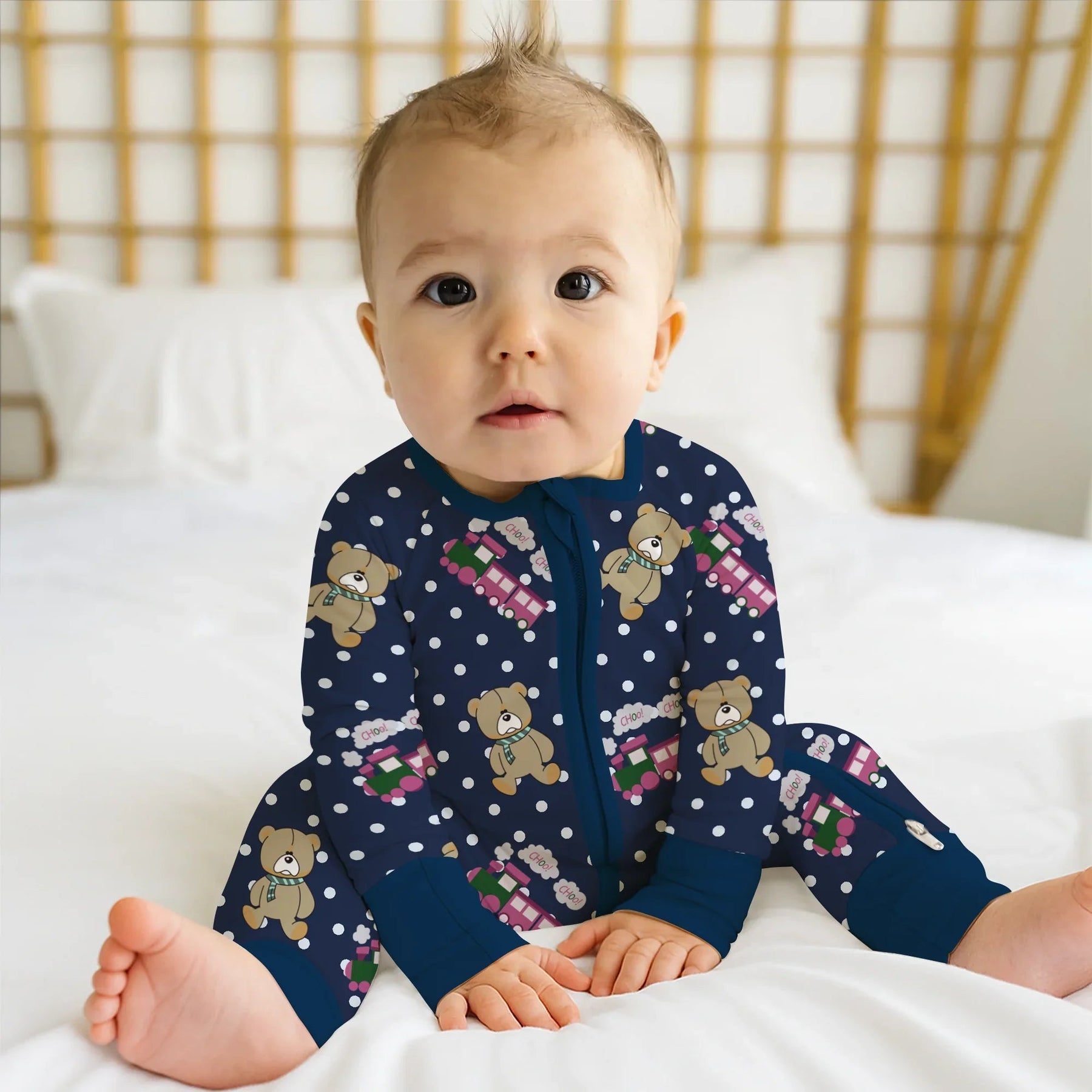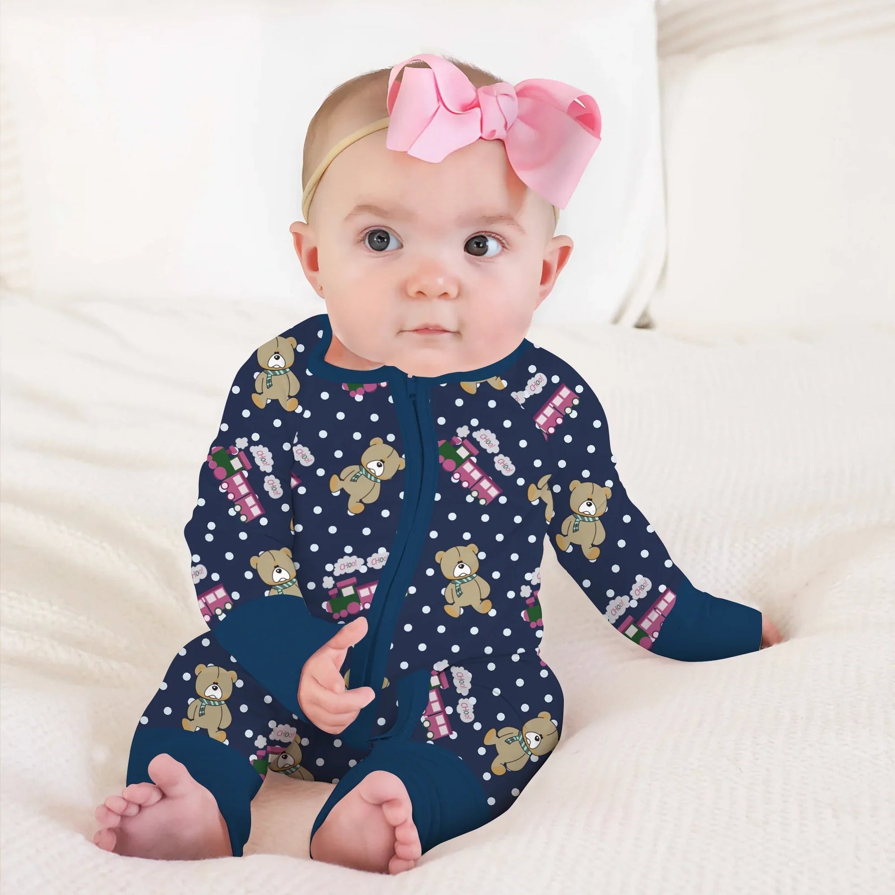 This product is a festive Christmas-themed kids’ pajama set, made from soft fabric and designed for both comfort and holiday cheer. The pajama features a deep navy background with an all-over print of adorable teddy bears holding presents, alongside stacks of pink-and-green gift boxes accented with bows, and white polka dots resembling falling snow. The design is finished with solid navy cuffs on the sleeves, ankles, and neckline, giving it a classic and cozy winter look. Perfect for holiday photos, Christmas Eve celebrations, or snuggly nights, this pajama set blends playful charm with festive spirit.