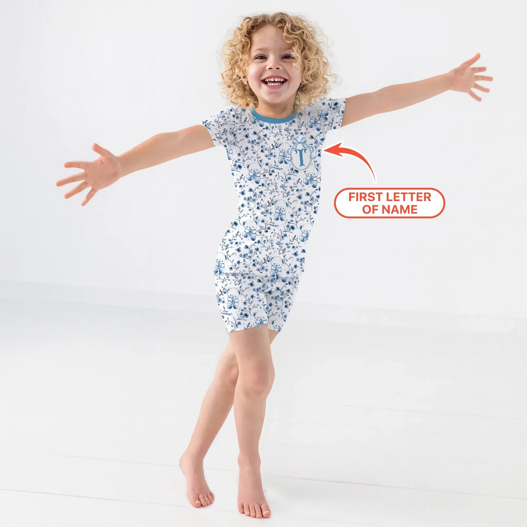 Custom Blue Chinoiserie Teddy Two Piece Short Sleeve Shorts Pajama Set