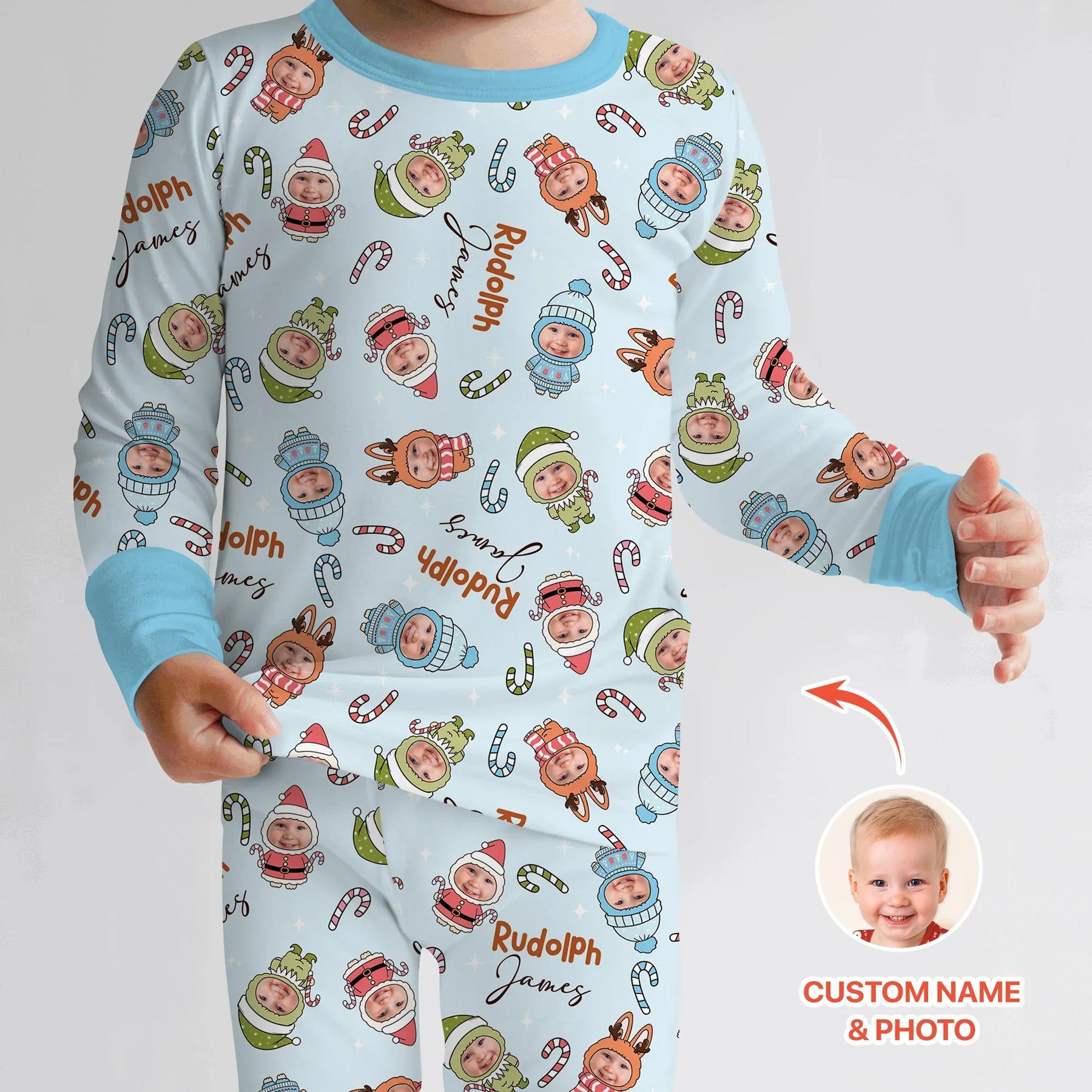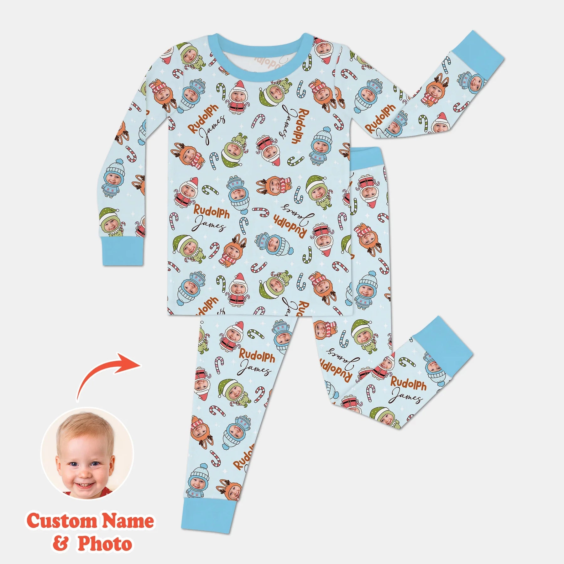 Custom Baby Photo Christmas Bear Two Piece Long Sleeve Pajama Set