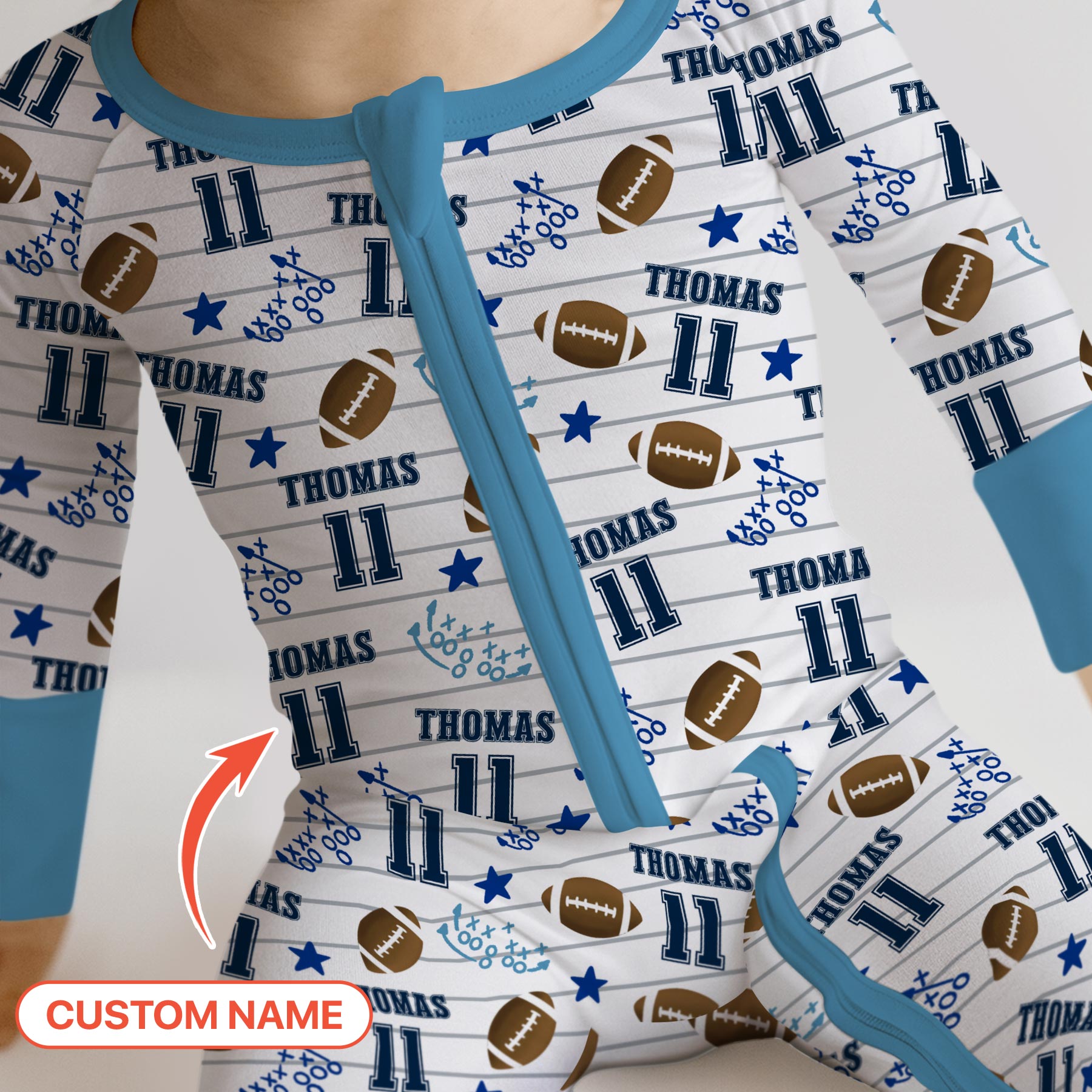 Get ready for kickoff cuddles! This sporty and adorable print features footballs, playbook doodles, stars, jersey numbers, andābest of allāyour little MVPās name. Perfect for tiny fans who love cheering, running, and snuggling in style.