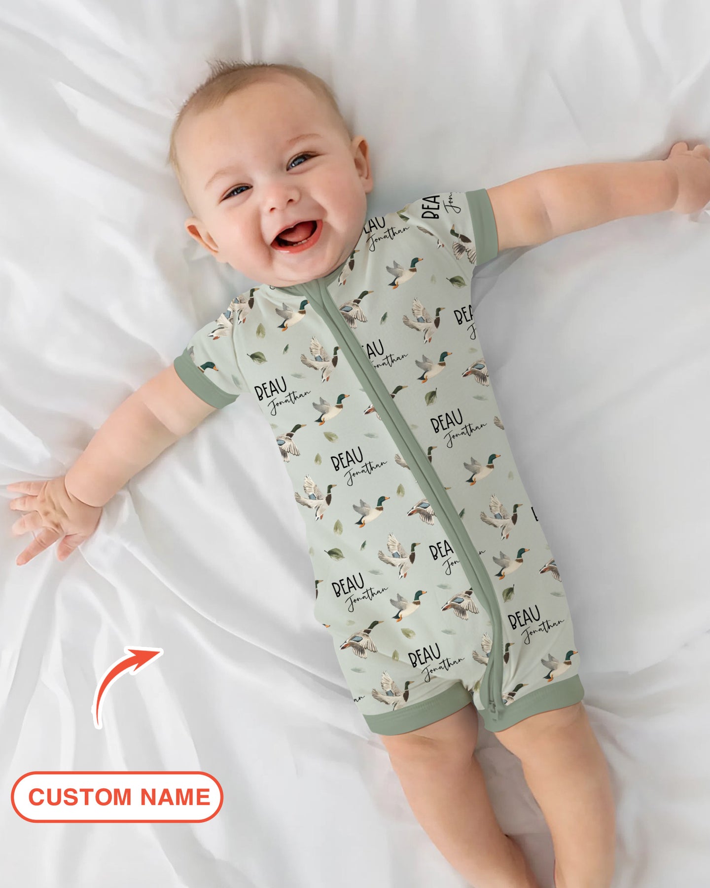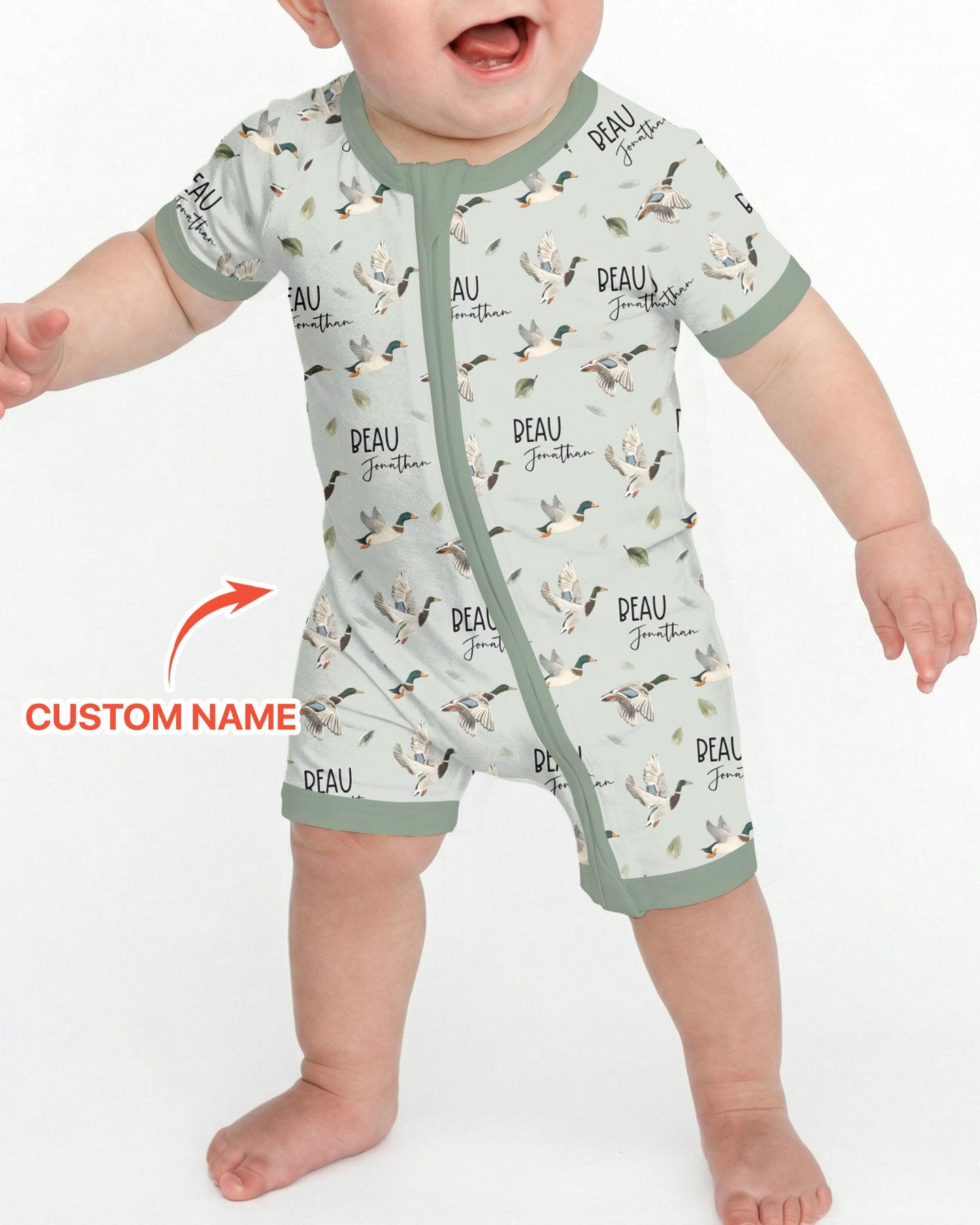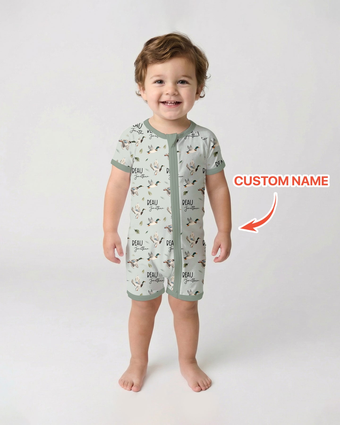 Custom Name Mallard Duck Bamboo Zippies & PJ Sets bring the calm beauty of the outdoors to your little one’s everyday comfort. Featuring graceful flying mallard ducks, soft drifting leaves, and your child’s custom name woven throughout the design, this nature-inspired print is perfect for little adventurers and outdoor-loving families.