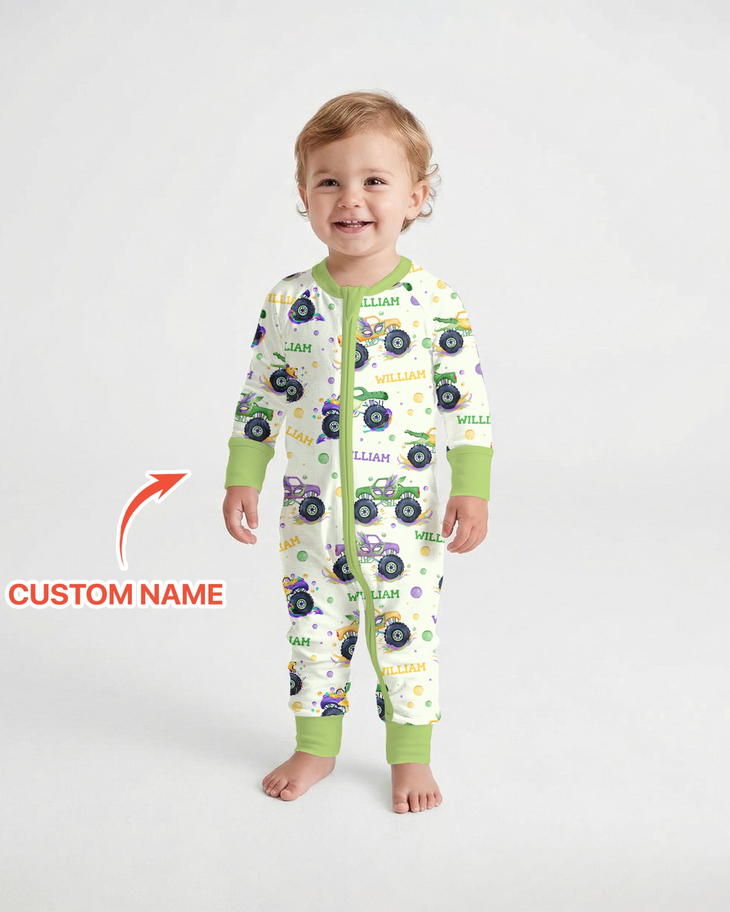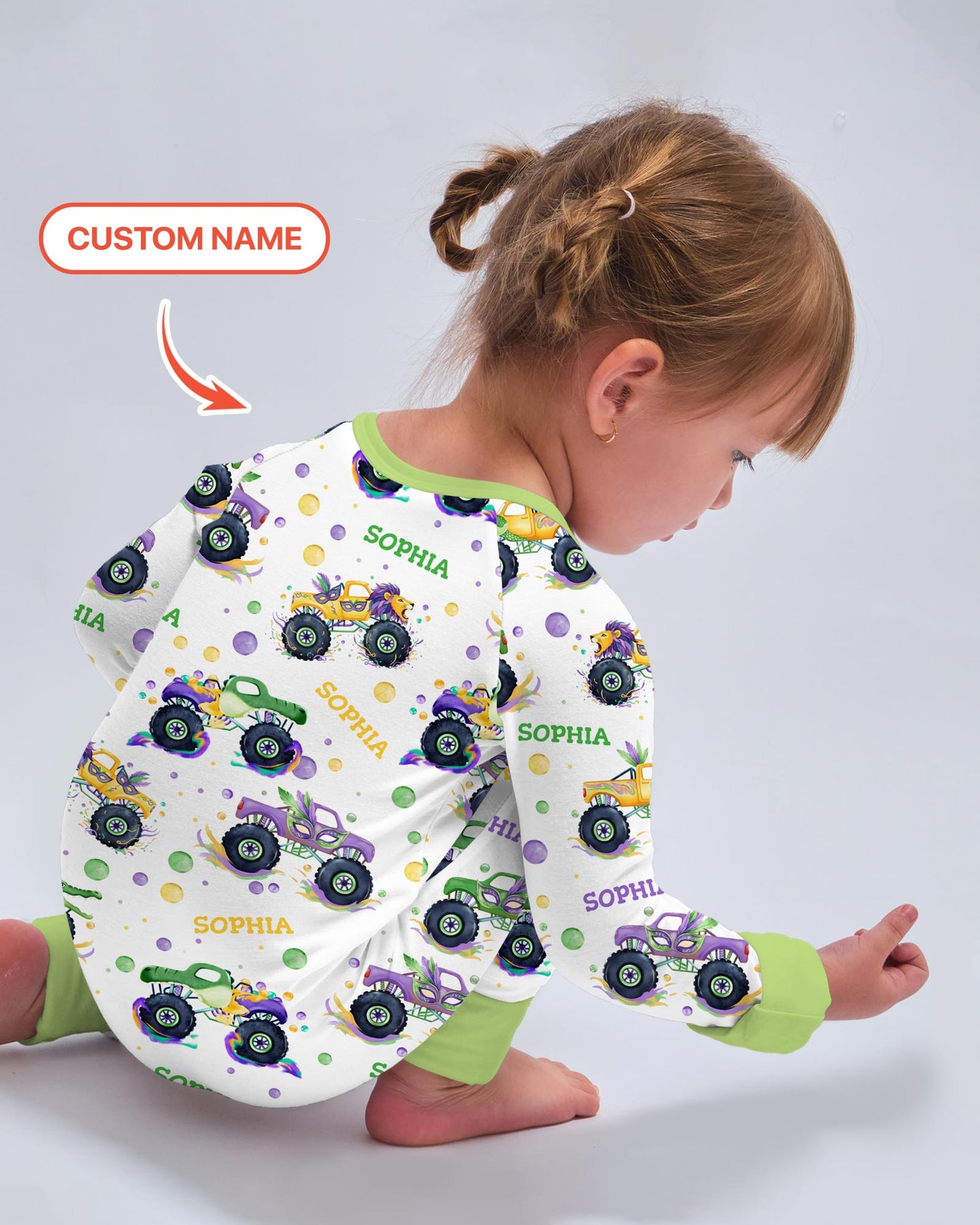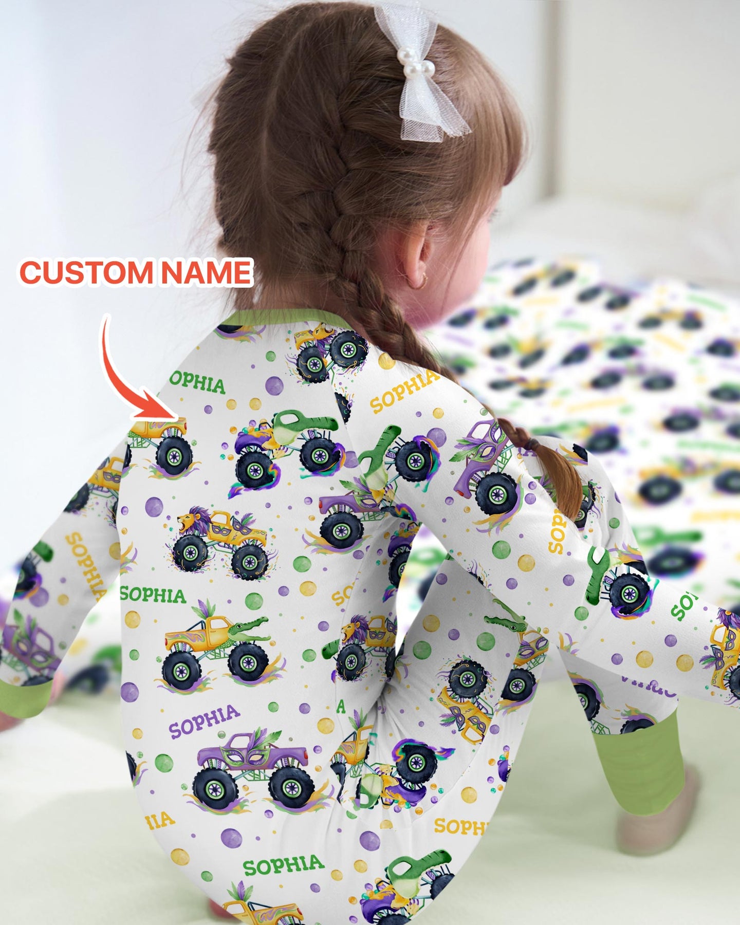 Brings a Monster Truck Mardi Gras vibe, blending bold trucks with festive Mardi Gras colors, confetti dots, and playful energy into sleeping clothing. The design feels fun and lively, made extra special with a custom name, creating a joyful, personalized sleepwear look that celebrates imagination and celebration.
