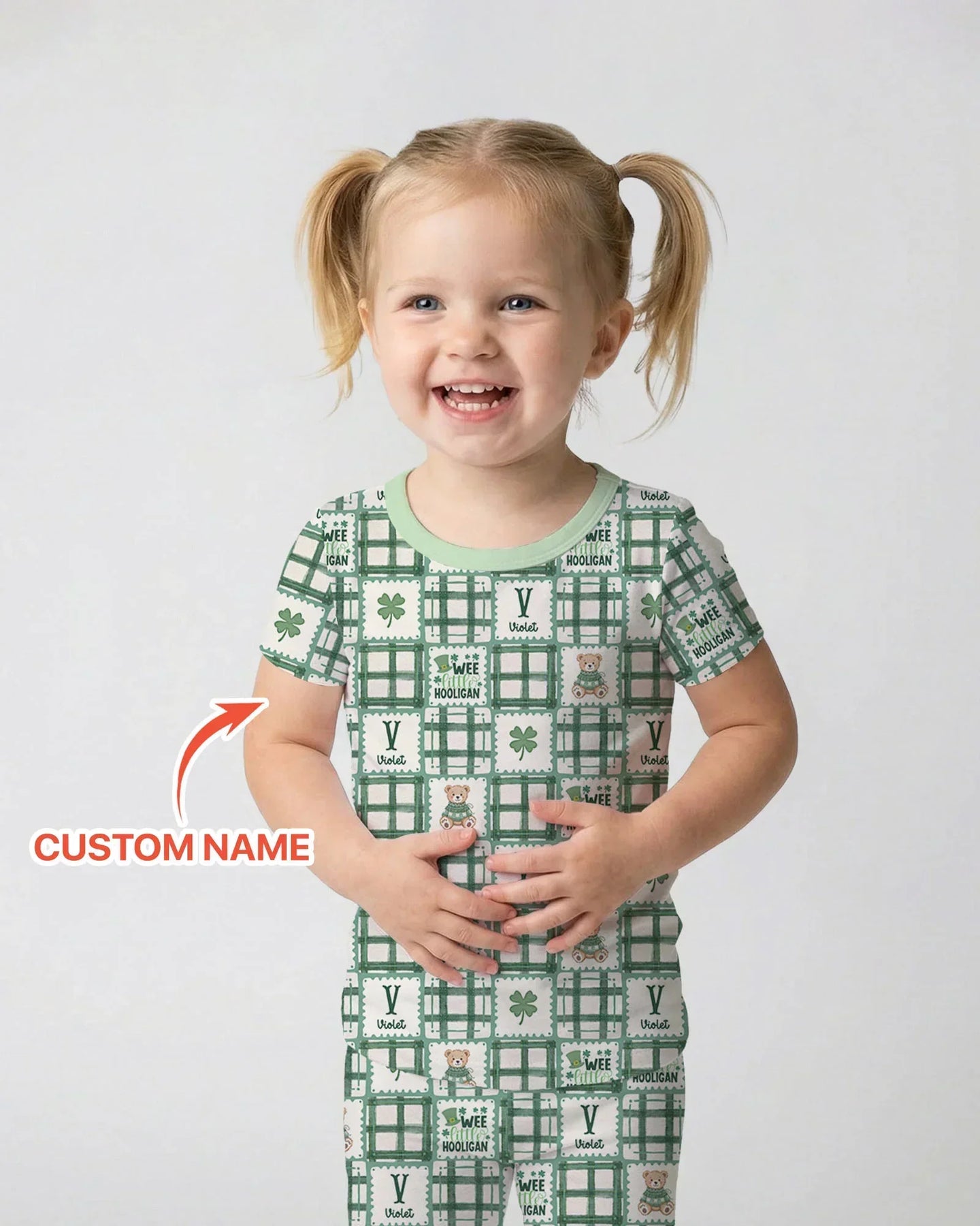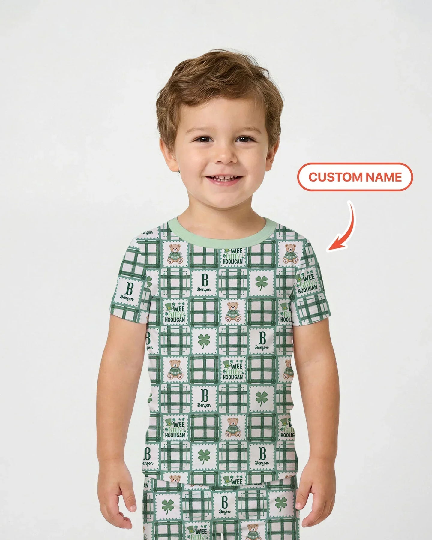 Custom Name Teddy Bear Gingham St. Patrick's Day Two Piece Short Sleeve Pajama Set