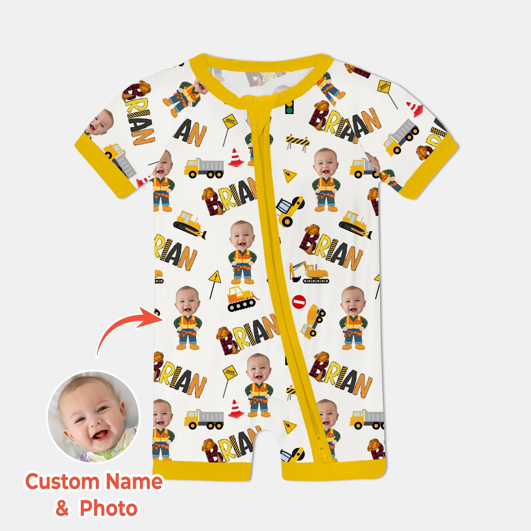 Built for little dreamers who love trucks, tools, and all things construction! This adorable pattern features cheerful mini builders, diggers, dump trucks, safety signs, and your child’s very own name—making it the perfect personalized outfit for your hardworking cutie.