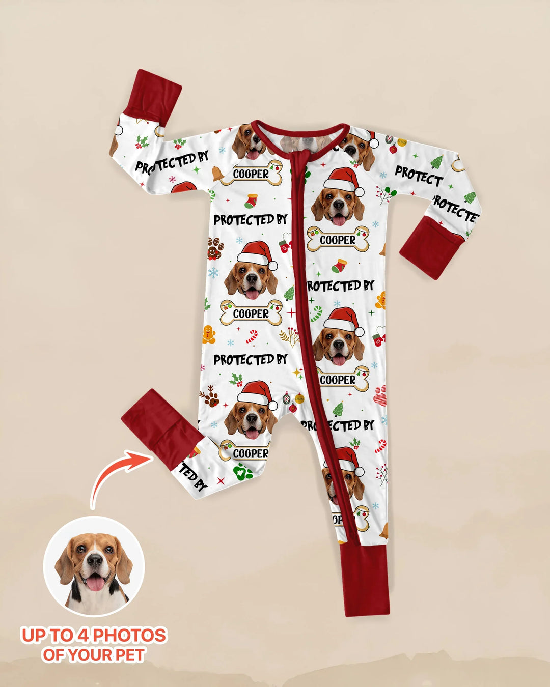 Celebrate the holidays with our “Custom Dog Photo "Protected By" Christmas” bamboo zippies and pajamas. Made from buttery-soft, breathable bamboo fabric, these PJs keep little ones cozy and comfy all season long. Personalized with up to 4 photos of your pup, festive Christmas icons, and the playful “Protected By” theme, they add warmth, joy, and a paw-sonal touch to bedtime.