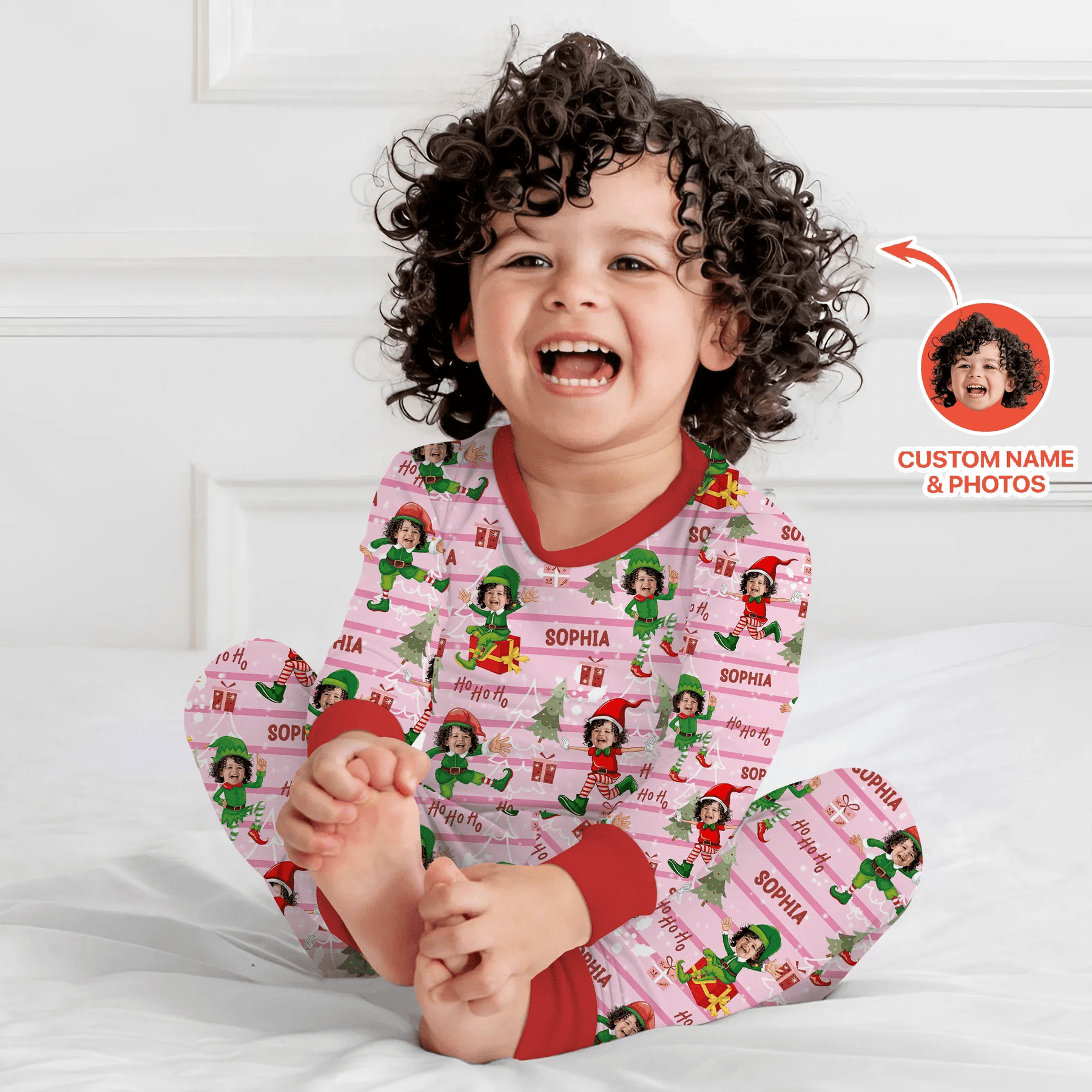 Custom Photo Baby Christmas Elf Two Piece Long Sleeve Pajama Set