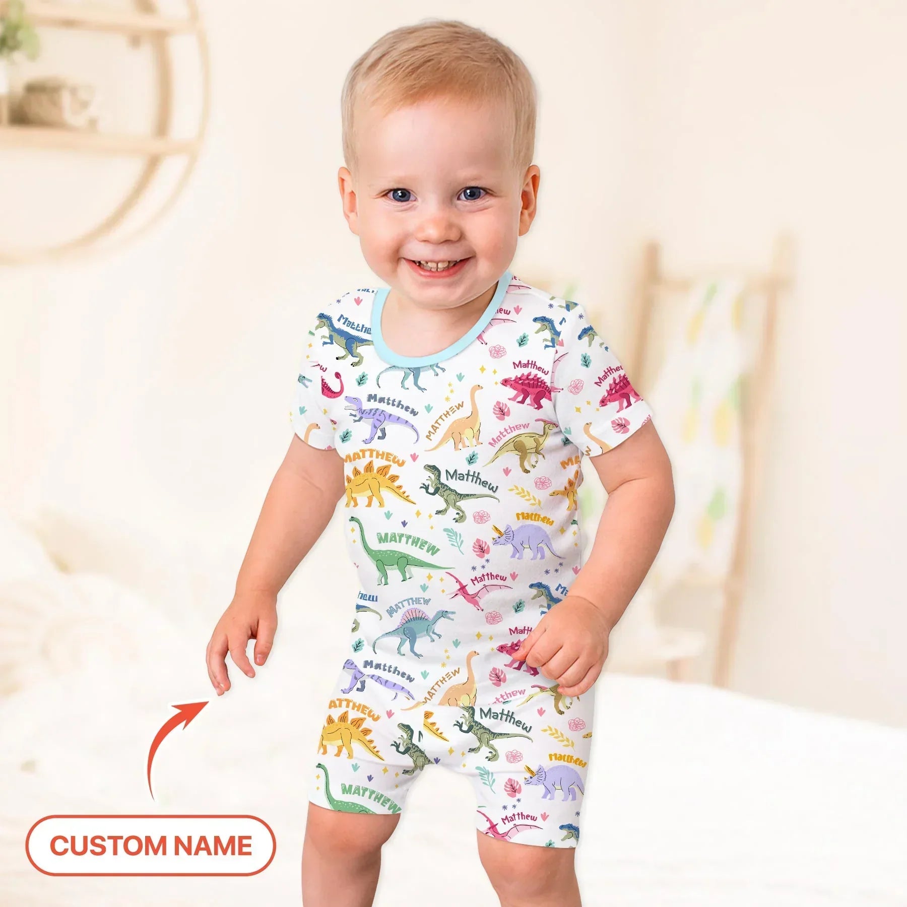Turn bedtime into a fun prehistoric adventure with our Dino Roar Custom Name collection! Featuring a colorful mix of friendly dinosaurs, this playful design brings big imagination and big smiles to little dino fans. You can even add your child’s name directly onto the print, making their pajamas truly one-of-a-kind.
