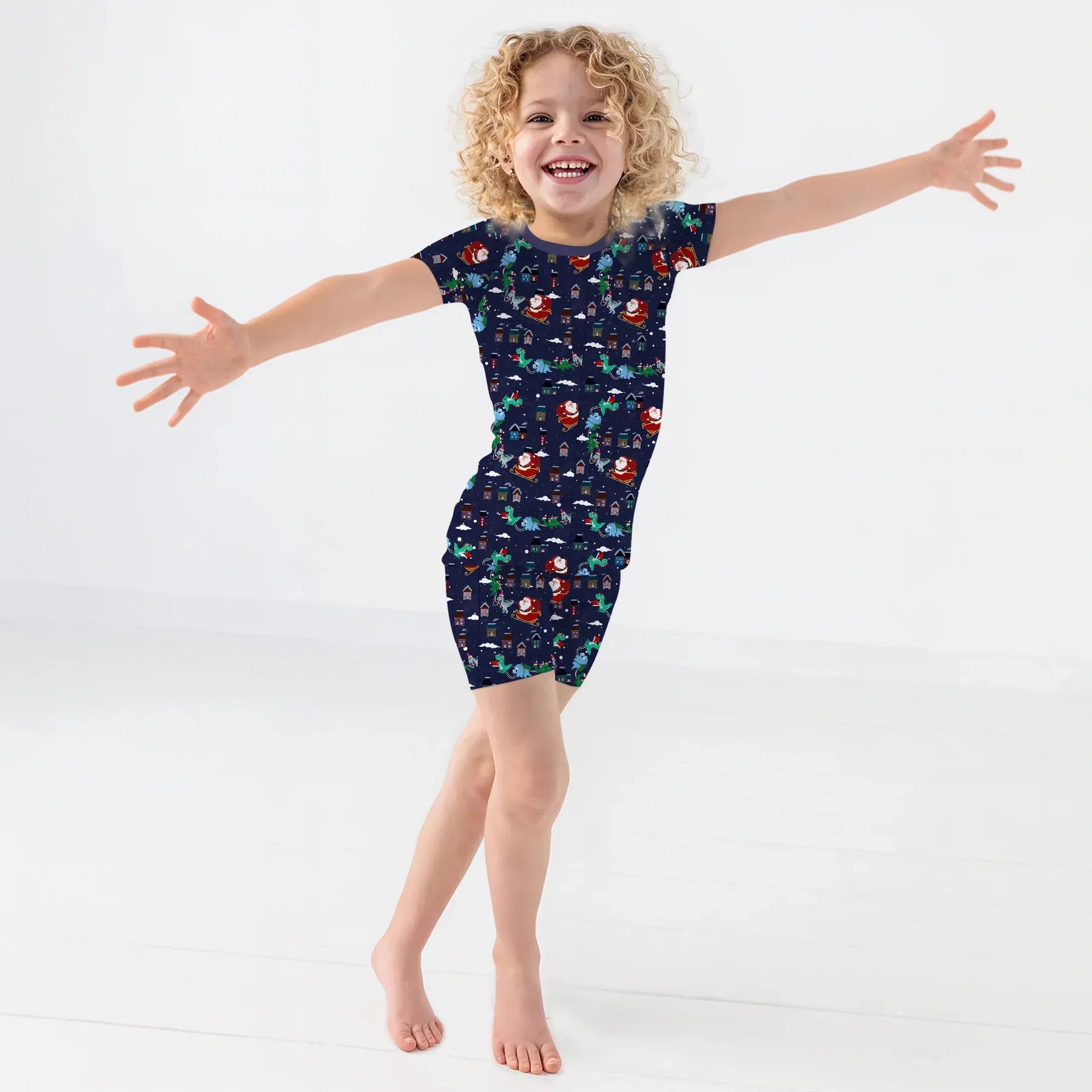 Dinosaurs Santa's sleigh Two Piece Short Sleeve Shorts Pajama Set