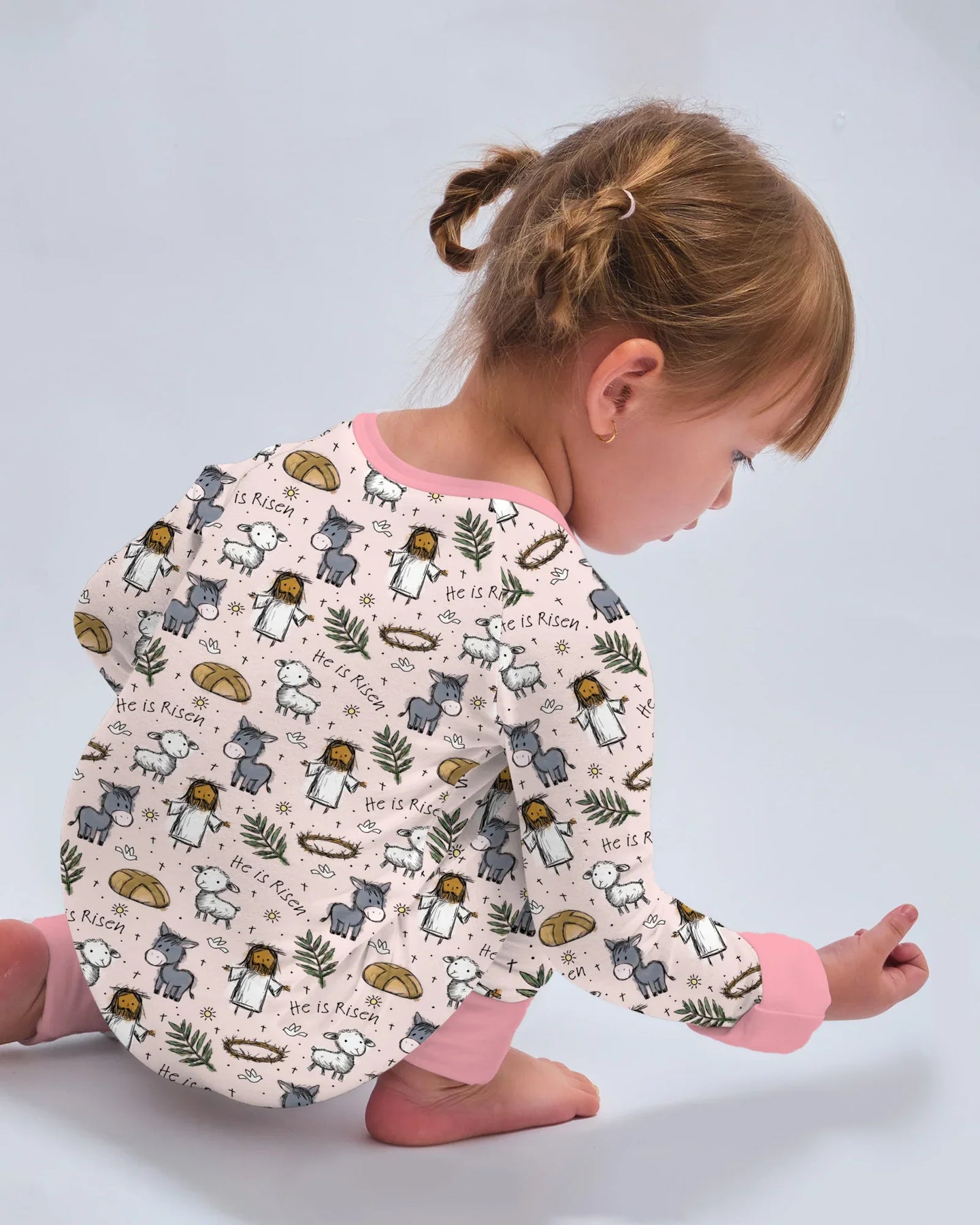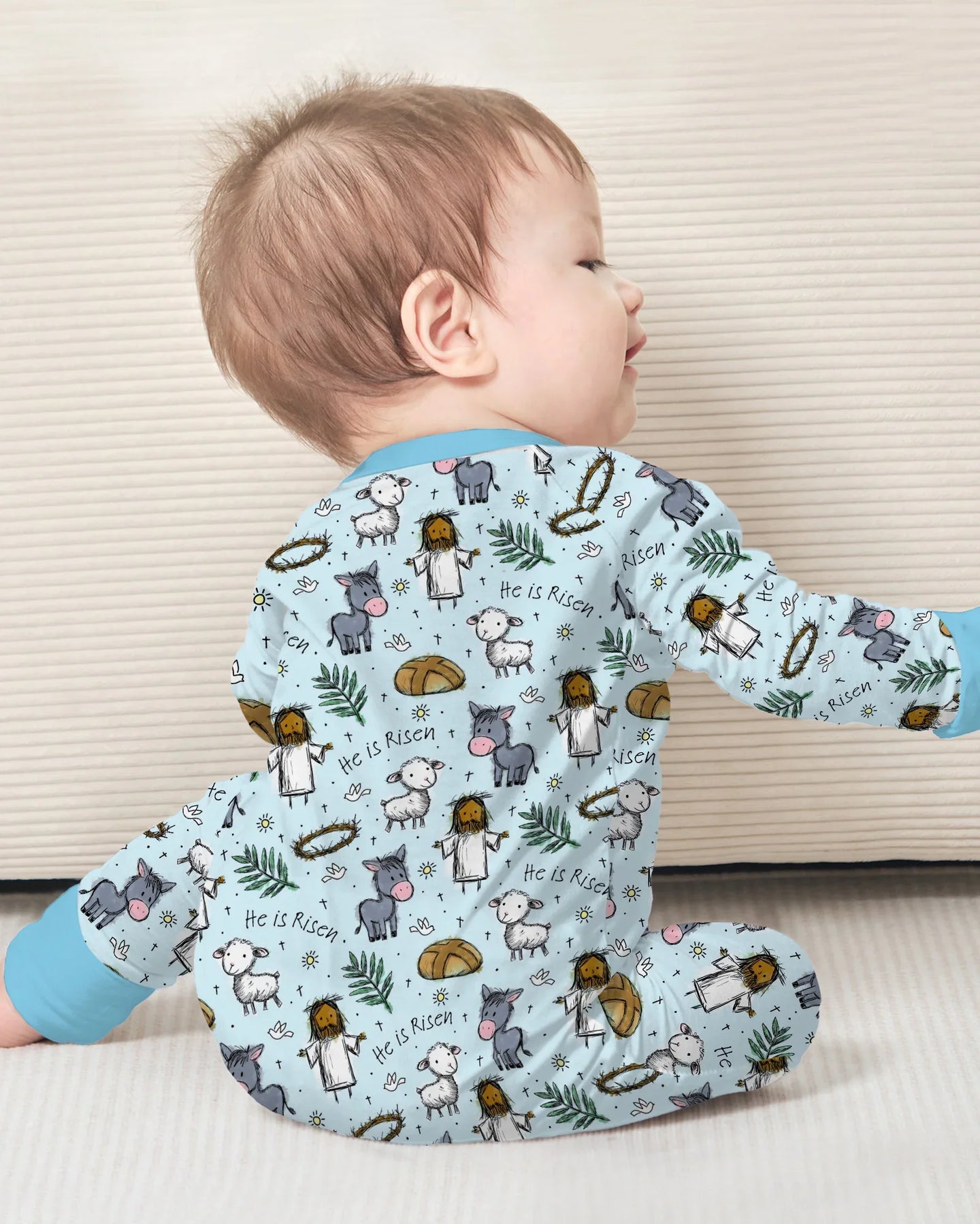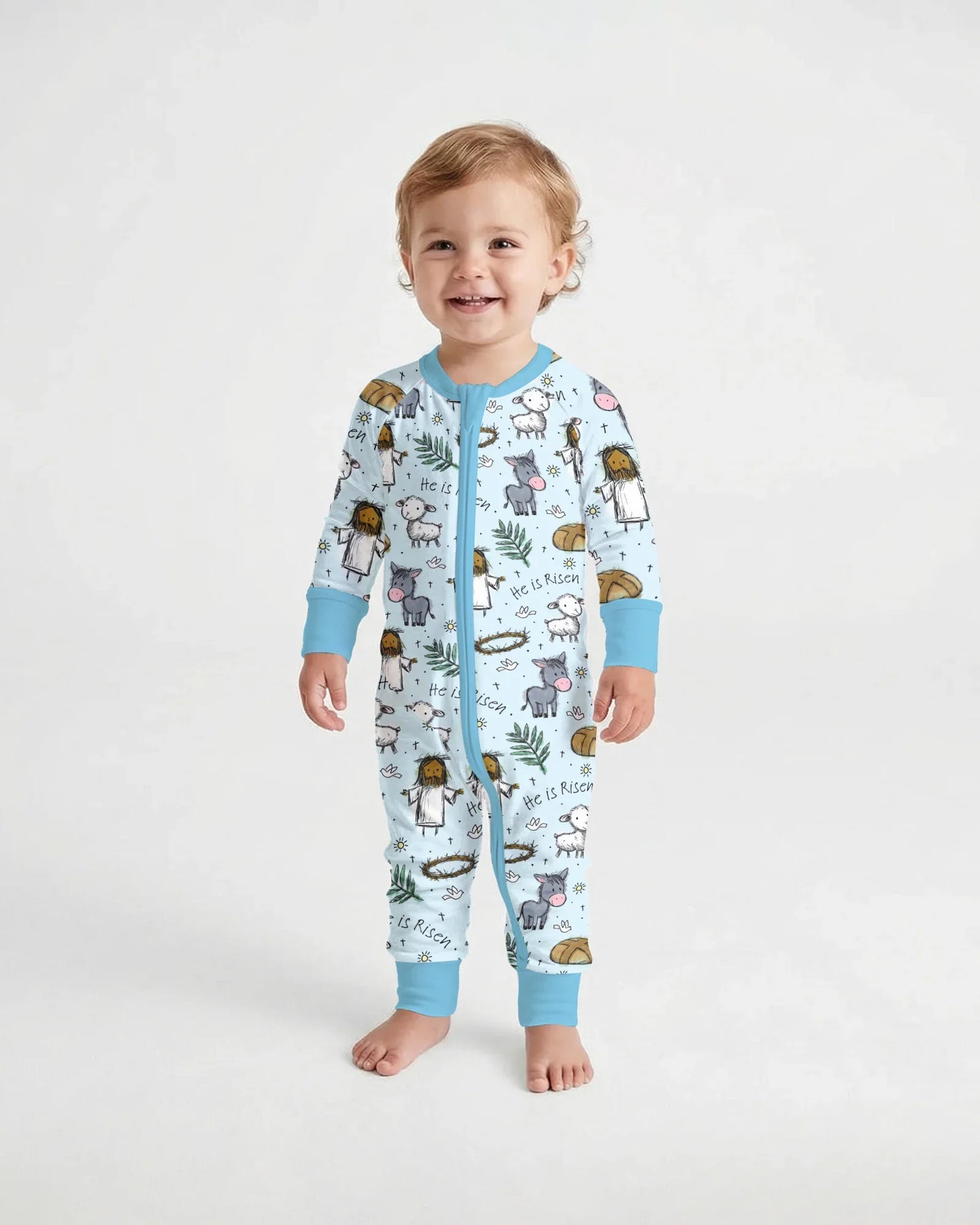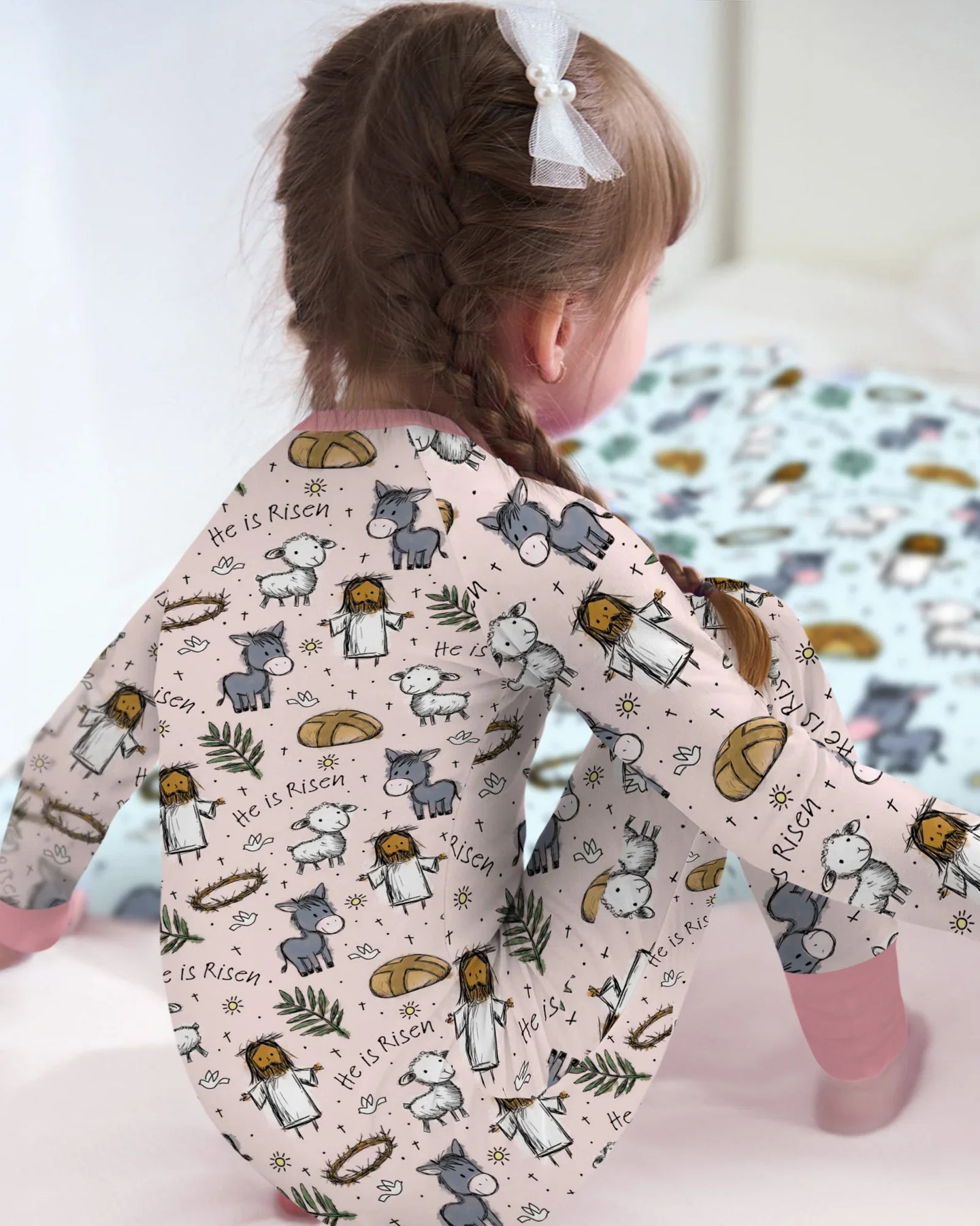 This sweet, faith-filled pattern features gentle illustrations of Jesus, lambs, donkeys, palms, bread, and the heartfelt message “He Is Risen” on a soft pastel background. Crafted from buttery-soft, breathable bamboo fabric, these pajamas keep everyone comfy day and night while honoring the true spirit of Easter. Perfect for family matching, church mornings, and cozy holiday moments filled with love and faith 🤍🐑