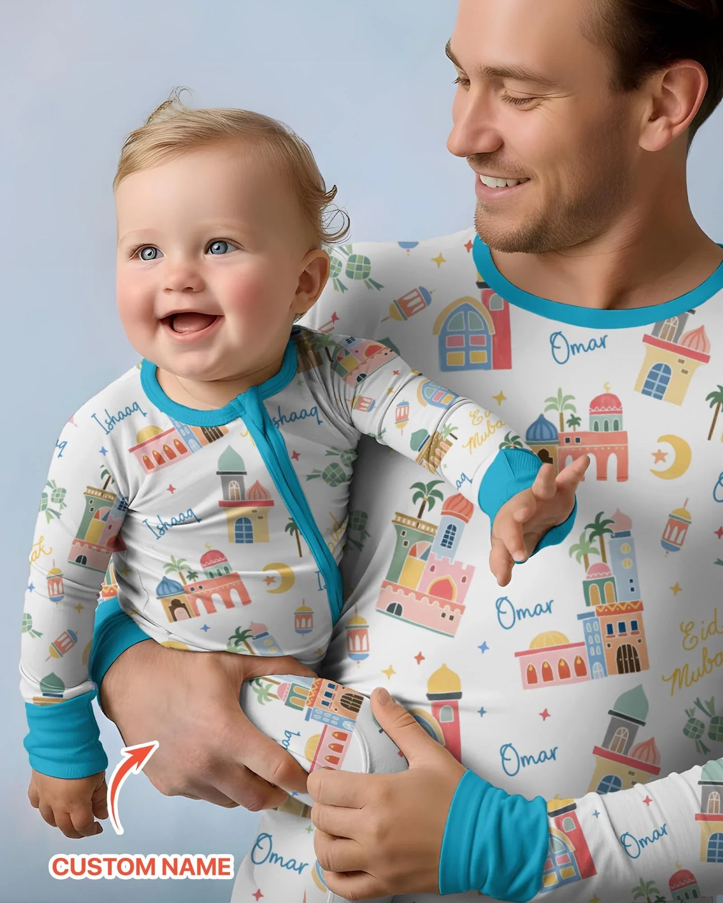 A joyful, personalized collection created to celebrate Eid in the most meaningful way. Featuring cheerful illustrations inspired by Islamic architecture, crescent moons, and festive details, each piece is thoughtfully designed to feel warm, playful, and family-centered.