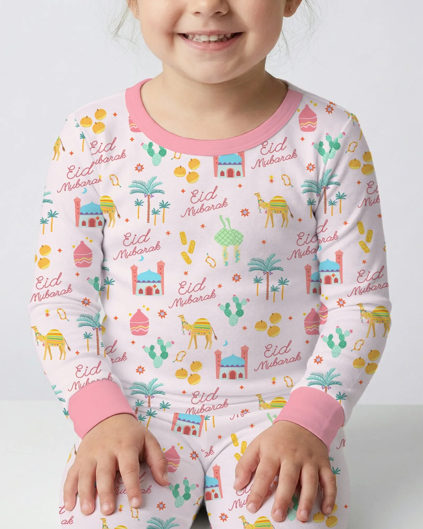 Fill your Eid celebrations with joy and unity in the Eid Mubarak Matching Family collection, featuring playful camels, palm trees, mosques, lanterns, and golden moons in soft pink and green pastels. "Eid Mubarak" script adds a heartfelt touch for families gathering to break the fast or share iftar.