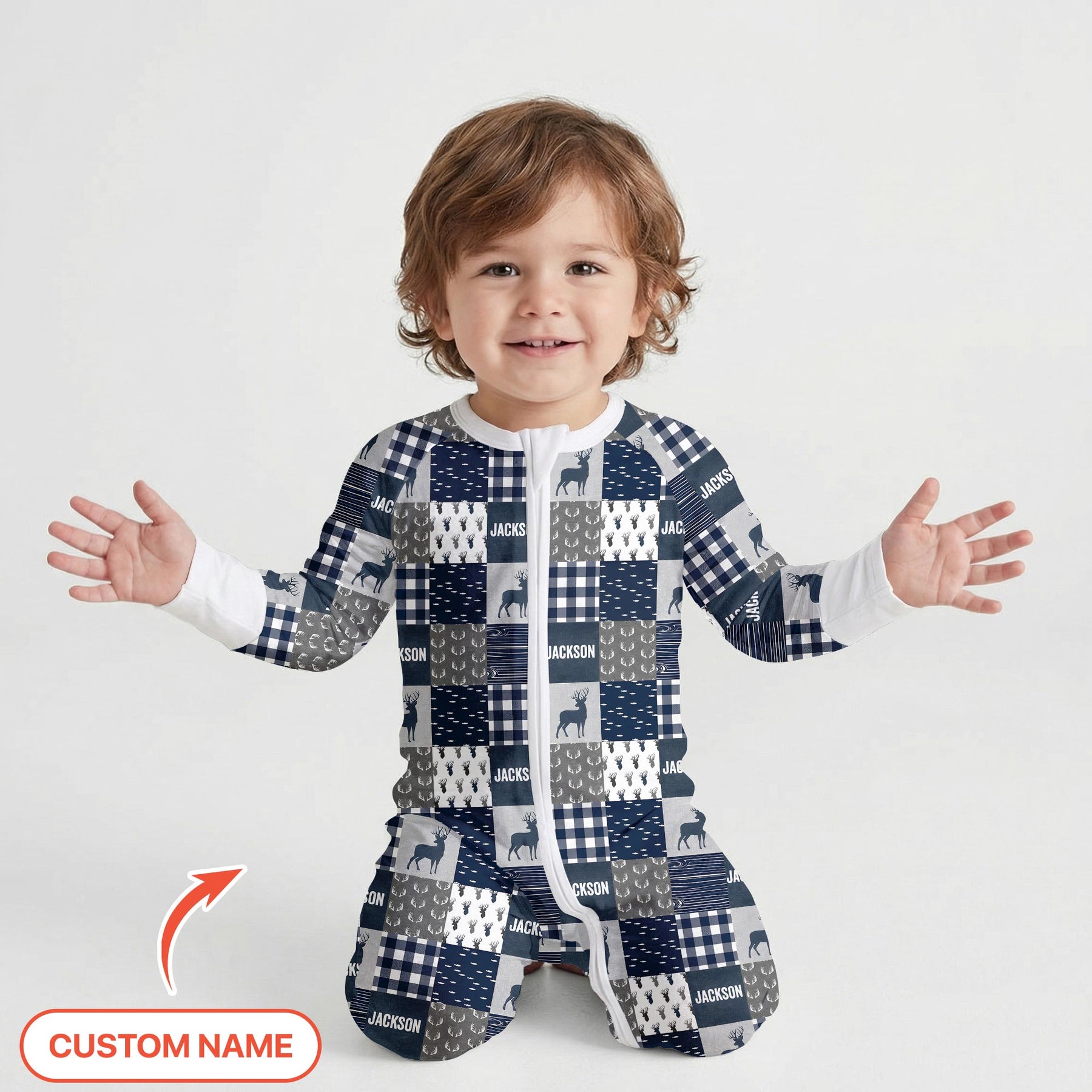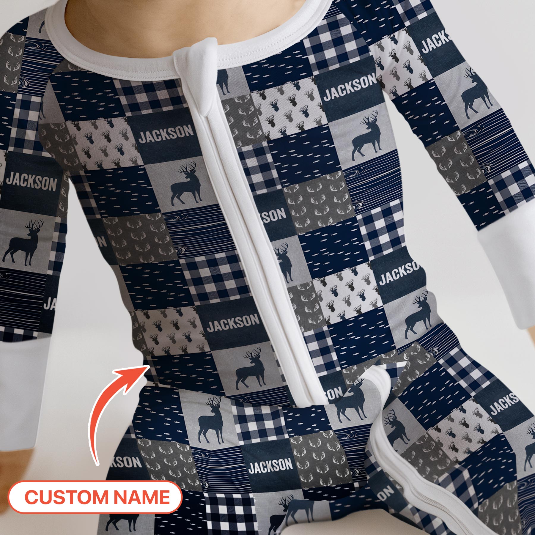 A creative grid-based layout that uses customized text as a decorative element. The high-contrast, sans-serif font ensures the name stands out against the navy and grey tones, blending personal touches with a timeless, coordinated aesthetic for father and child.