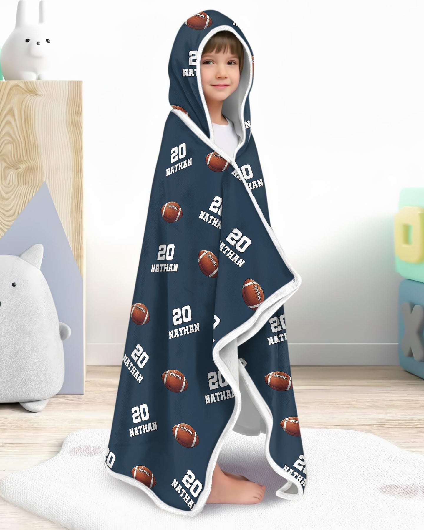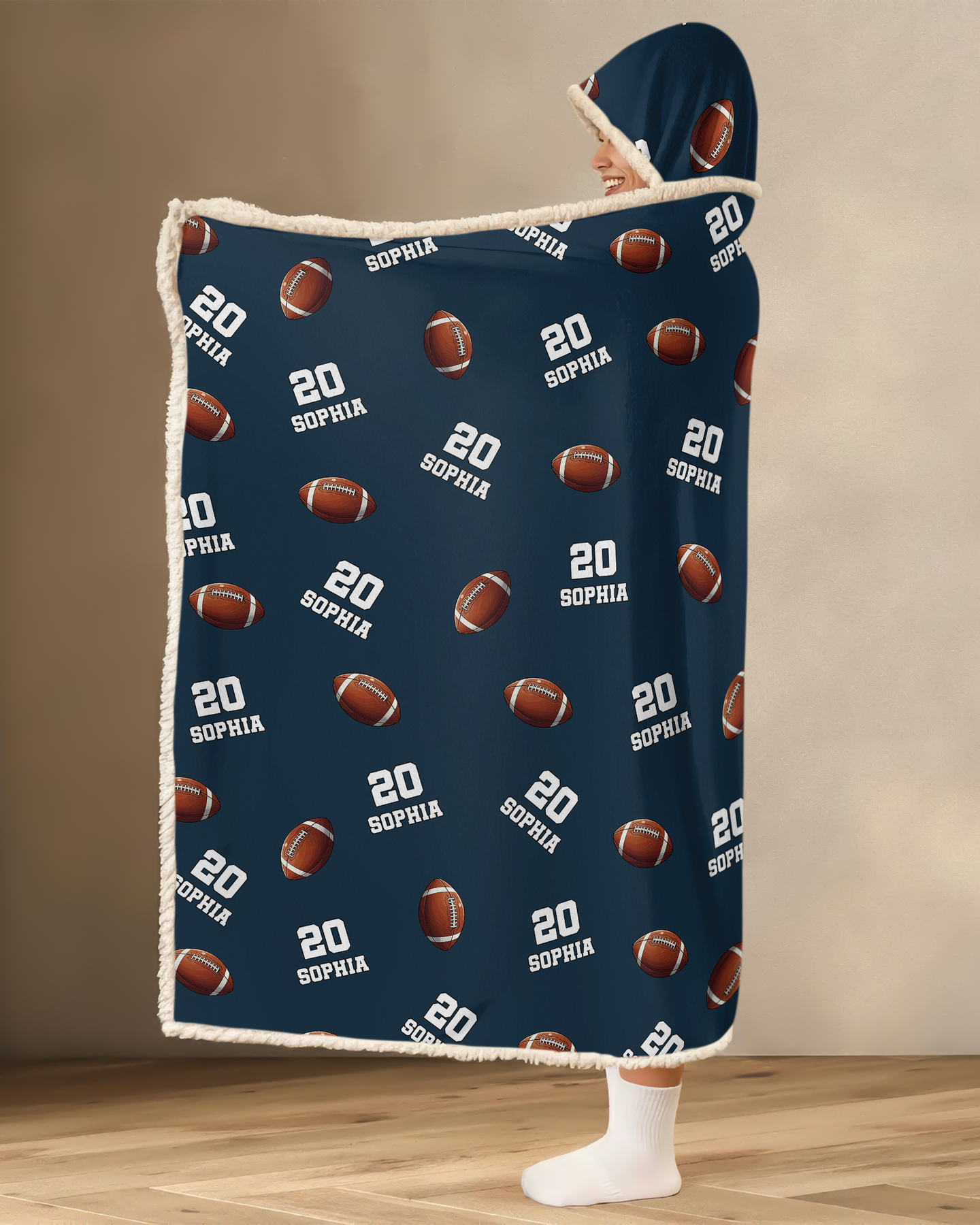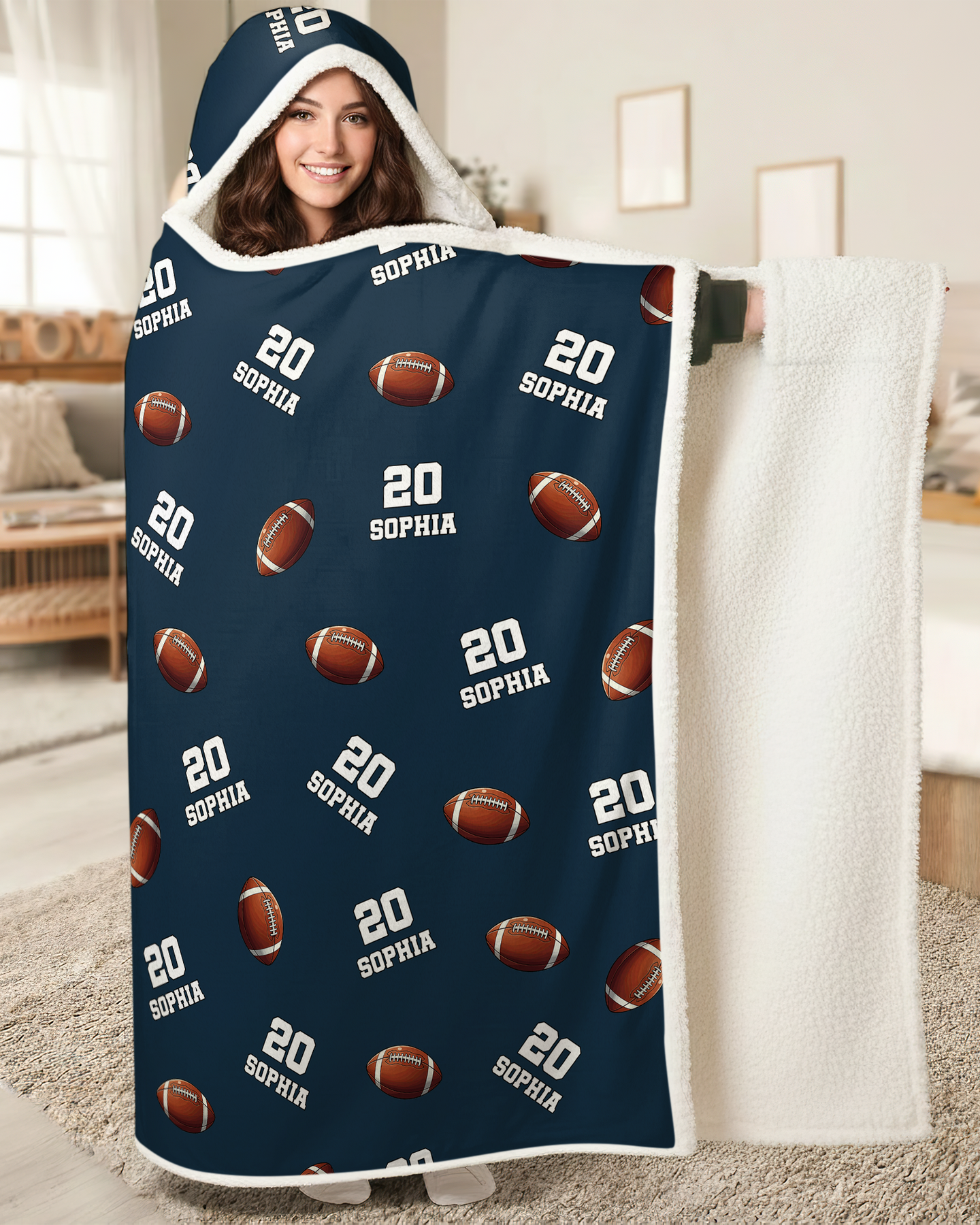 Score big on comfort with this premium hooded blanket, featuring a vibrant American football pattern and a plush lining perfect for chilly game nights. Personalize this cozy essential with a custom name and number to create a unique, one-of-a-kind gift for any dedicated sports fan.