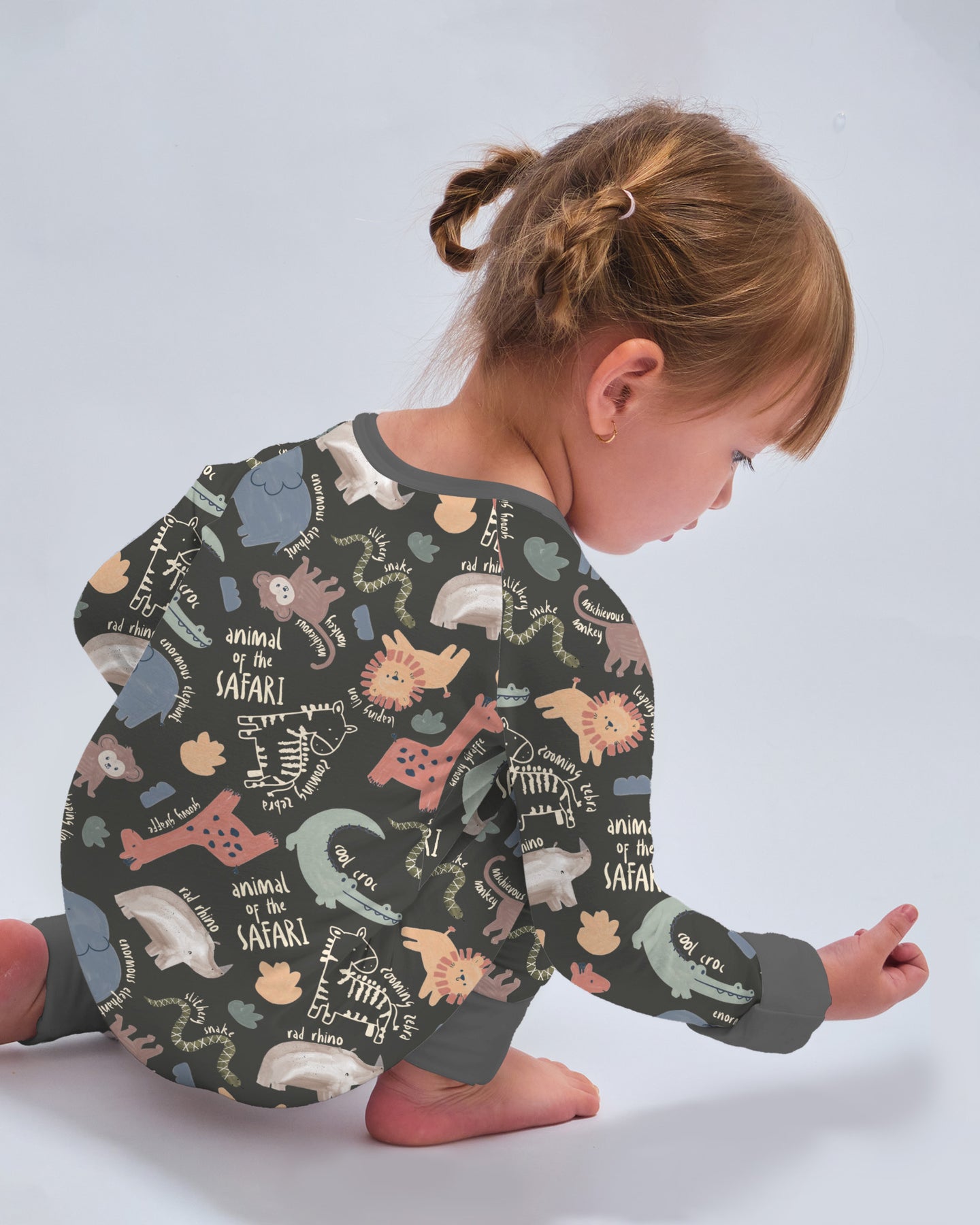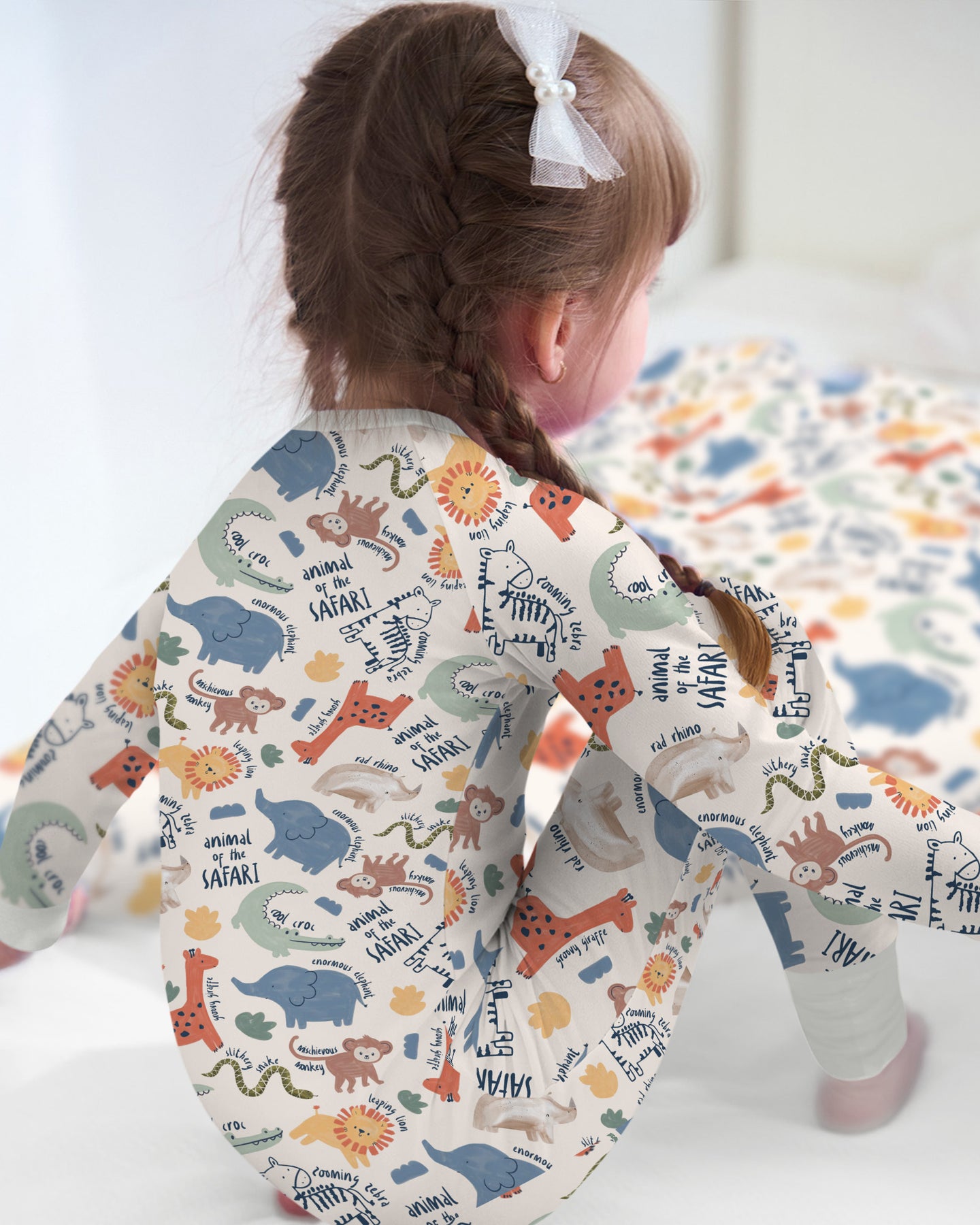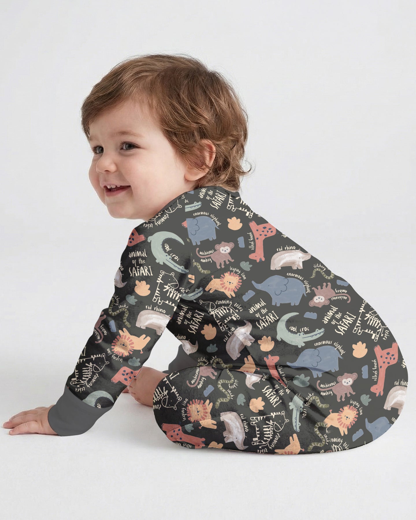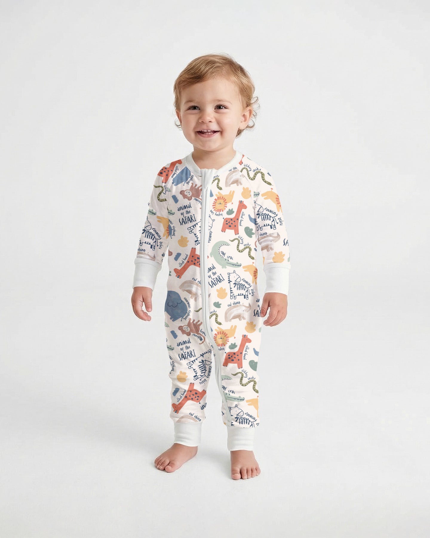 A cheerful safari-themed collection featuring playful animal illustrations and soft neutral tones, crafted for breathable comfort across kids’ sleepwear, loungewear, and everyday essentials.