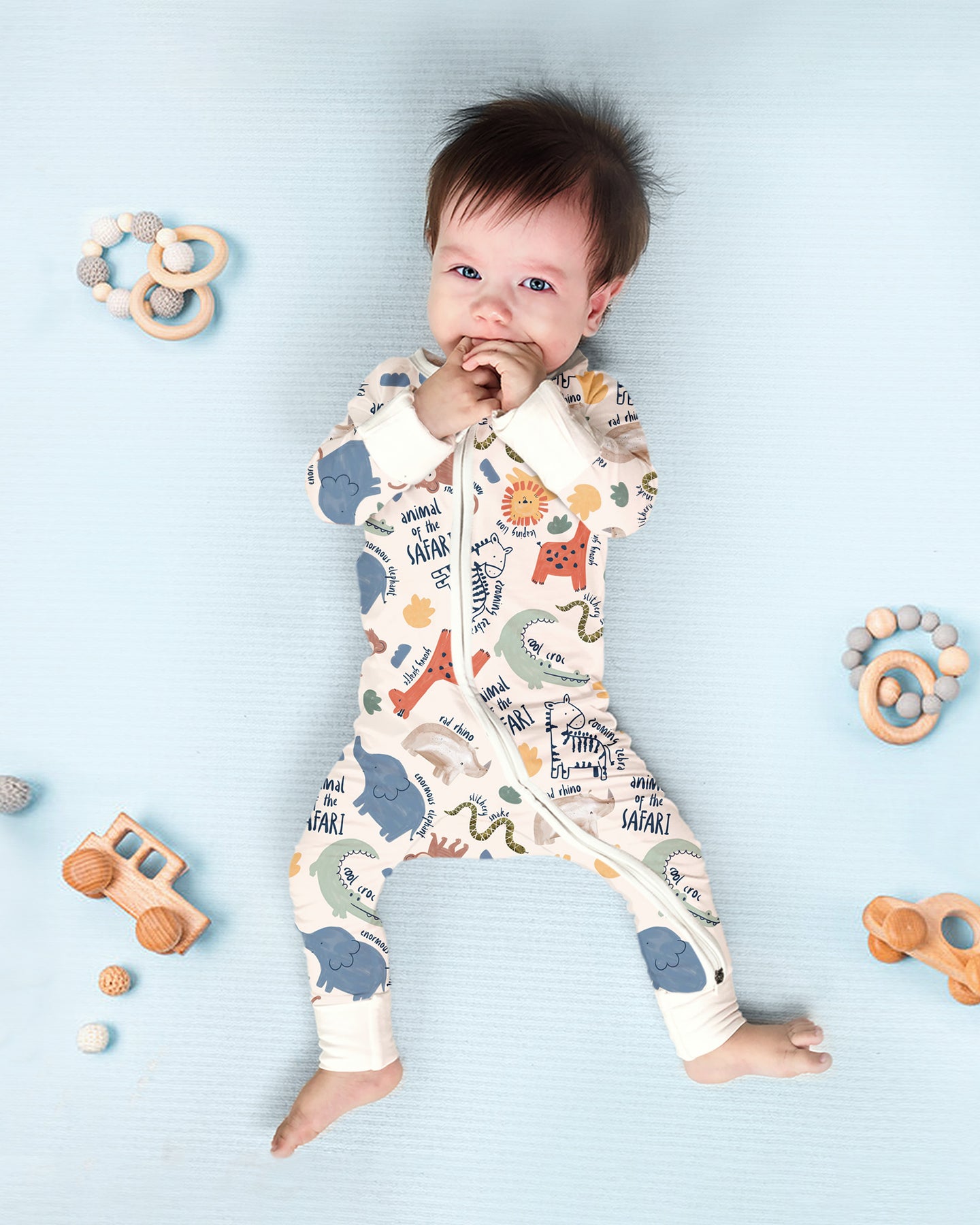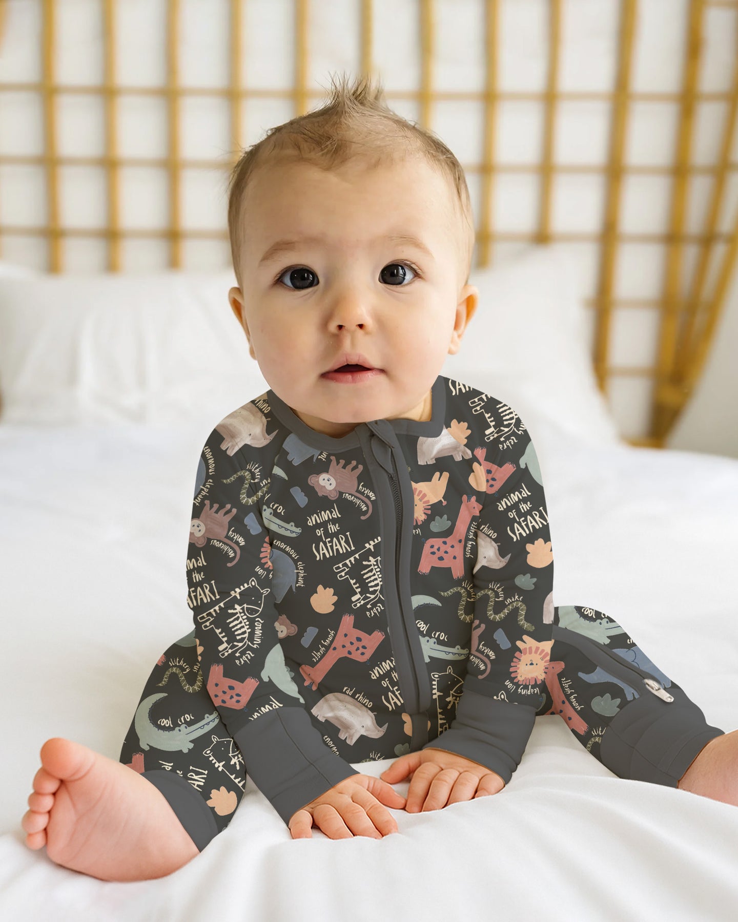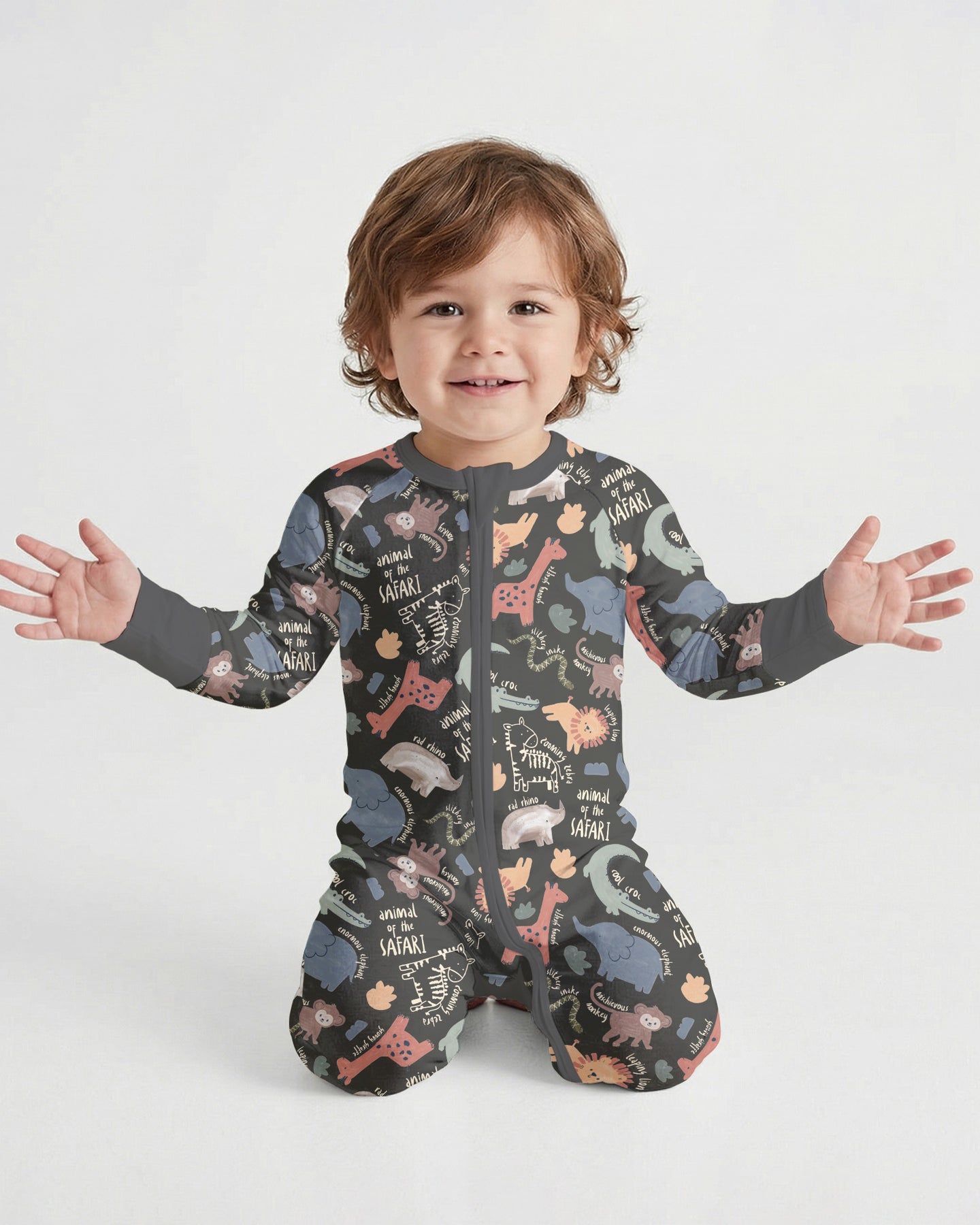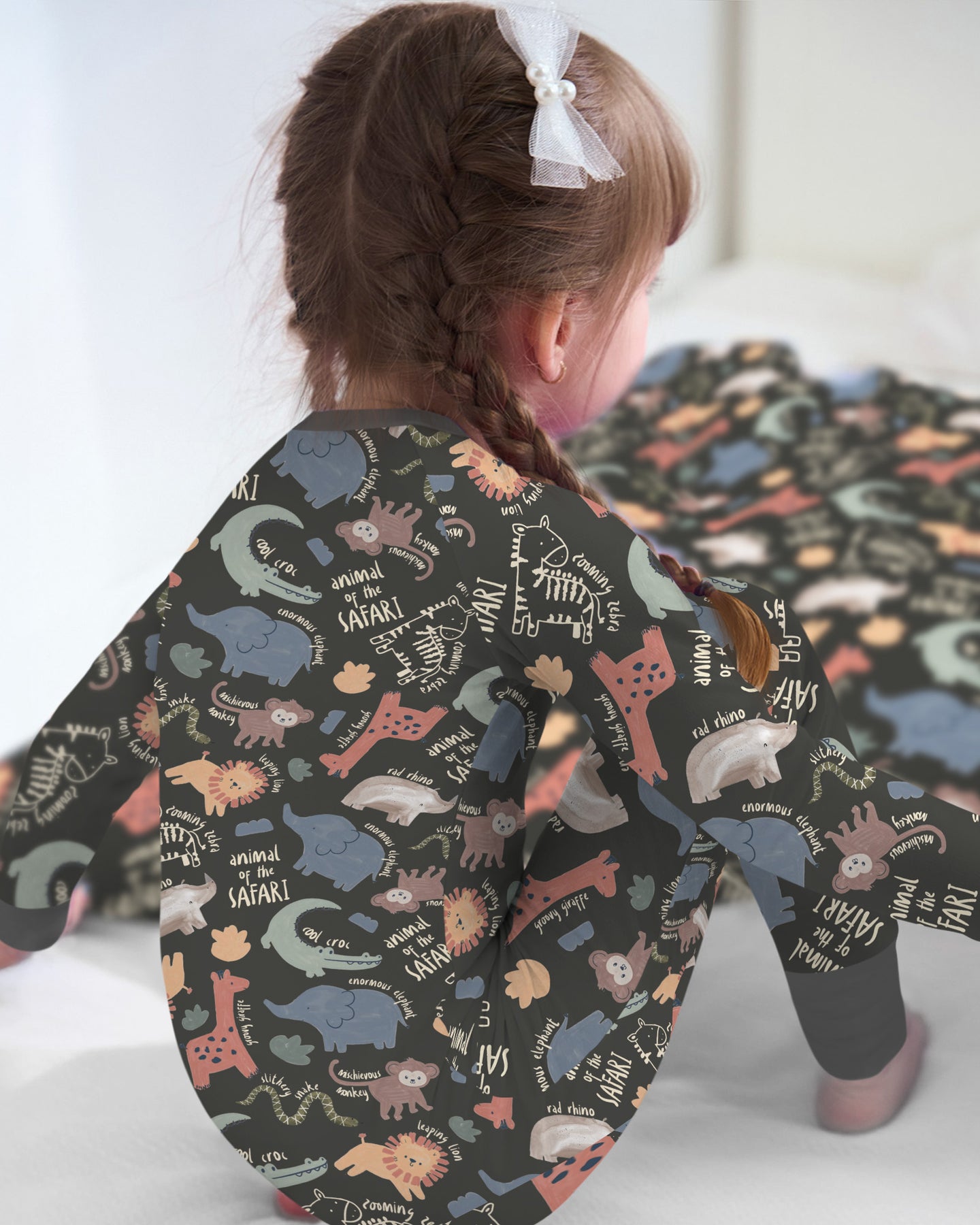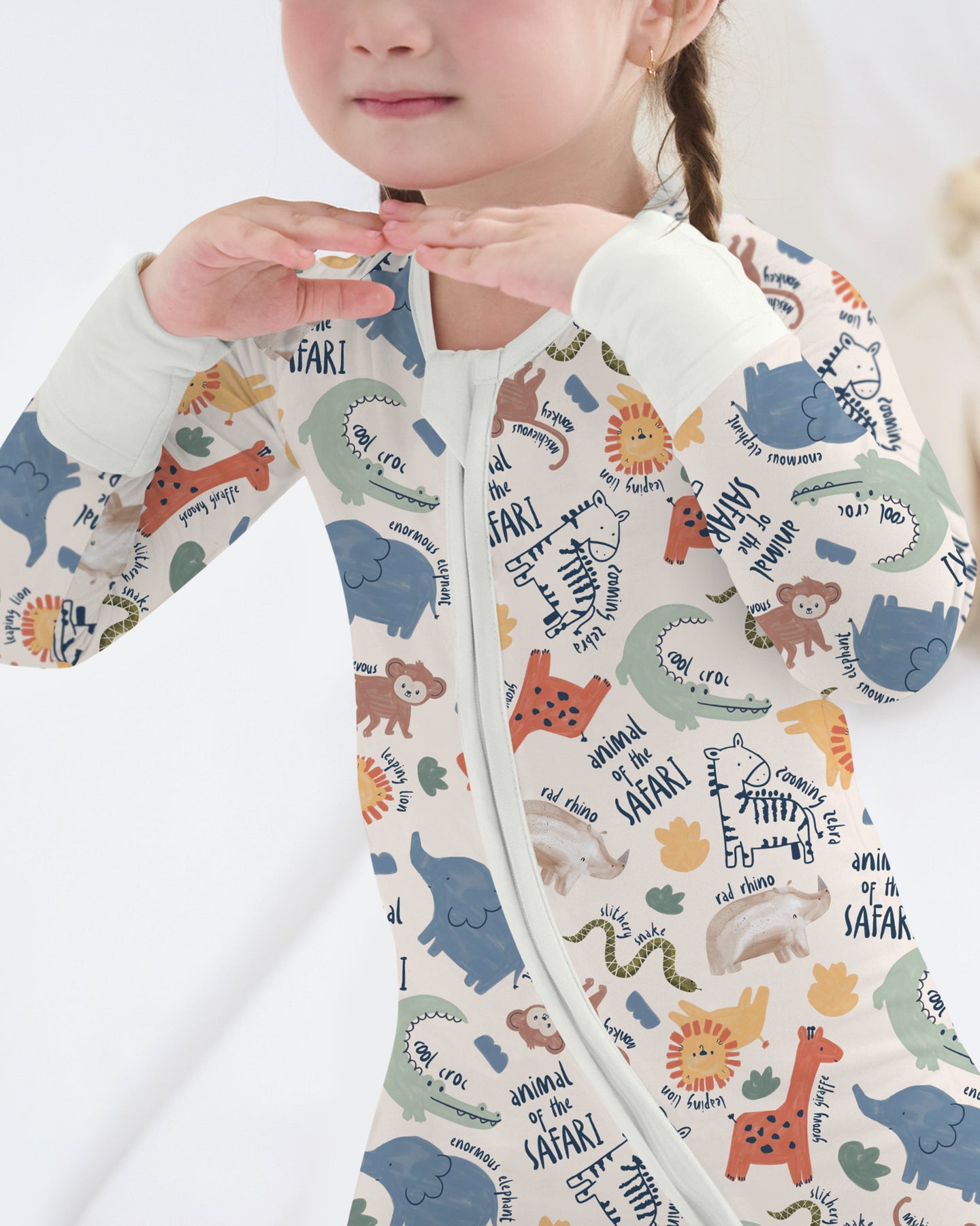 A cheerful safari-themed collection featuring playful animal illustrations and soft neutral tones, crafted for breathable comfort across kids’ sleepwear, loungewear, and everyday essentials.