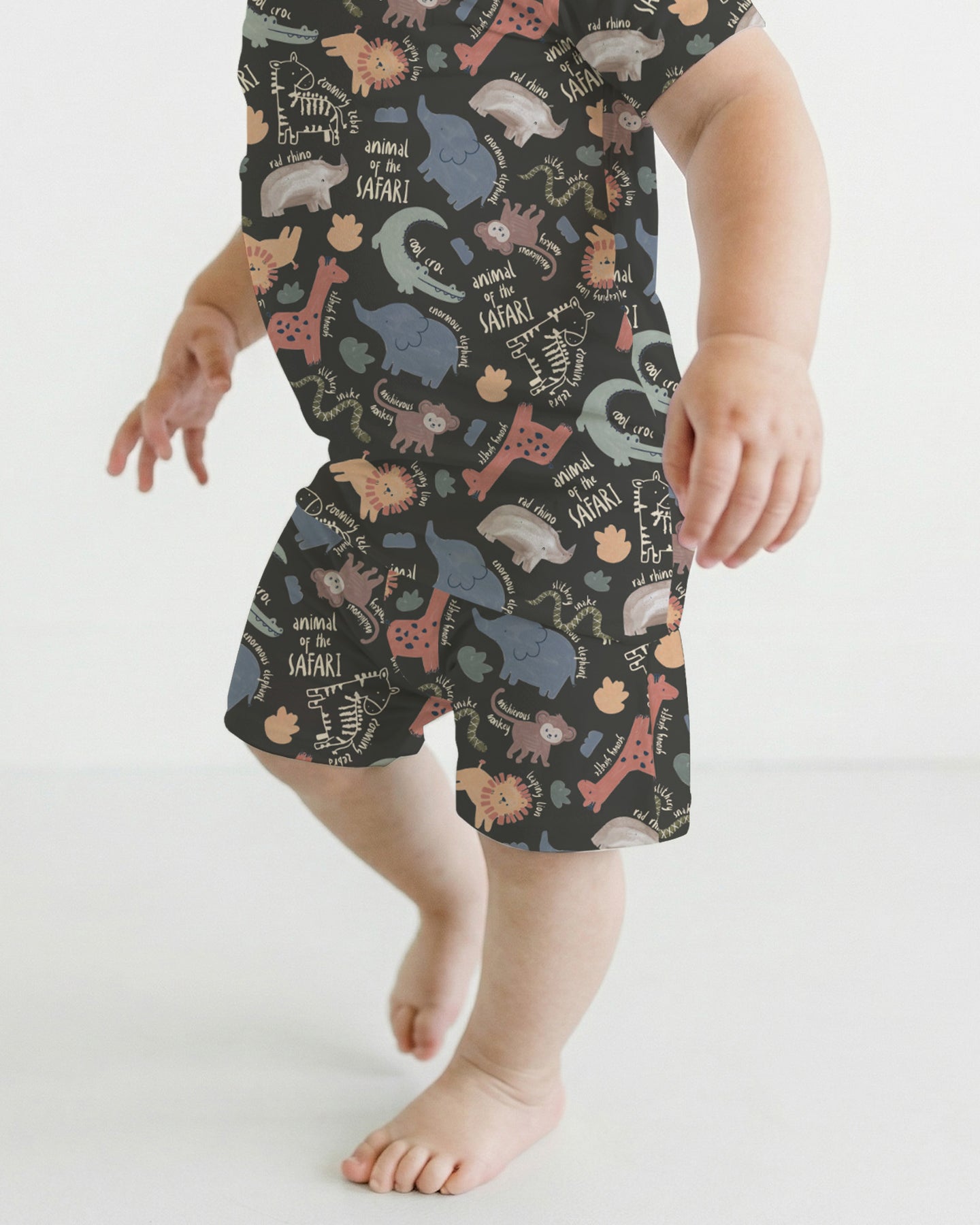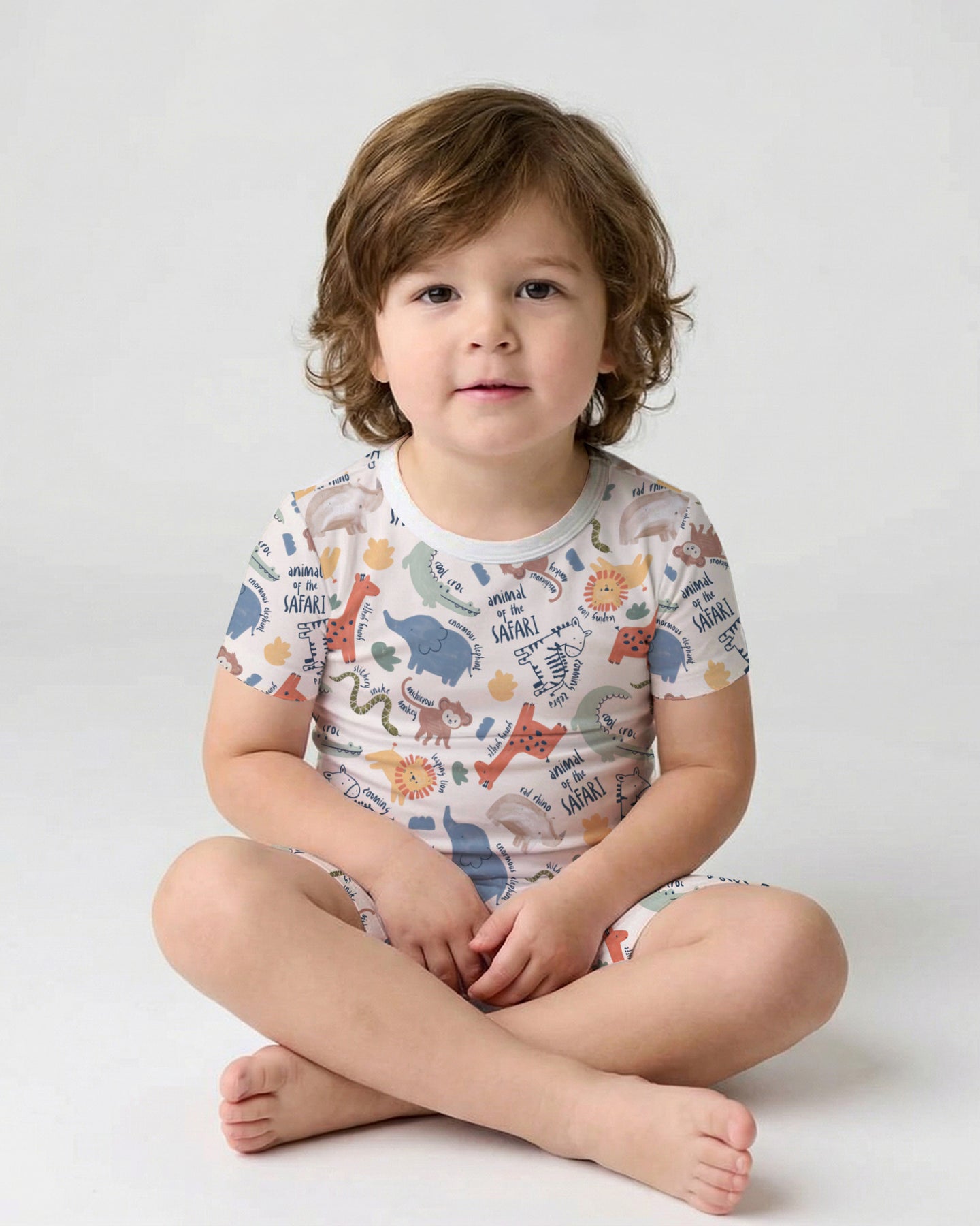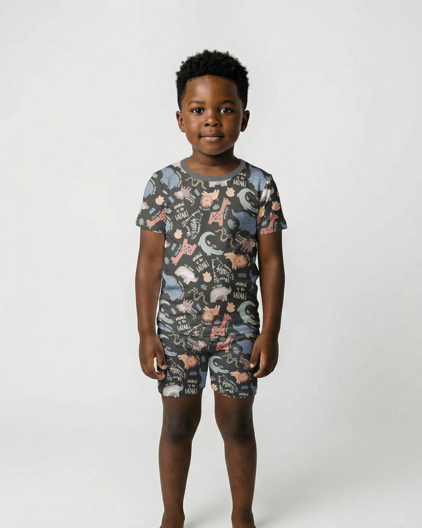 A cheerful safari-themed collection featuring playful animal illustrations and soft neutral tones, crafted for breathable comfort across kids’ sleepwear, loungewear, and everyday essentials.