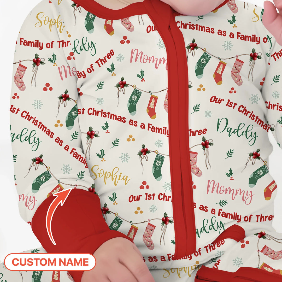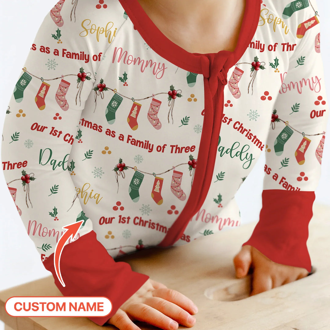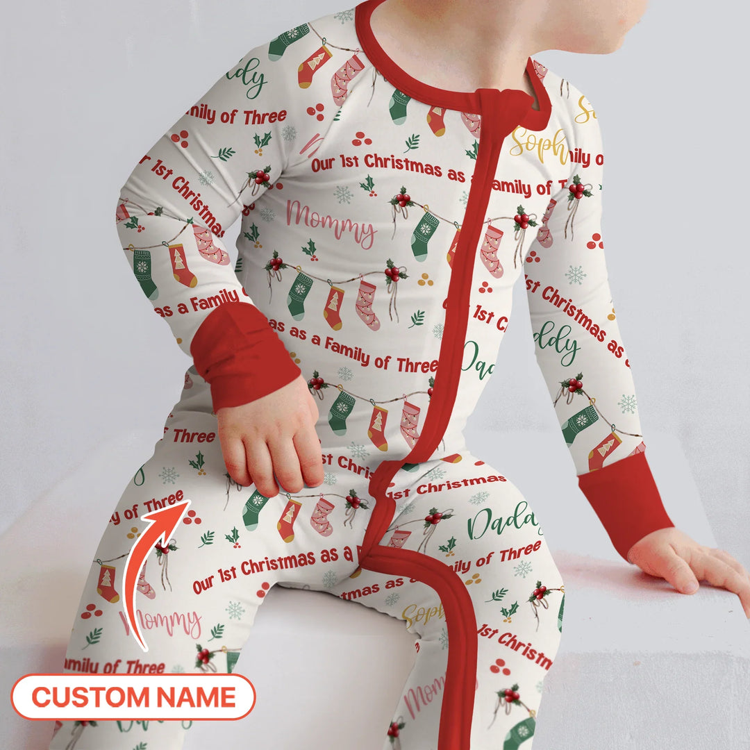 Celebrate cozy family moments with our Custom Name Family Christmas Stockings Zippy & Pajamas. Crafted from buttery-soft, breathable bamboo fabric, these PJs feature a charming stockings print and can be personalized with your family’s names. Perfect for matching holiday photos, cuddles, and Christmas morning fun!