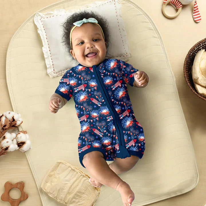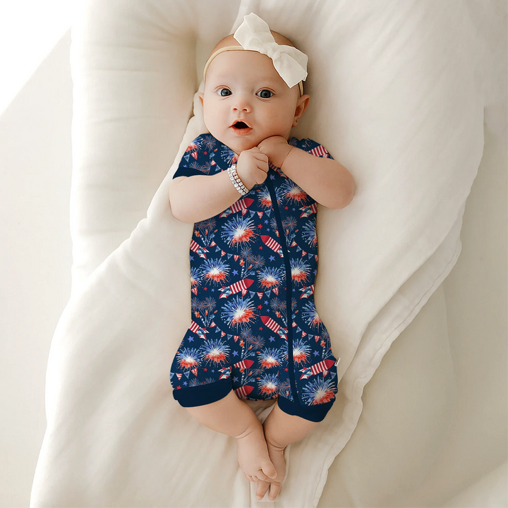 Made from buttery-soft Bamboo, this romper showcases a patriotic 4th of July design, providing gentle comfort for delicate skin. The double zipper ensures quick and easy diaper changes, making it the perfect pick for warm holiday festivities.