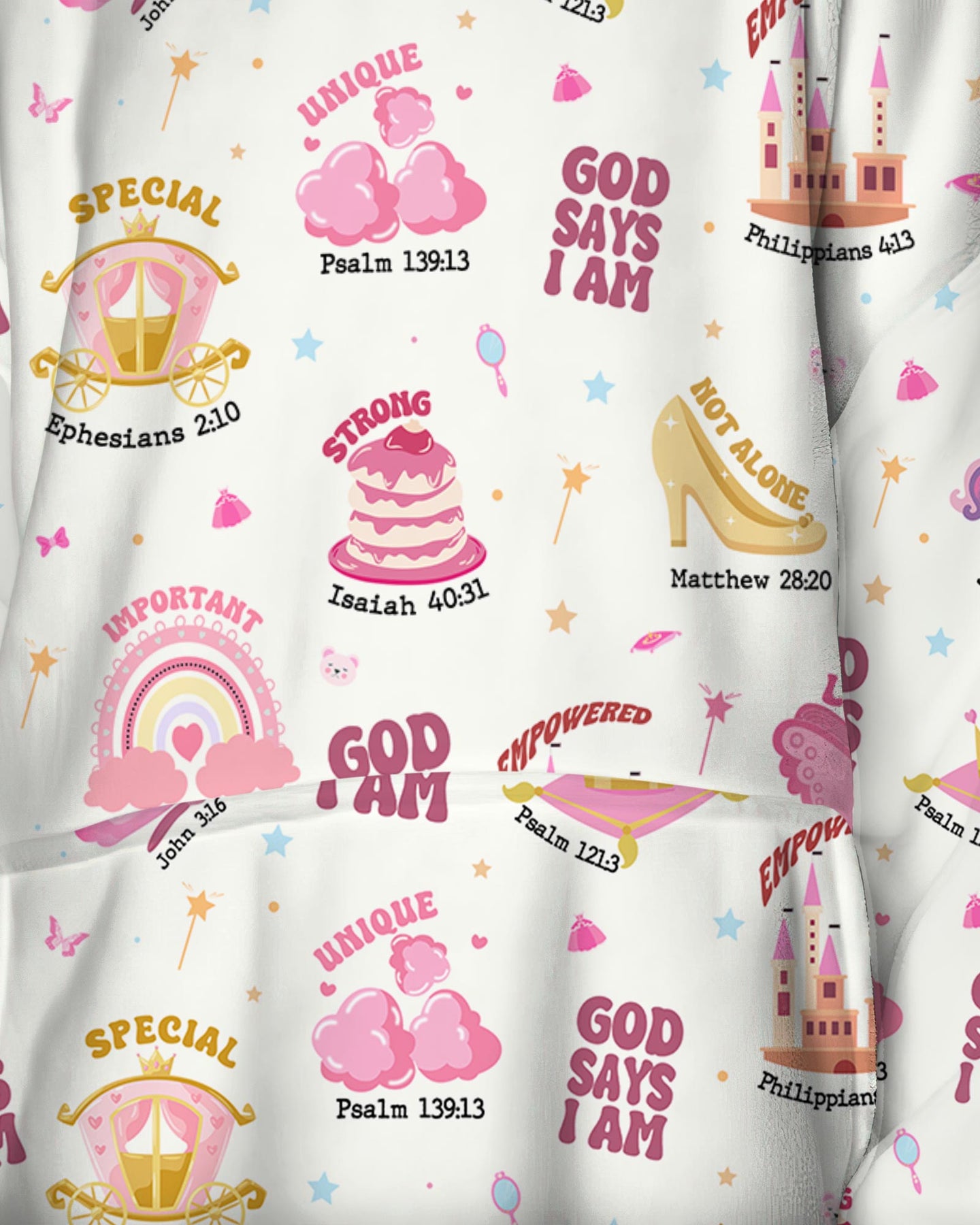 CHOSEN unicorns, PROTECTED crowns, UNIQUE rainbows, and STRONG birthday cakes, this dreamy princess print surrounds your little royal with uplifting words and cloud-soft bamboo for the sweetest, most magical sleep.