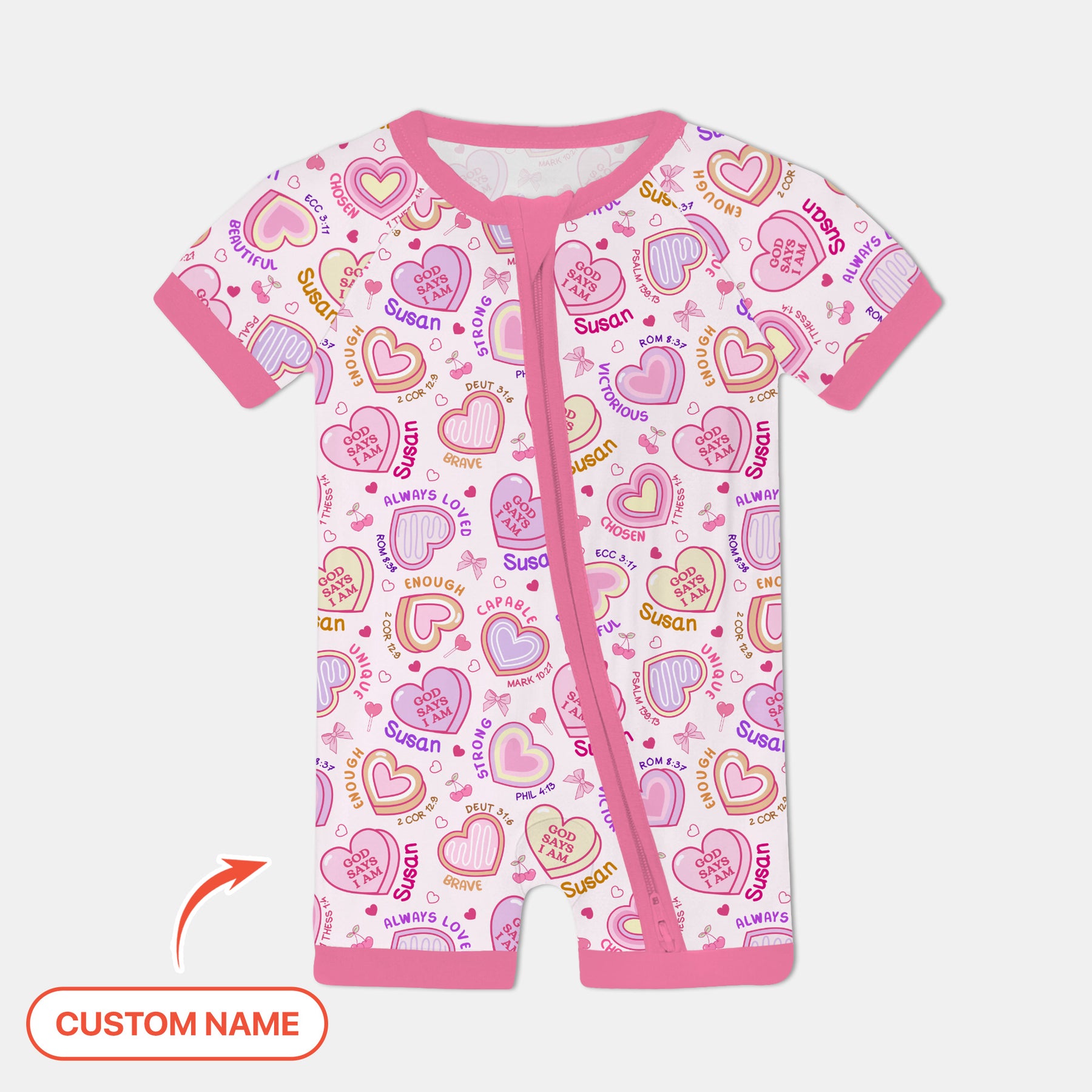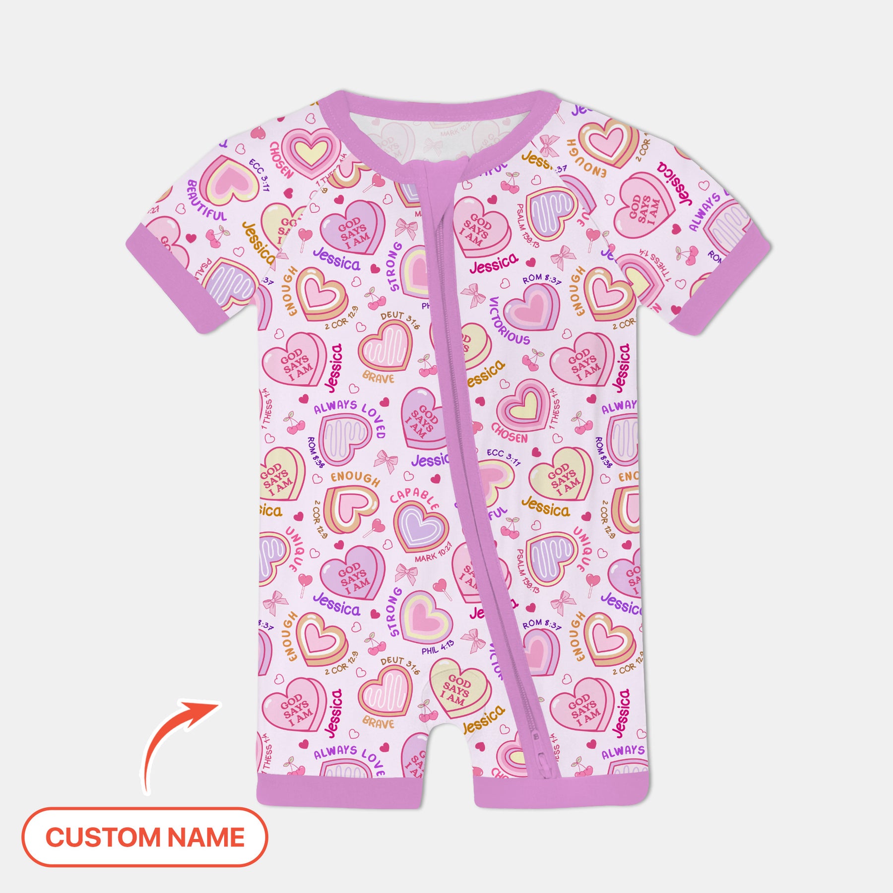 Celebrate love, identity, and faith with our God Says I Am Sweet Heart Matching Mommy & Baby Collection. Filled with adorable candy-heart–inspired affirmations like Chosen, Loved, Enough, Strong, and more, each piece wraps you and your little one in positivity and warmth.