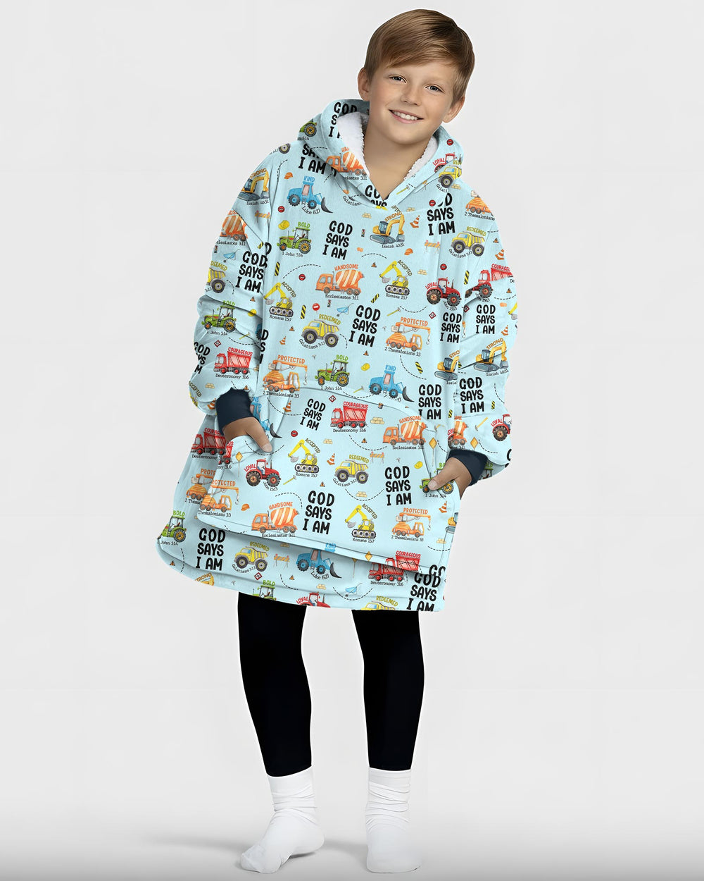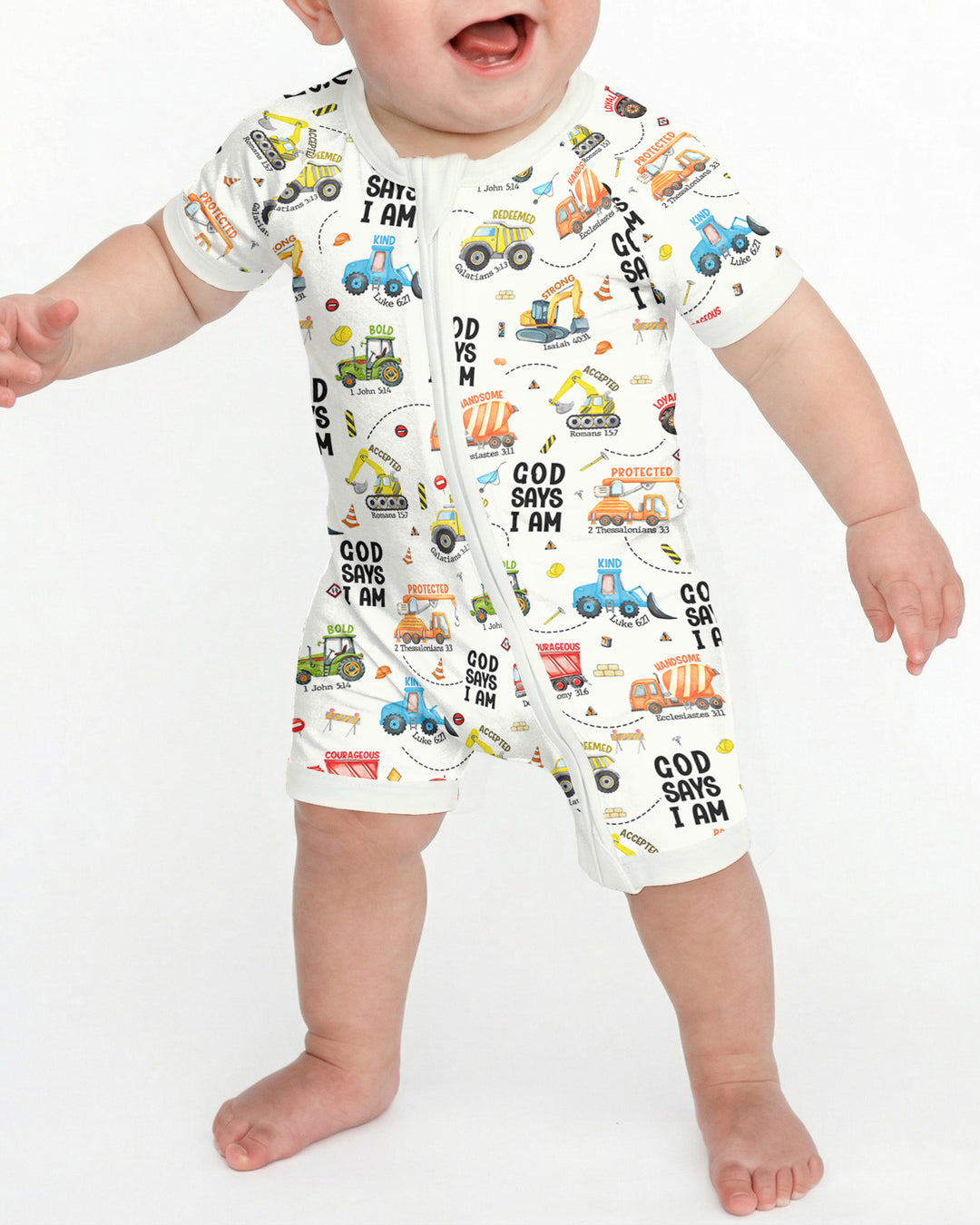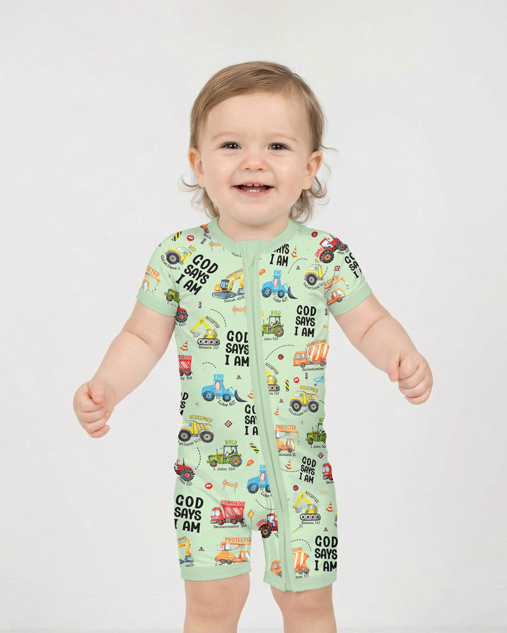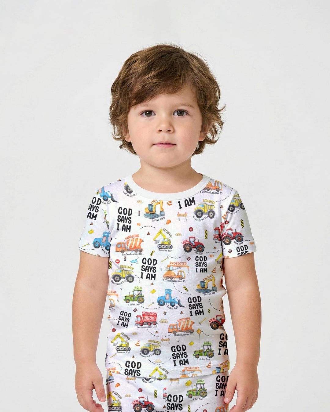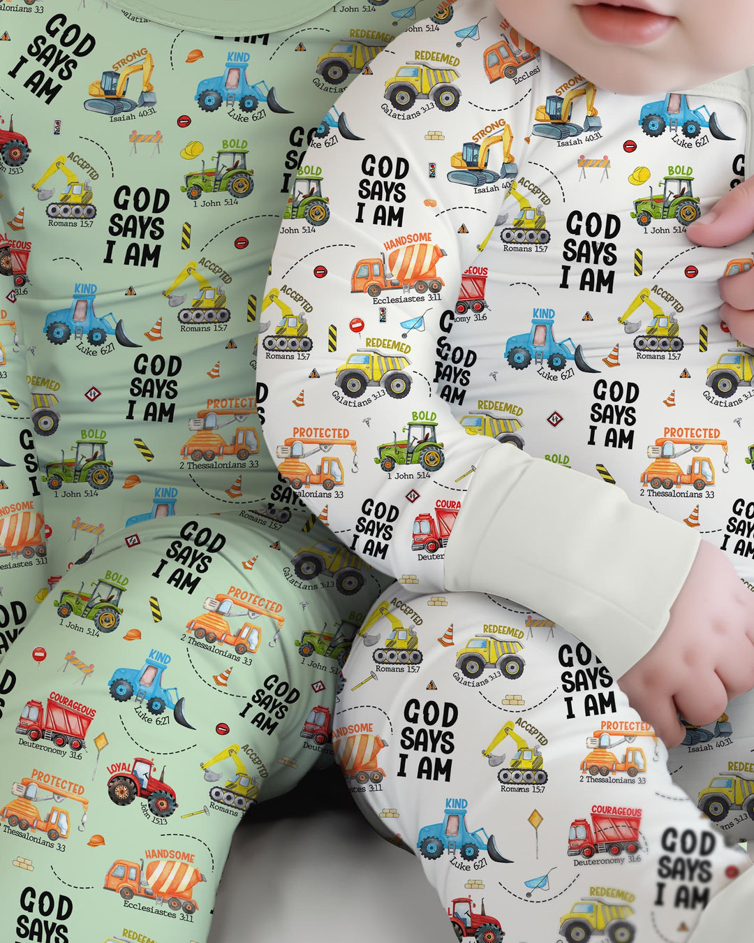 Gear up for faith-filled fun with our “God Says I Am” Construction Collection! These bamboo pajamas for babies and kids are packed with bright, playful trucks and uplifting Bible affirmations—reminding little ones of their strength, courage, and worth in God’s eyes. Made from ultra-soft, breathable bamboo fabric, they’re perfect for active days, cozy nights, and every joyful moment in between.