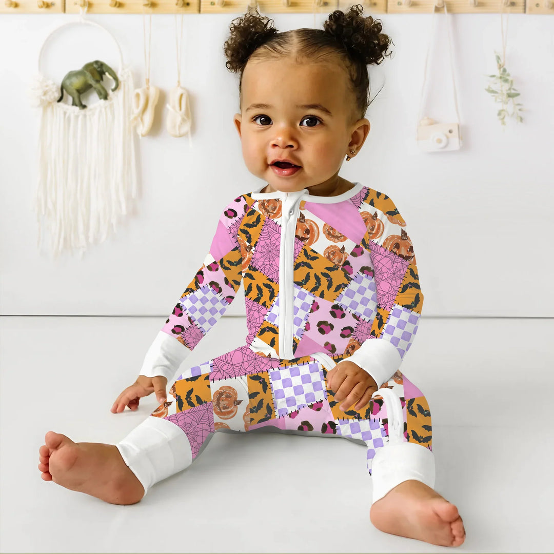 Get your little pumpkin ready for spooky season with our Halloween Patchwork Bodysuit! Featuring playful blocks of smiling jack-o’-lanterns, fluttering bats, cobwebs, and festive colors of orange, pink, and purple, this design is full of trick-or-treat charm. Made from soft, breathable fabric, it keeps baby comfy while adding a pop of Halloween fun to every cuddle, nap, and adventure.