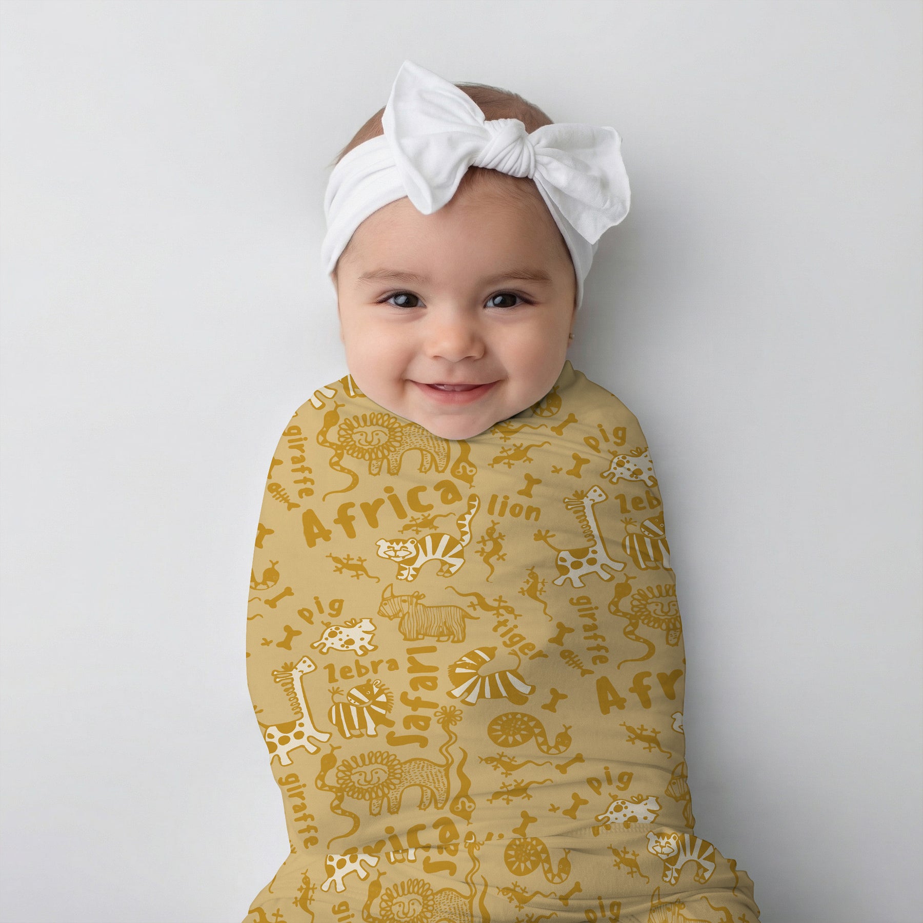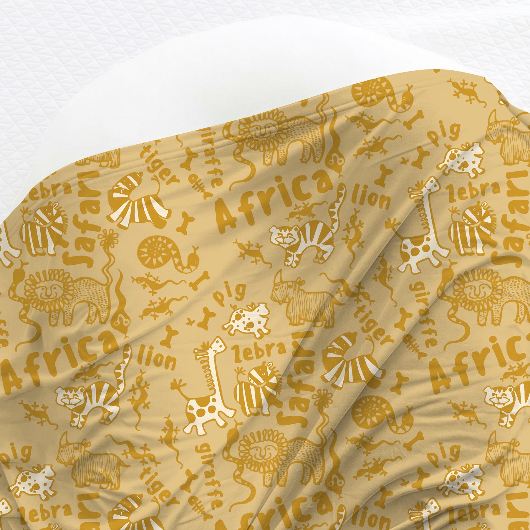 Safari Africa Collection – A playful African safari print featuring lions, giraffes, and jungle icons, made with ultra-soft, breathable fabric and available across matching sleepwear and accessories for babies and kids.