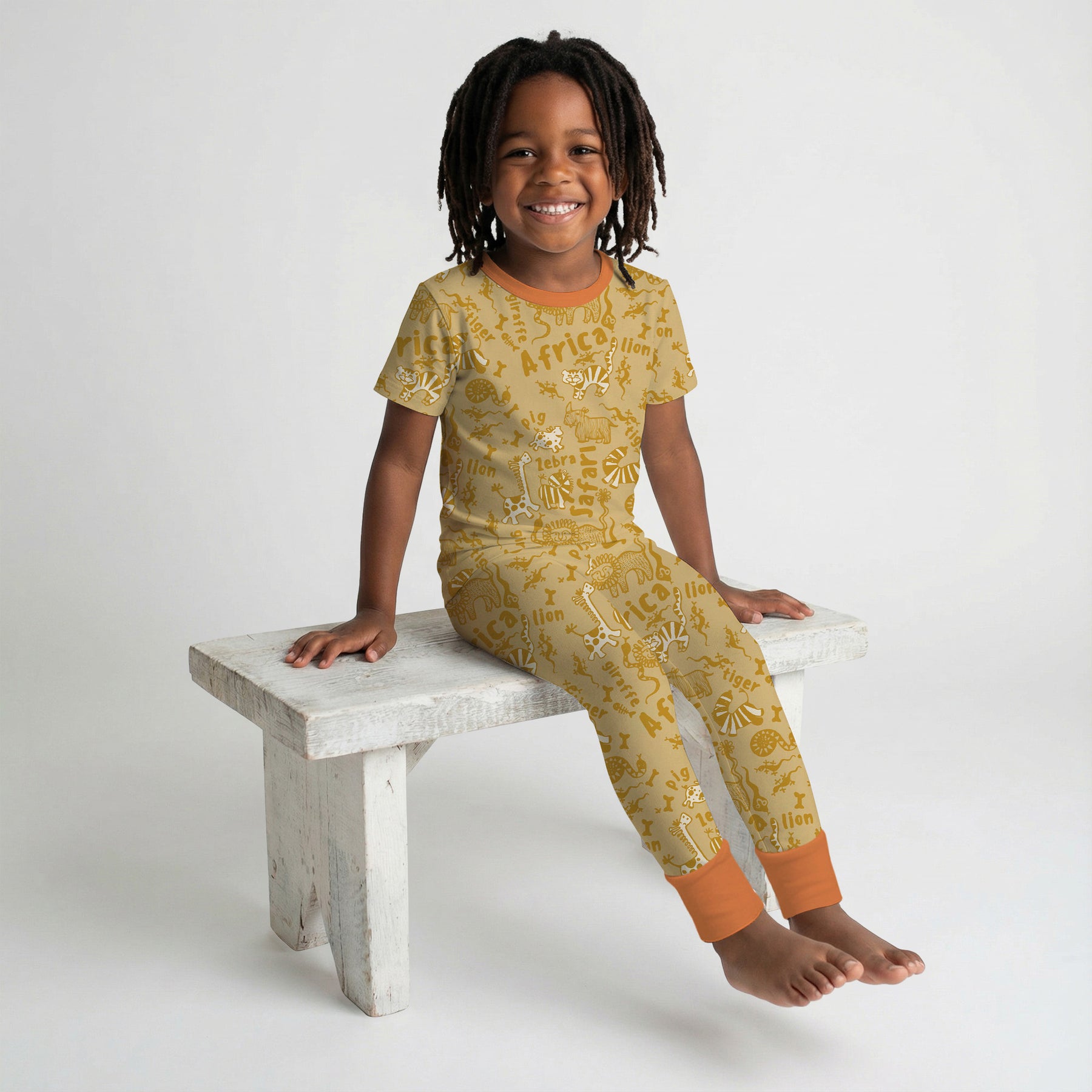 Safari Africa Collection – A playful African safari print featuring lions, giraffes, and jungle icons, made with ultra-soft, breathable fabric and available across matching sleepwear and accessories for babies and kids.