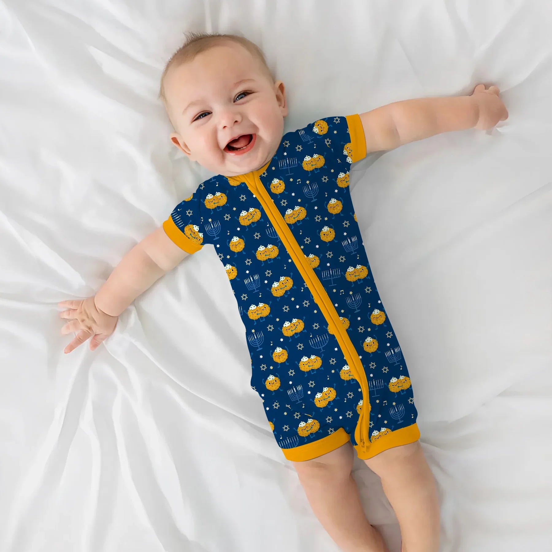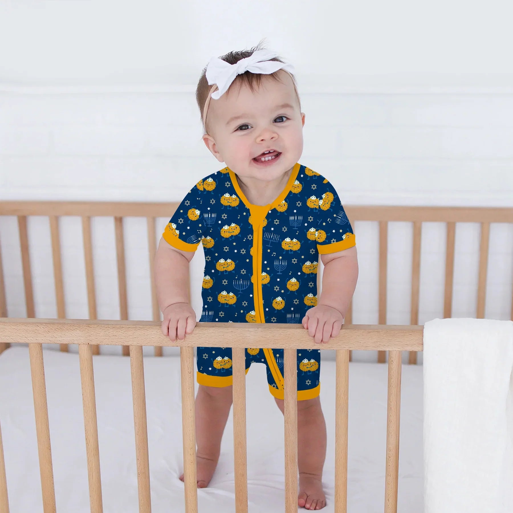 Celebrate Hanukkah in cozy style with our Sweet Latke Collection! Featuring adorable smiling latkes, menorahs, and stars on a deep blue background — this soft, breathable bamboo set brings warmth, joy, and festive charm to every little one’s wardrobe. Perfect for family holiday fun!