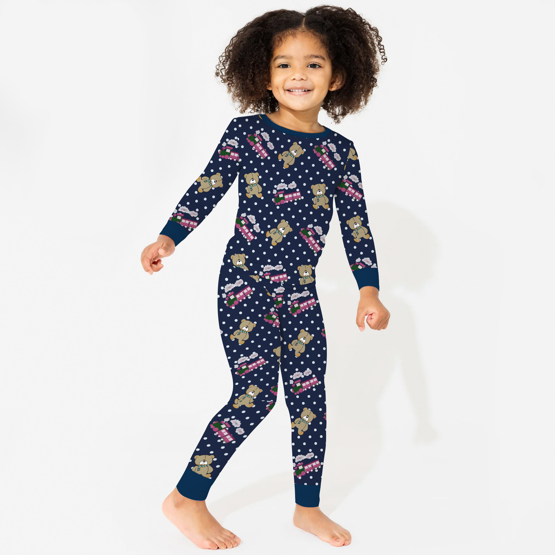 This product is a festive Christmas-themed kids’ pajama set, made from soft fabric and designed for both comfort and holiday cheer. The pajama features a deep navy background with an all-over print of adorable teddy bears holding presents, alongside stacks of pink-and-green gift boxes accented with bows, and white polka dots resembling falling snow. The design is finished with solid navy cuffs on the sleeves, ankles, and neckline, giving it a classic and cozy winter look. Perfect for holiday photos, Christmas Eve celebrations, or snuggly nights, this pajama set blends playful charm with festive spirit.