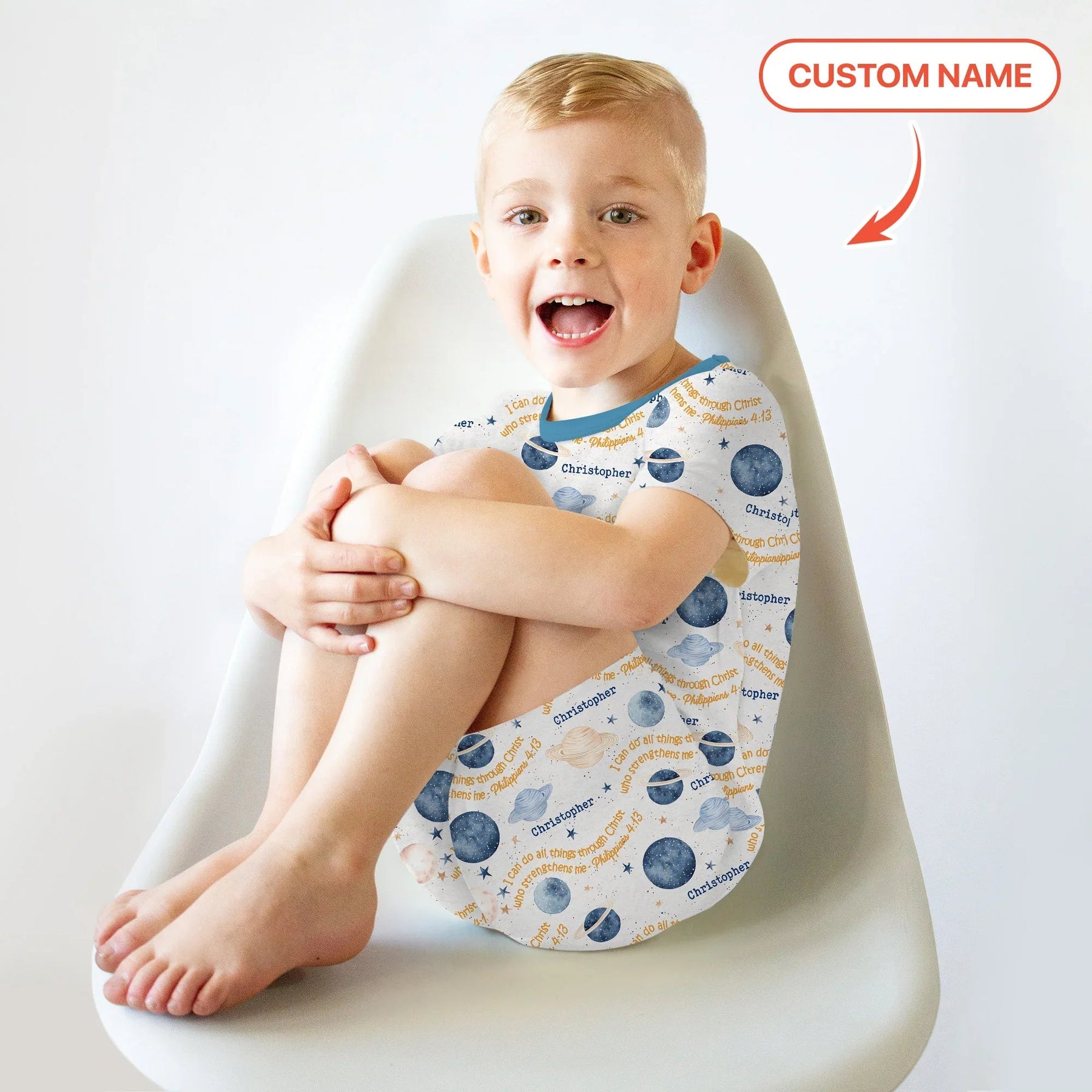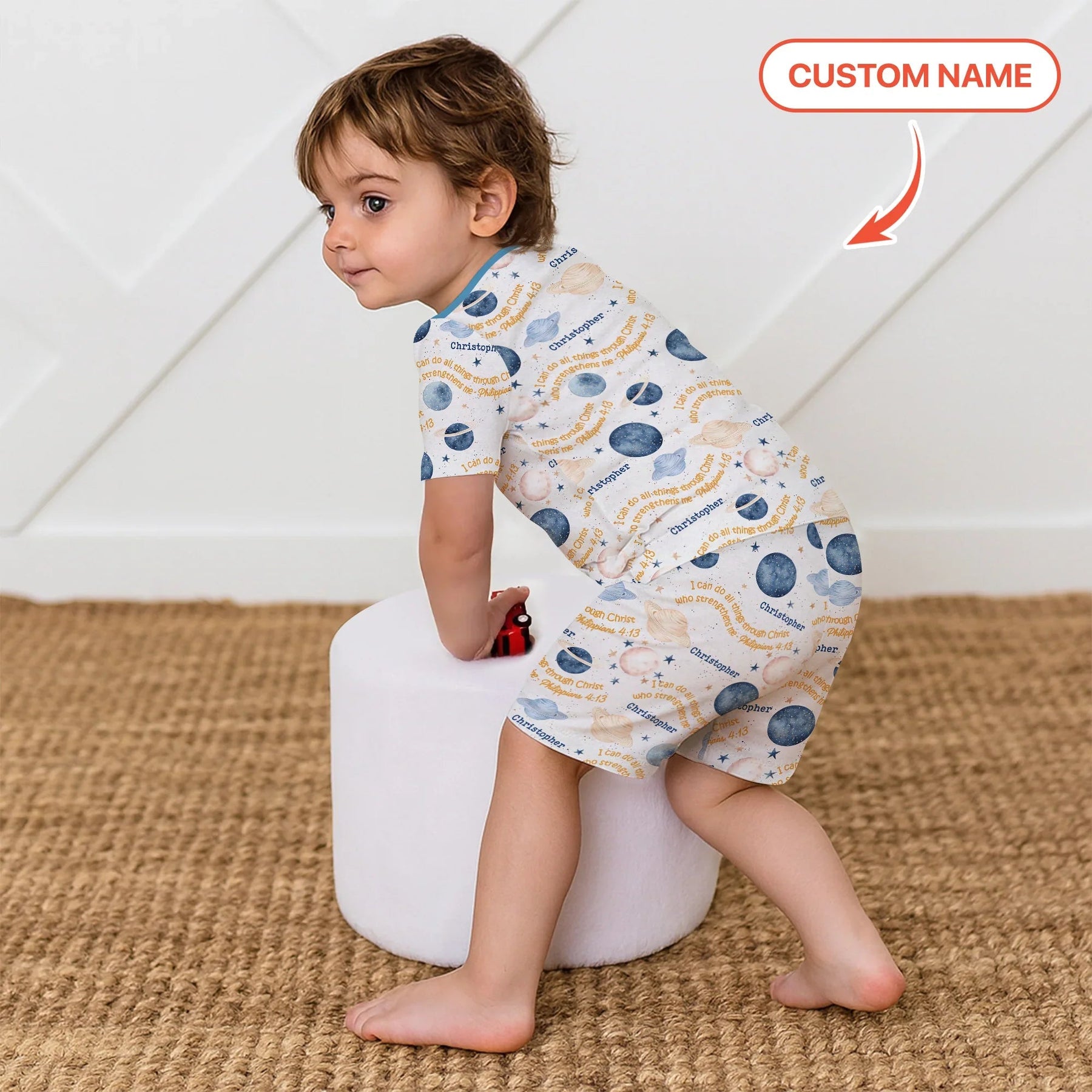 | Let your little one dream big and shine bright with faith! The I Can Do All Things Through Christ Collection brings Philippians 4:13 to life in a playful, colorful way — reminding every child that with God’s strength, nothing is impossible. Each pajama set features your child’s custom name, beautifully blended into a pattern of rainbows and clouds for girls 🌈, or planets and stars for boys 🌙 — symbolizing hope, courage, and limitless potential. Soft, cozy, and filled with love, these pajamas are more than bedtime wear — they’re a nightly reminder that your little one is strong, capable, and wonderfully made through Christ. 💖 Perfect for faith-filled families who want every bedtime to end with comfort, confidence, and God’s word close to heart. |