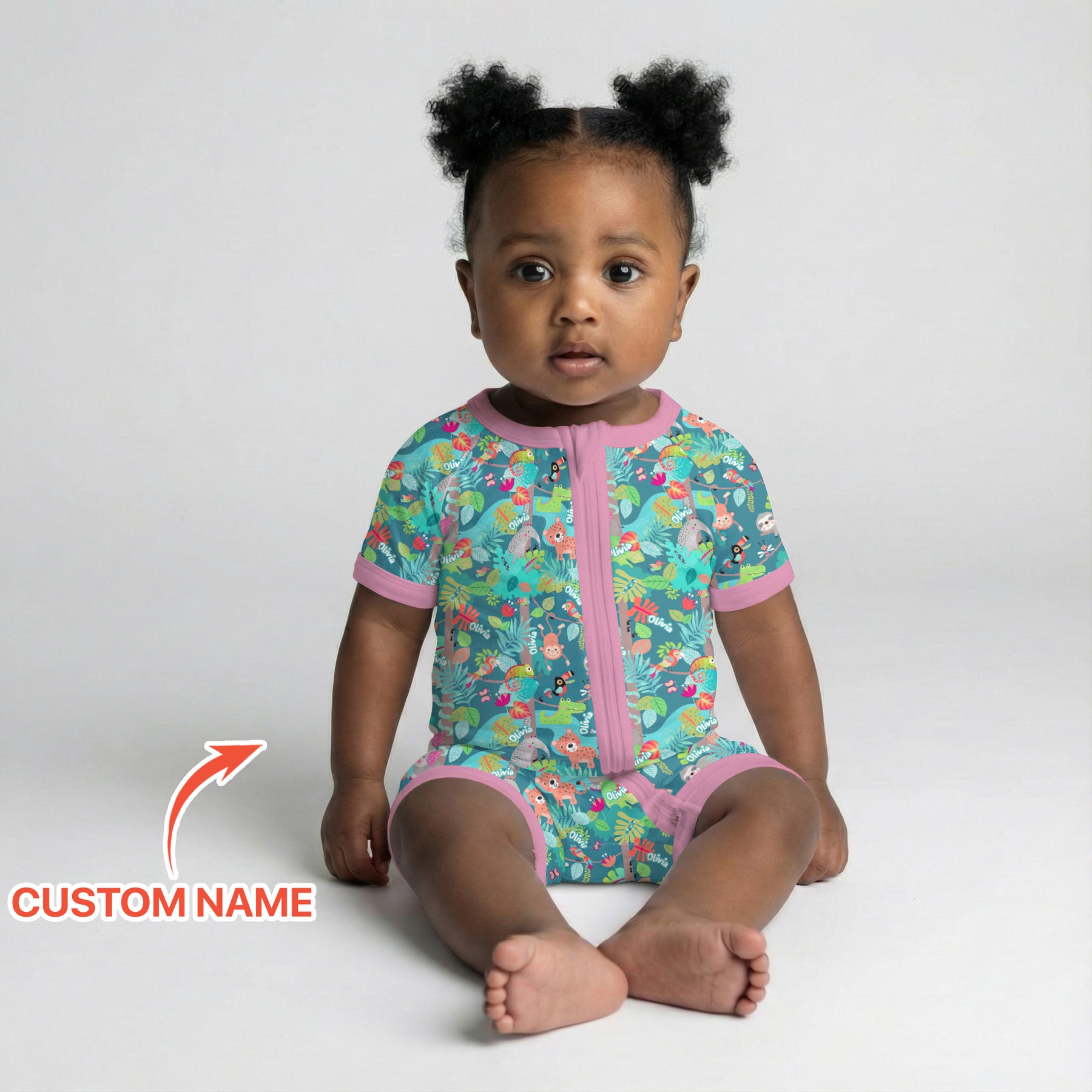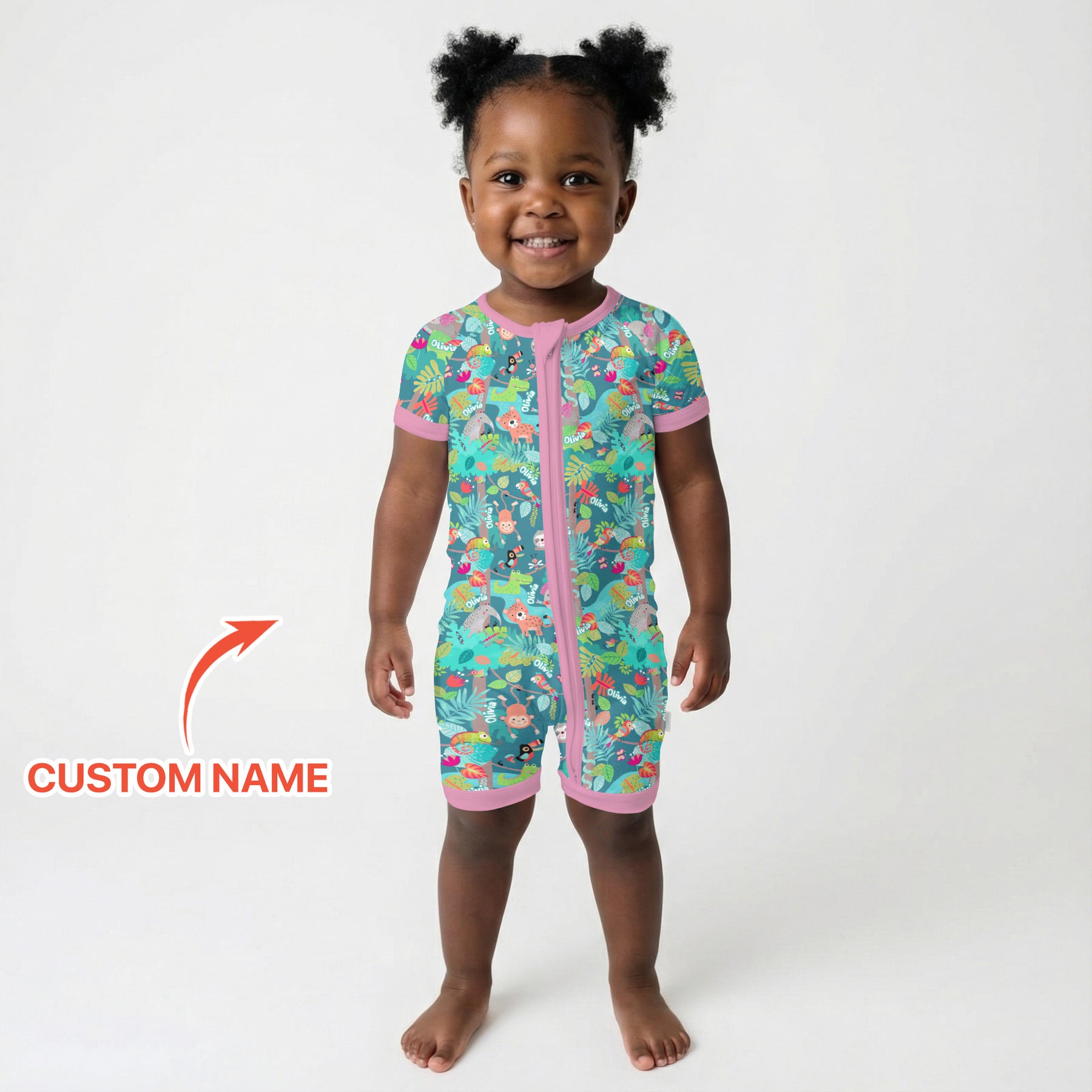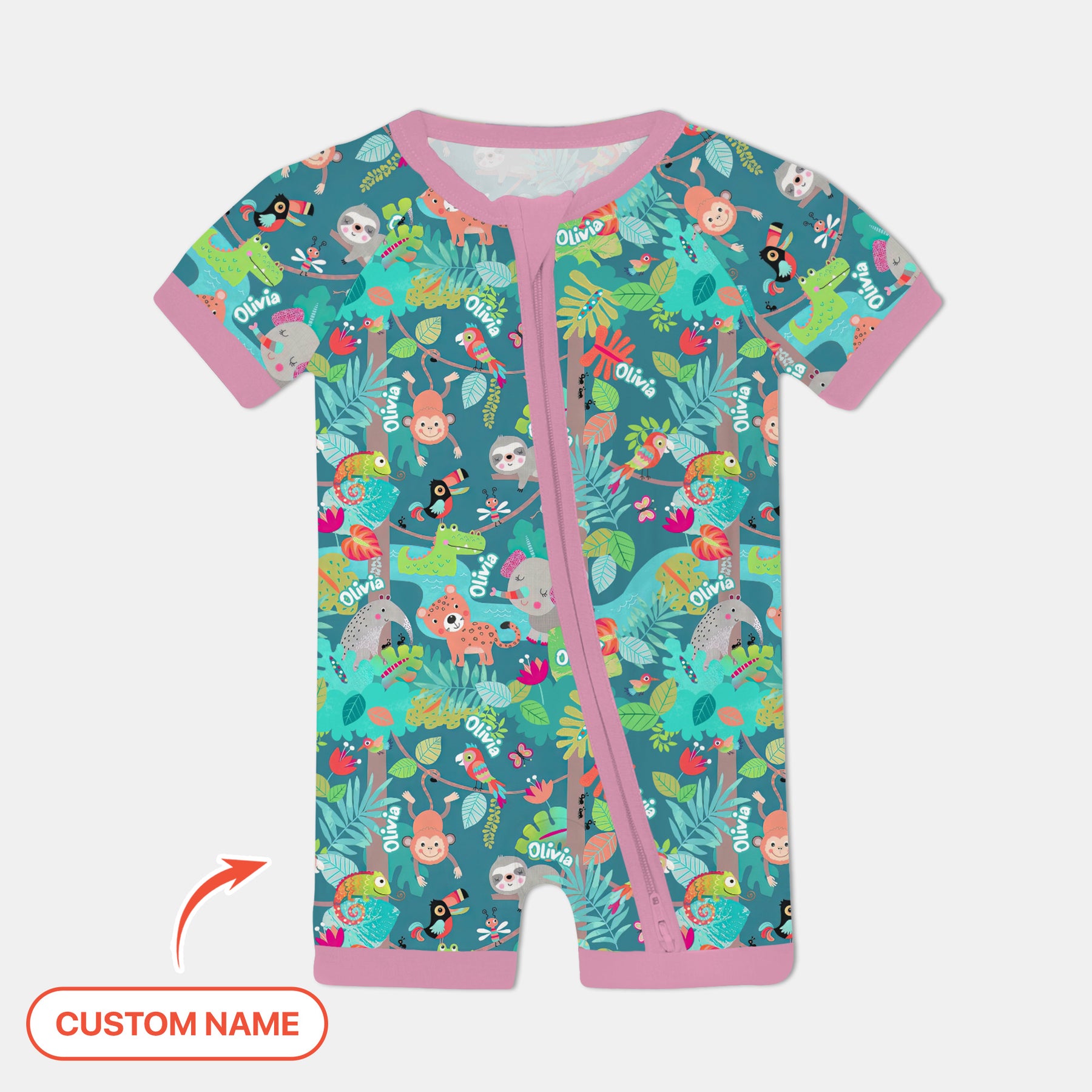 Let your little one drift into dreamland with the Jungle Buddy Adventure pajama set, where playful jungle friends and bright, cheerful colors turn bedtime into a fun exploration. Featuring adorable animals, lush tropical details, and your child’s custom name printed throughout, this set feels truly personal and extra special.
